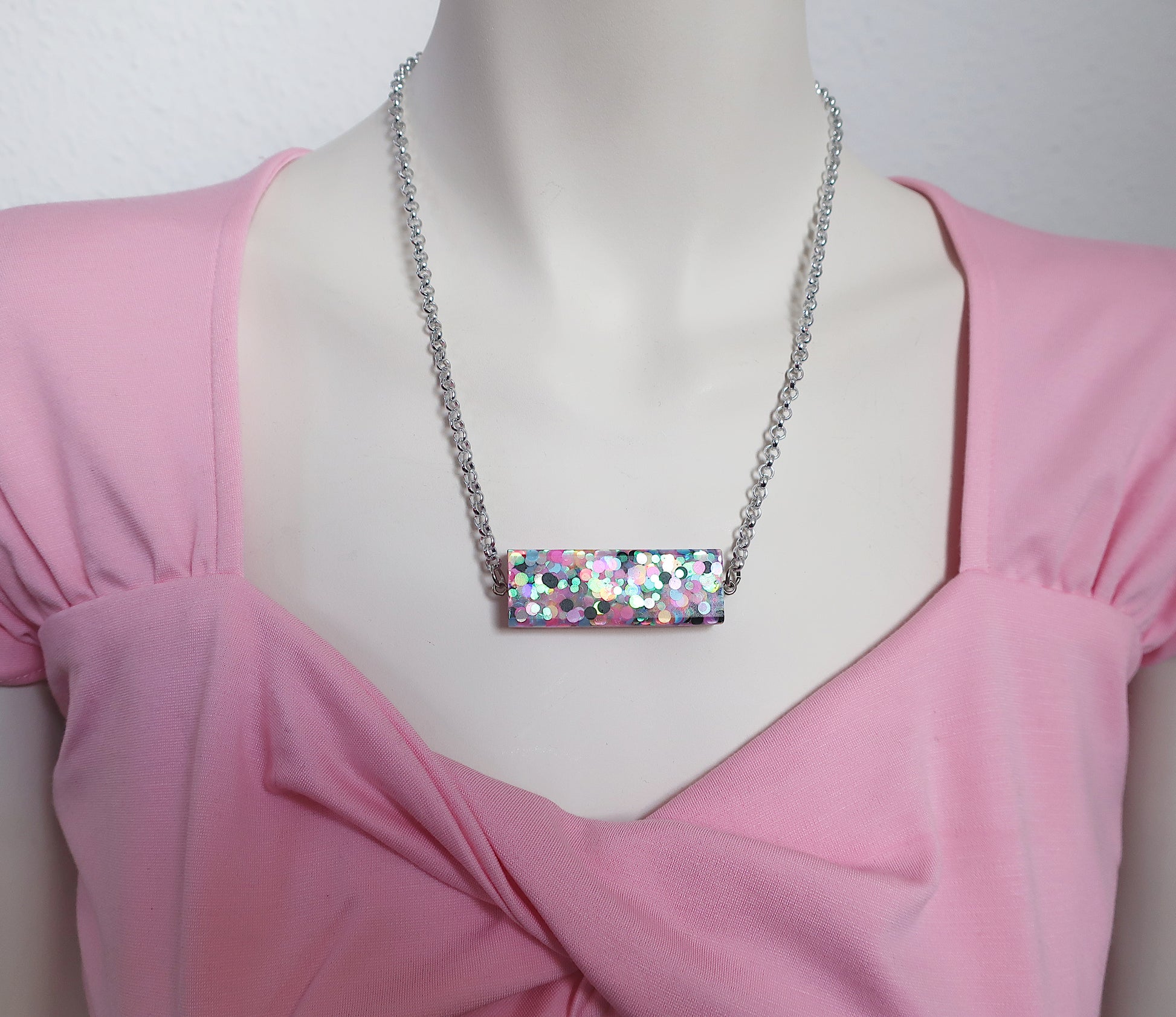 Kette mit Block aus Epoxidharz mit Glitzer an einer silberfarbenen Erbskette. Der Harzblock ist ca. 5 cm breit. Samt Karabinerhaken und Verschluss ist die Kette ungefähr 99,5 cm lang.