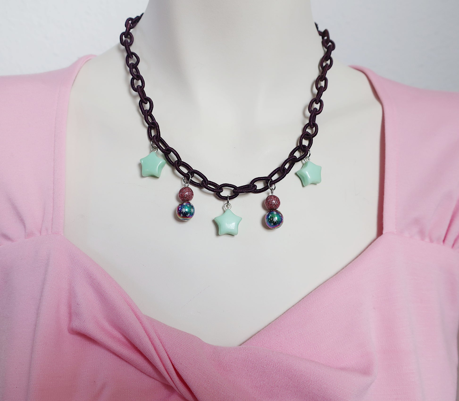 Kette mit Sternenanhängern aus Glas und Anhängern mit Glas-und Acrylperlen. Die Sterne sind ungefähr 1,5 cm groß.