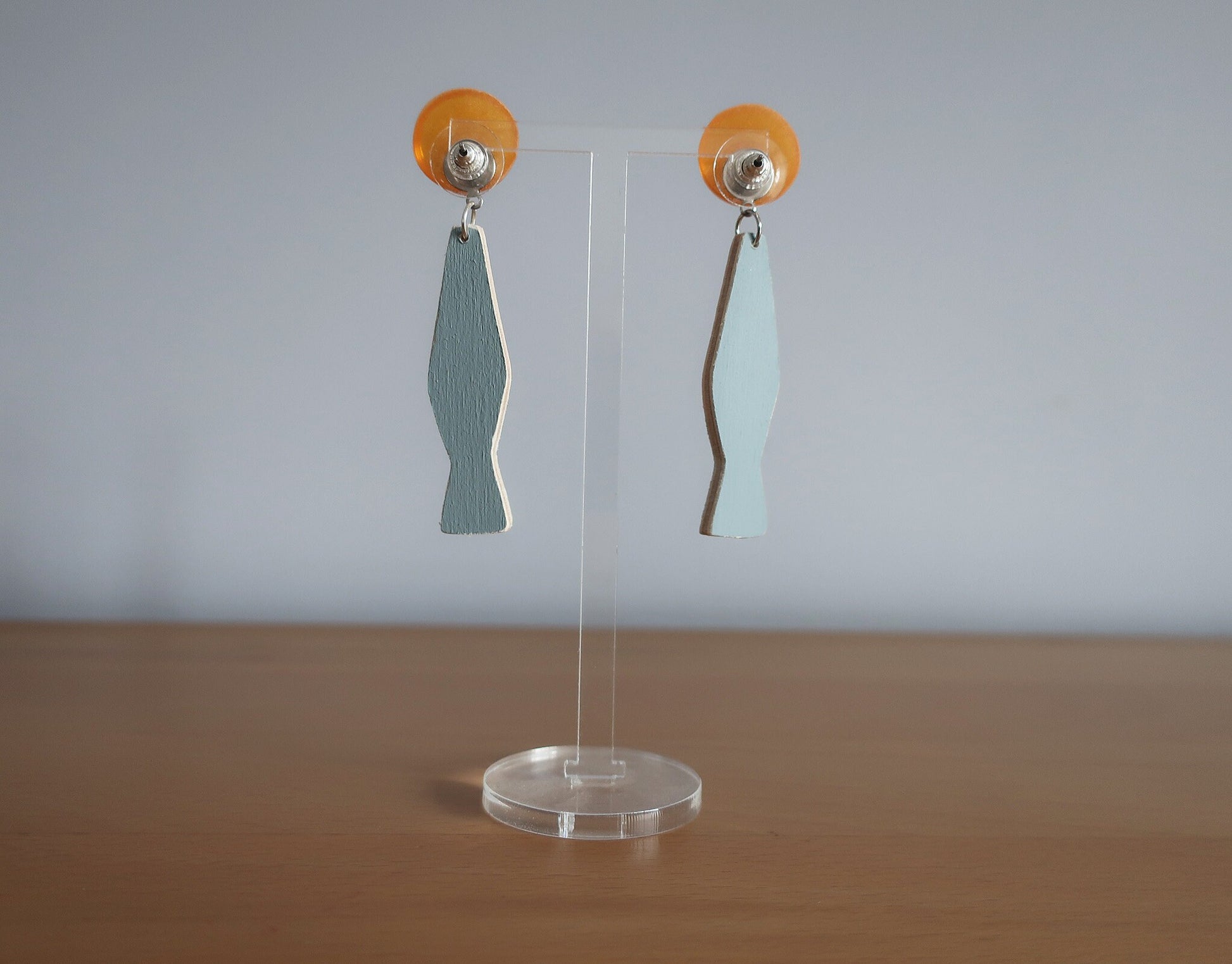 Für diese Ohrringe habe ich eine Zeichnung am Computer erstellt, die ich anschließend manuell auf Birkenholz übertragen und dann mit einer Dekupiersäge ausgesägt habe. Um die Haltbarkeit zu verbessern wurde eine Schicht matter Lack aufgetragen.