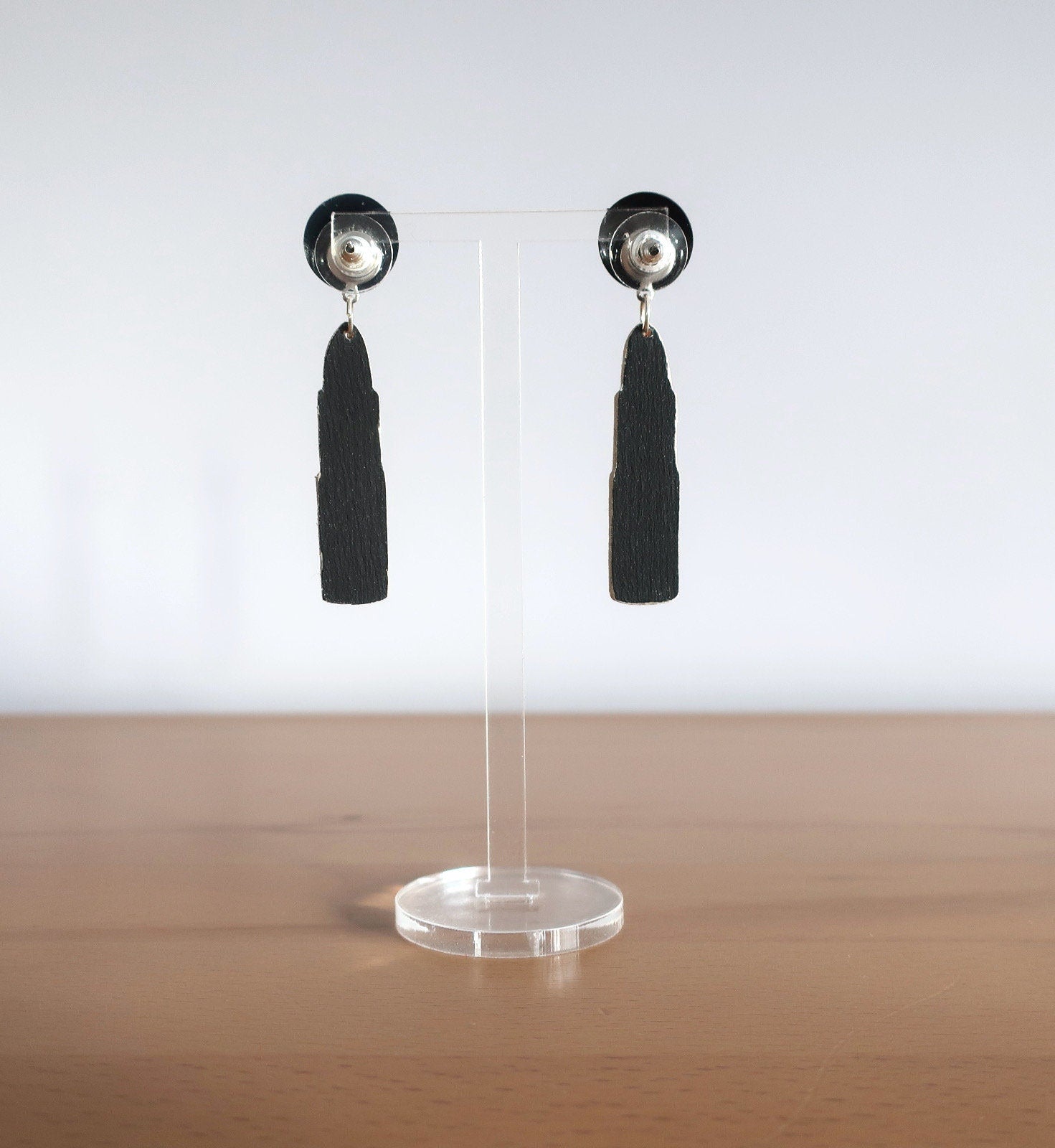 Für diese Ohrringe habe ich eine Zeichnung am Computer erstellt, die ich anschließend manuell auf Birkenholz übertragen und dann mit einer Dekupiersäge ausgesägt habe. Um die Haltbarkeit zu verbessern wurde eine Schicht matter Lack aufgetragen.