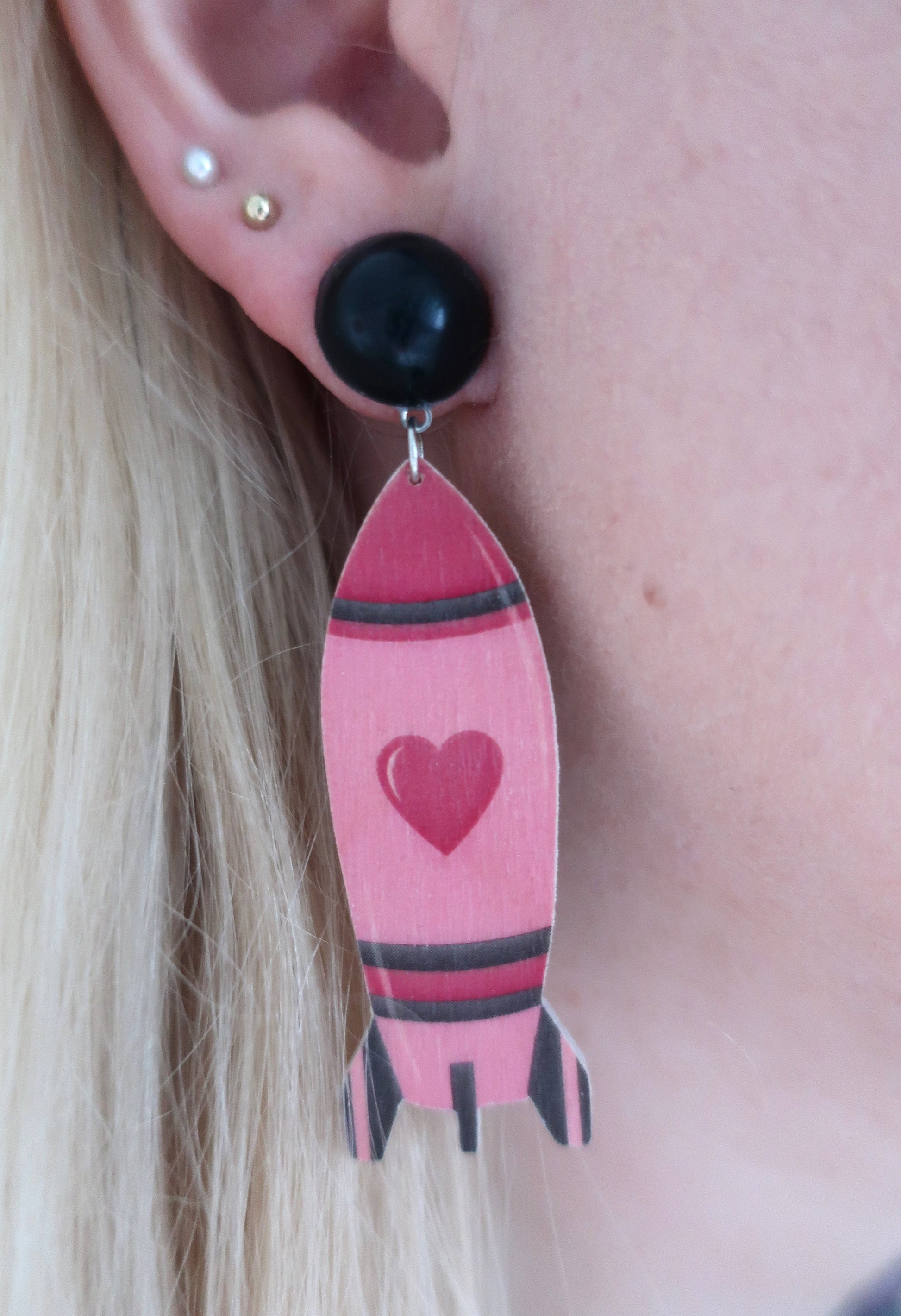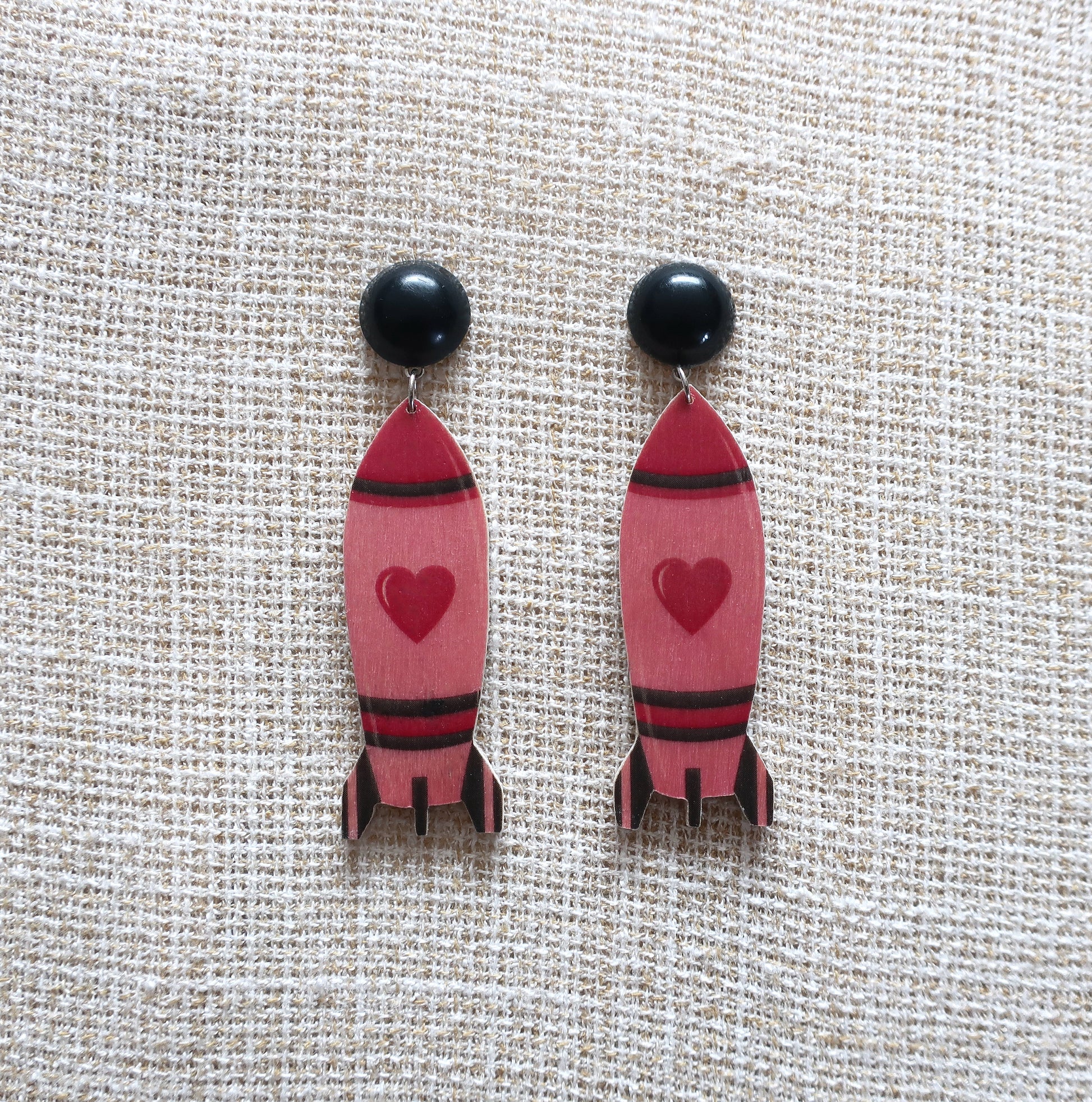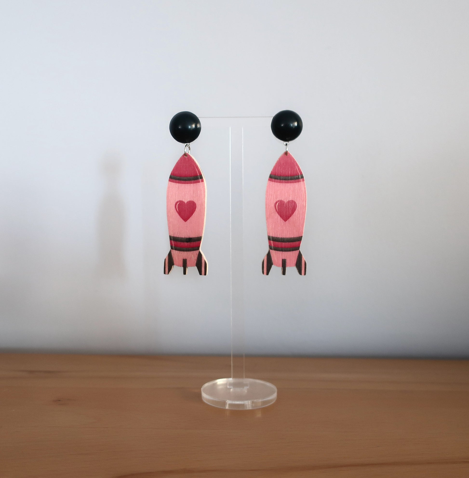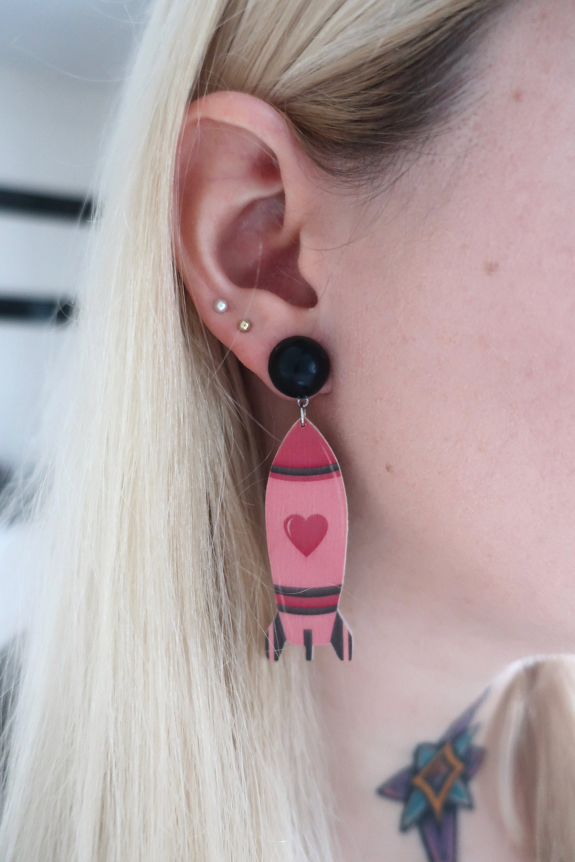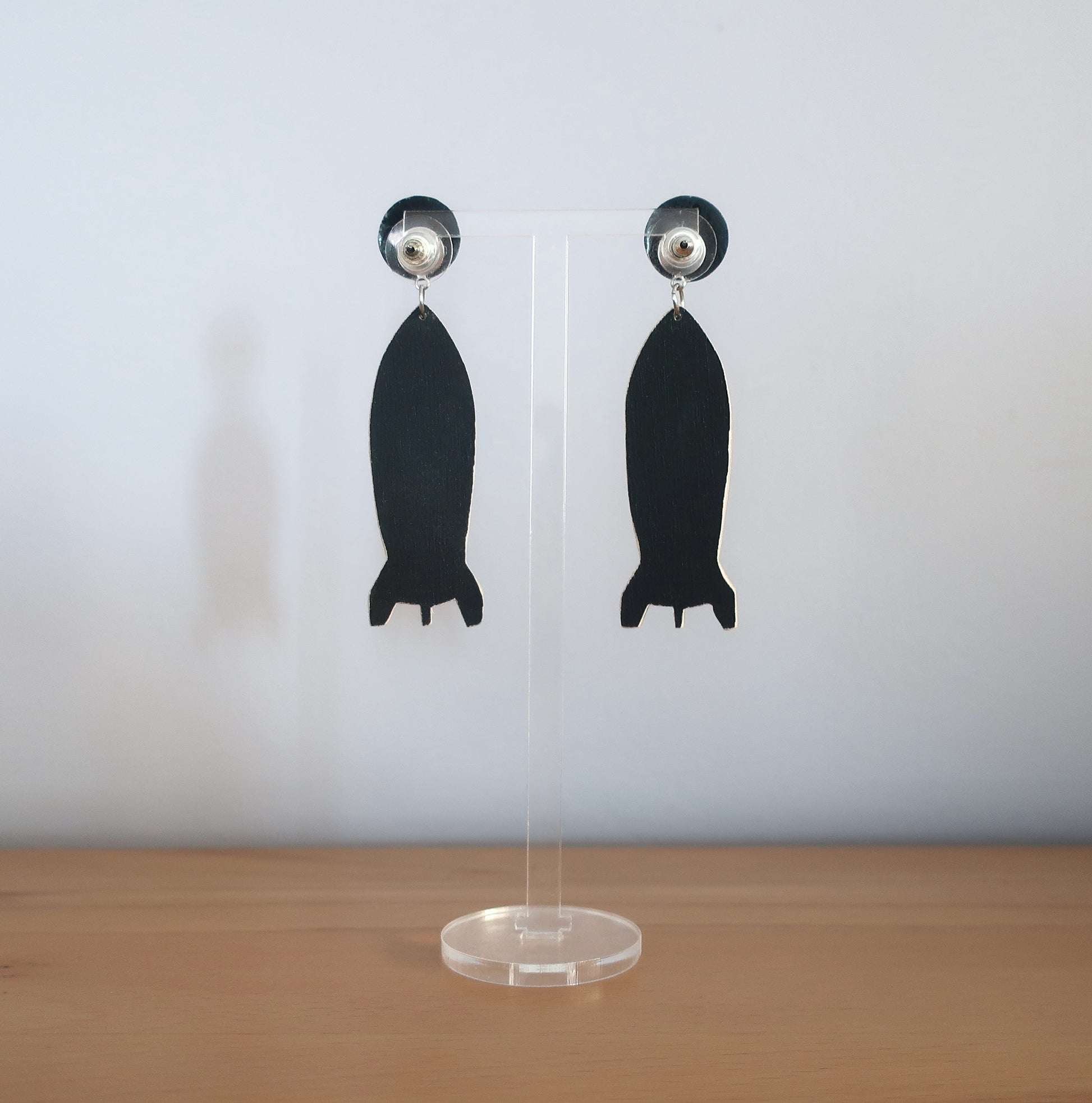 Für diese Ohrringe habe ich eine Zeichnung am Computer erstellt, die ich anschließend manuell auf Birkenholz übertragen und dann mit einer Dekupiersäge ausgesägt habe. Um die Haltbarkeit zu verbessern wurde eine Schicht matter Lack aufgetragen.