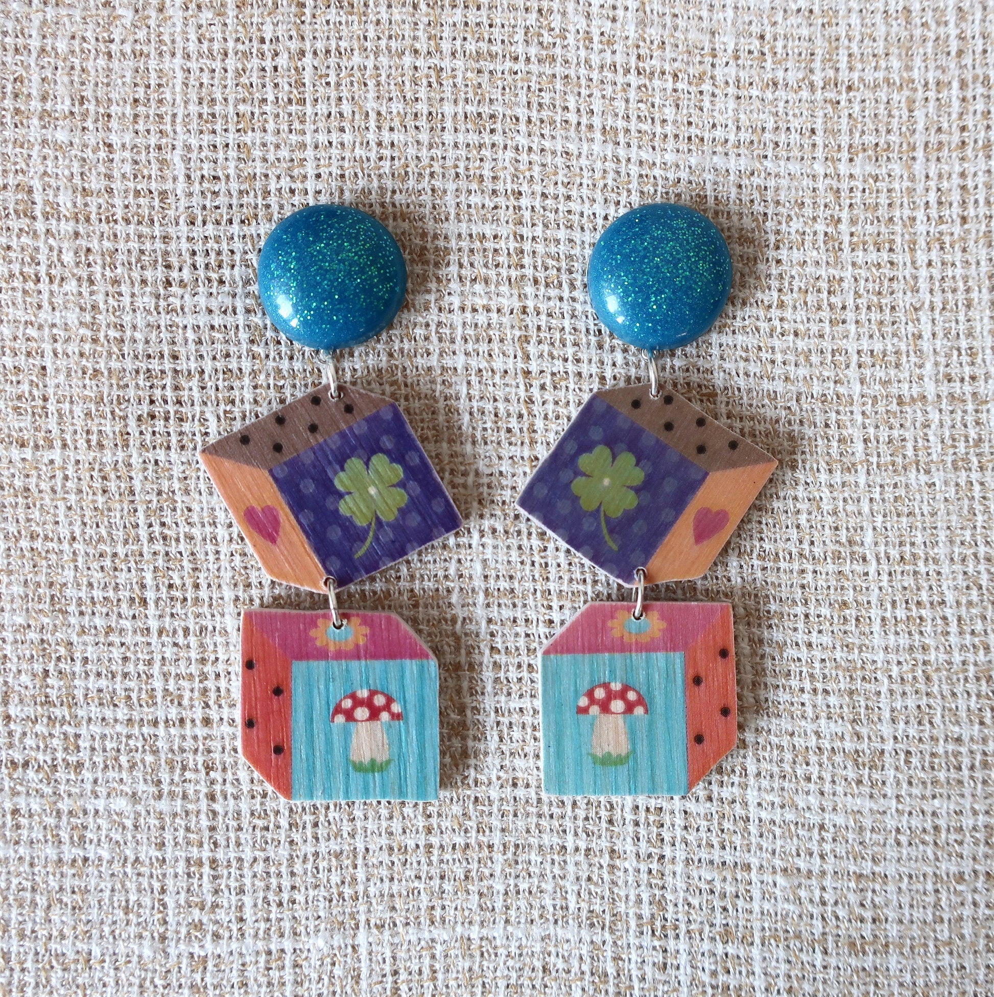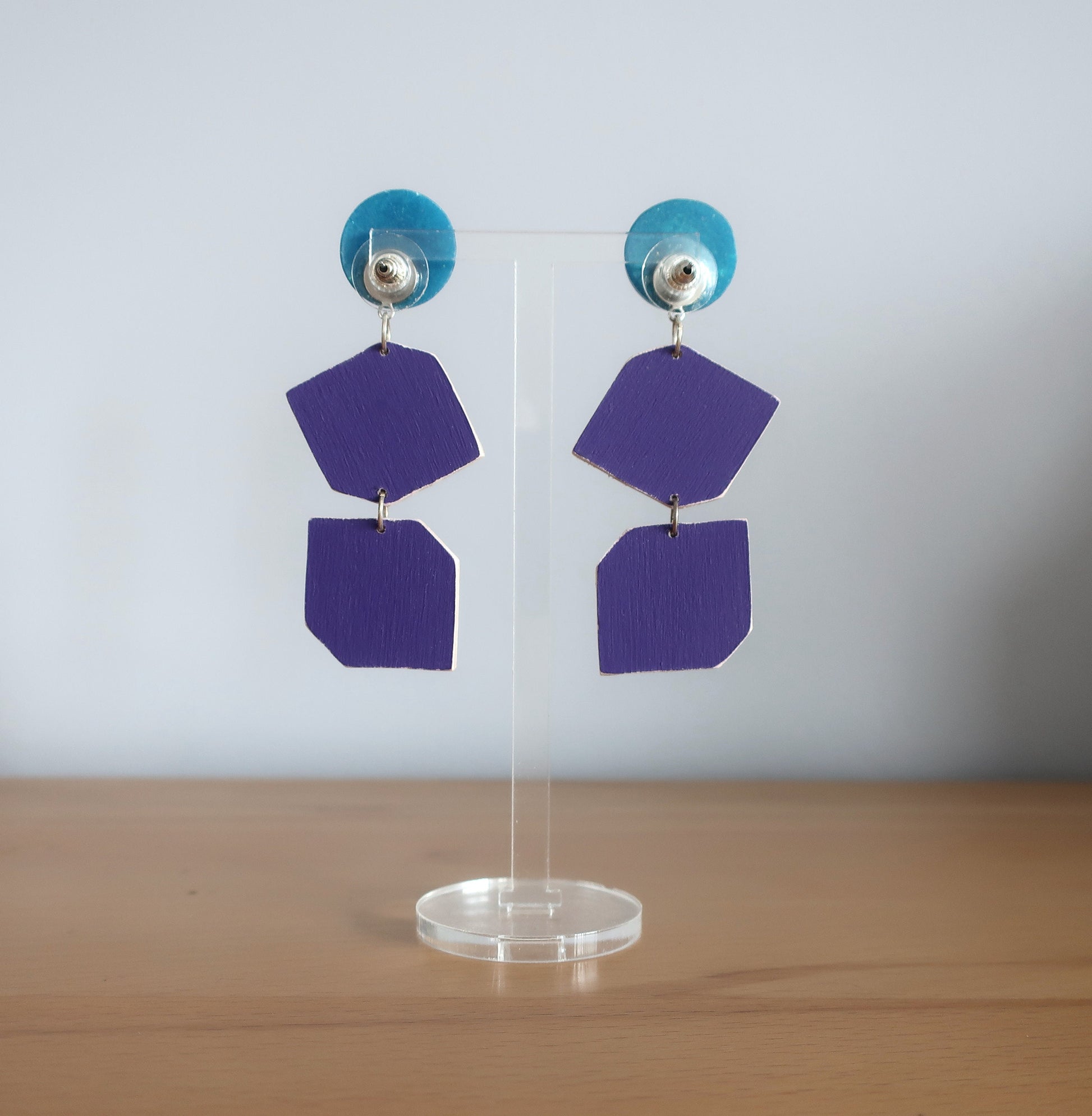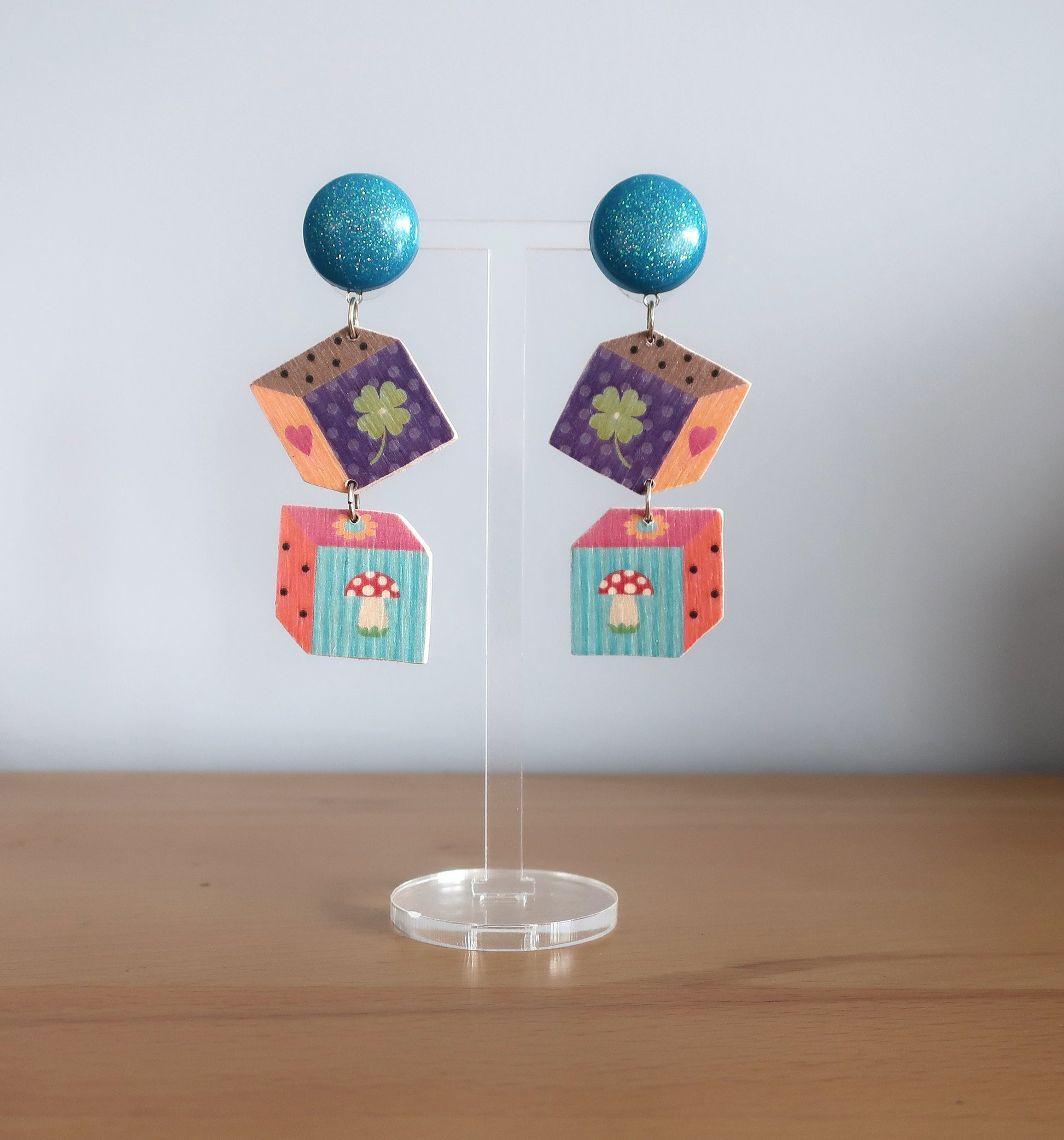 Für diese Ohrringe habe ich eine Zeichnung am Computer erstellt, die ich anschließend manuell auf Birkenholz übertragen und dann mit einer Dekupiersäge ausgesägt habe. Um die Haltbarkeit zu verbessern wurde eine Schicht matter Lack aufgetragen.