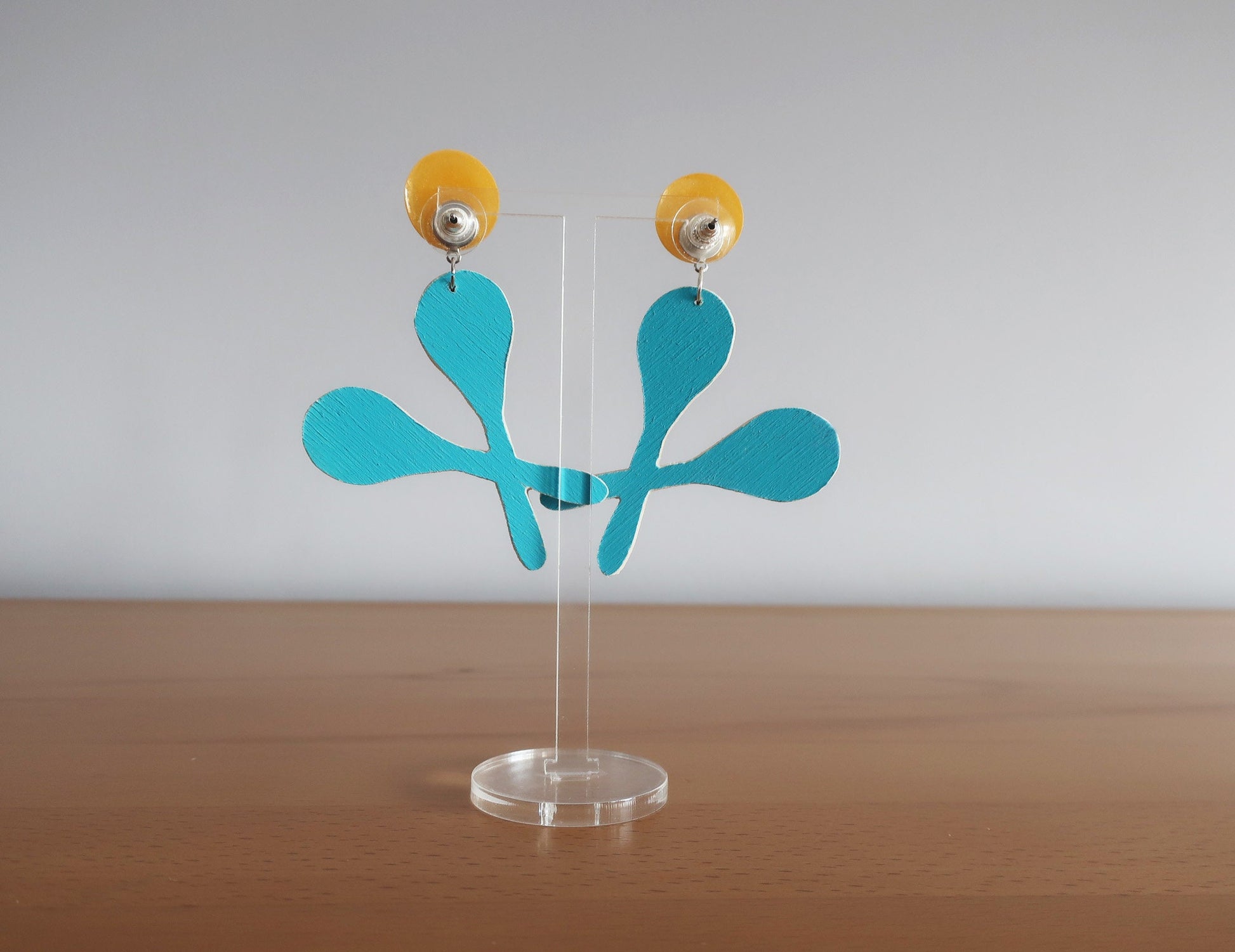Für diese Ohrringe habe ich eine Zeichnung am Computer erstellt, die ich anschließend manuell auf Birkenholz übertragen und dann mit einer Dekupiersäge ausgesägt habe. Um die Haltbarkeit zu verbessern wurde eine Schicht matter Lack aufgetragen.