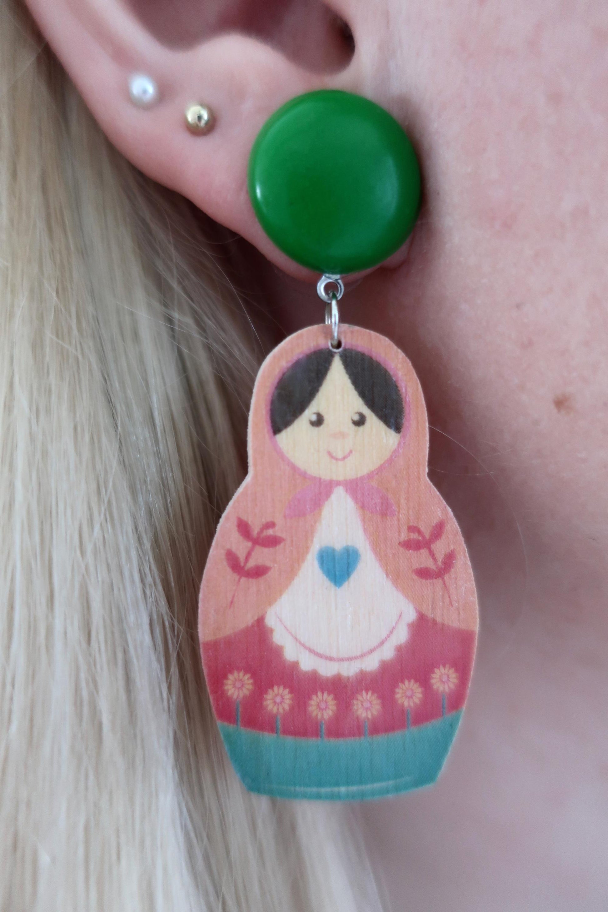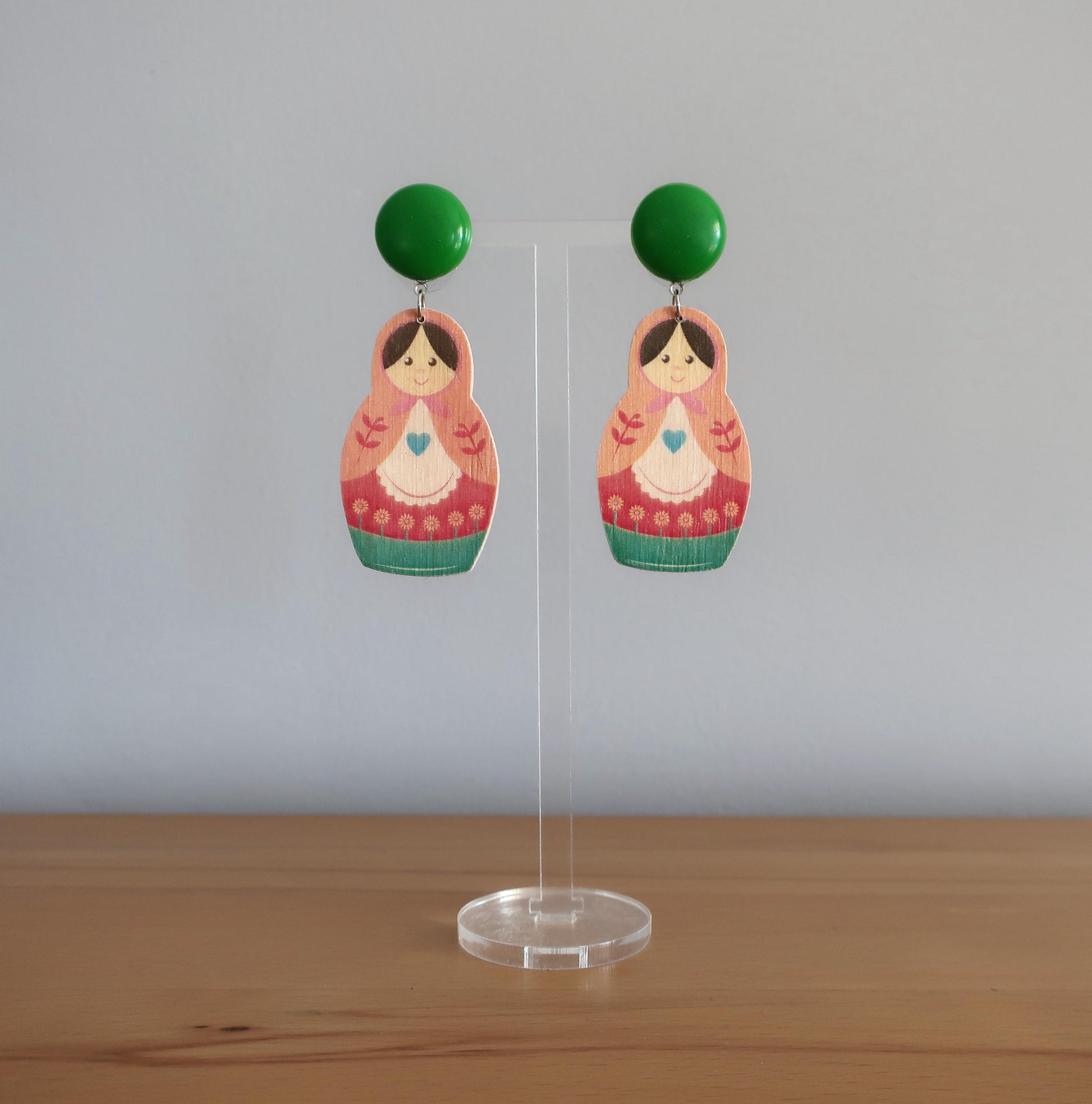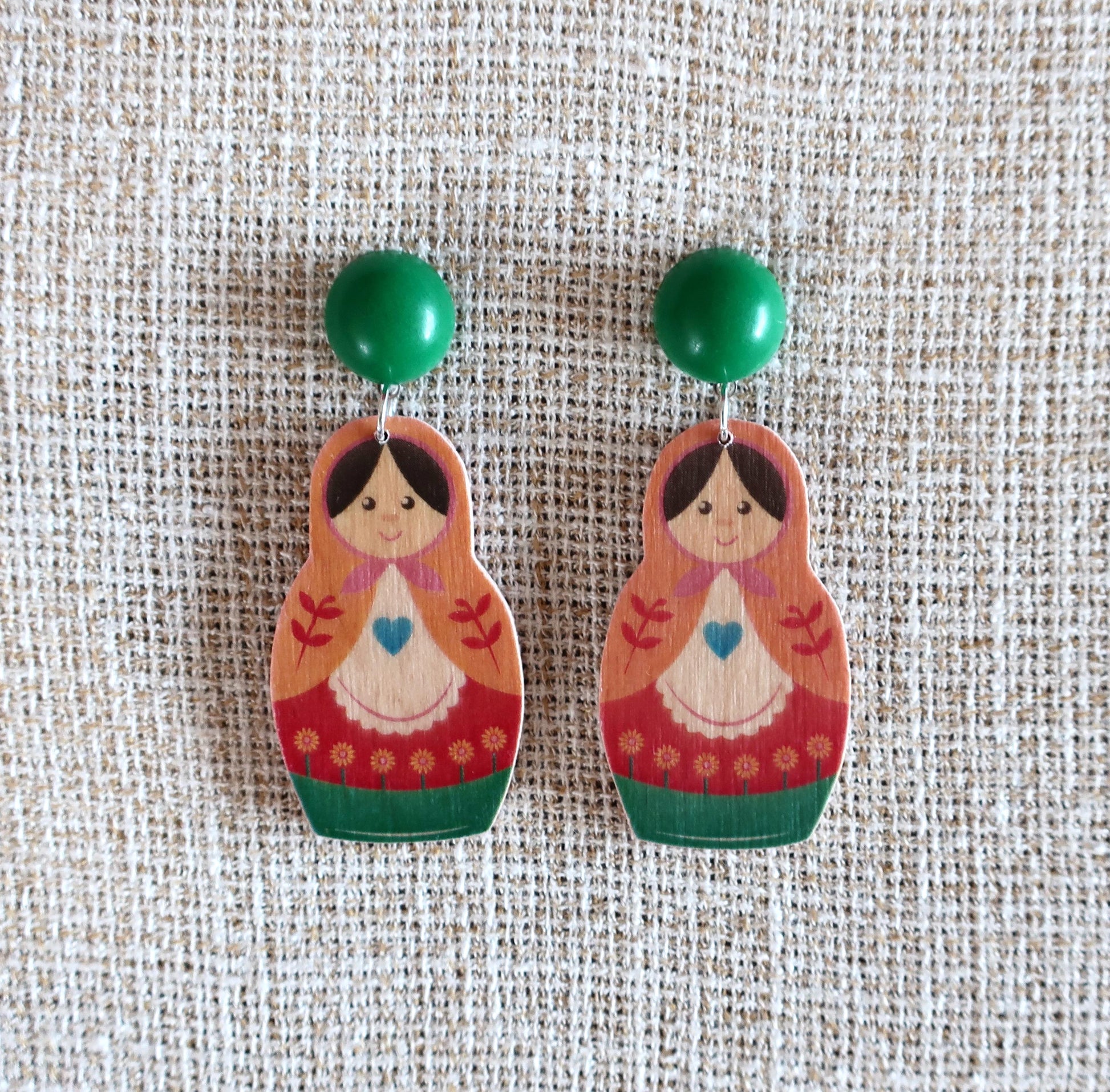 Für diese Ohrringe habe ich eine Zeichnung am Computer erstellt, die ich anschließend manuell auf Birkenholz übertragen und dann mit einer Dekupiersäge ausgesägt habe. Um die Haltbarkeit zu verbessern wurde eine Schicht matter Lack aufgetragen.