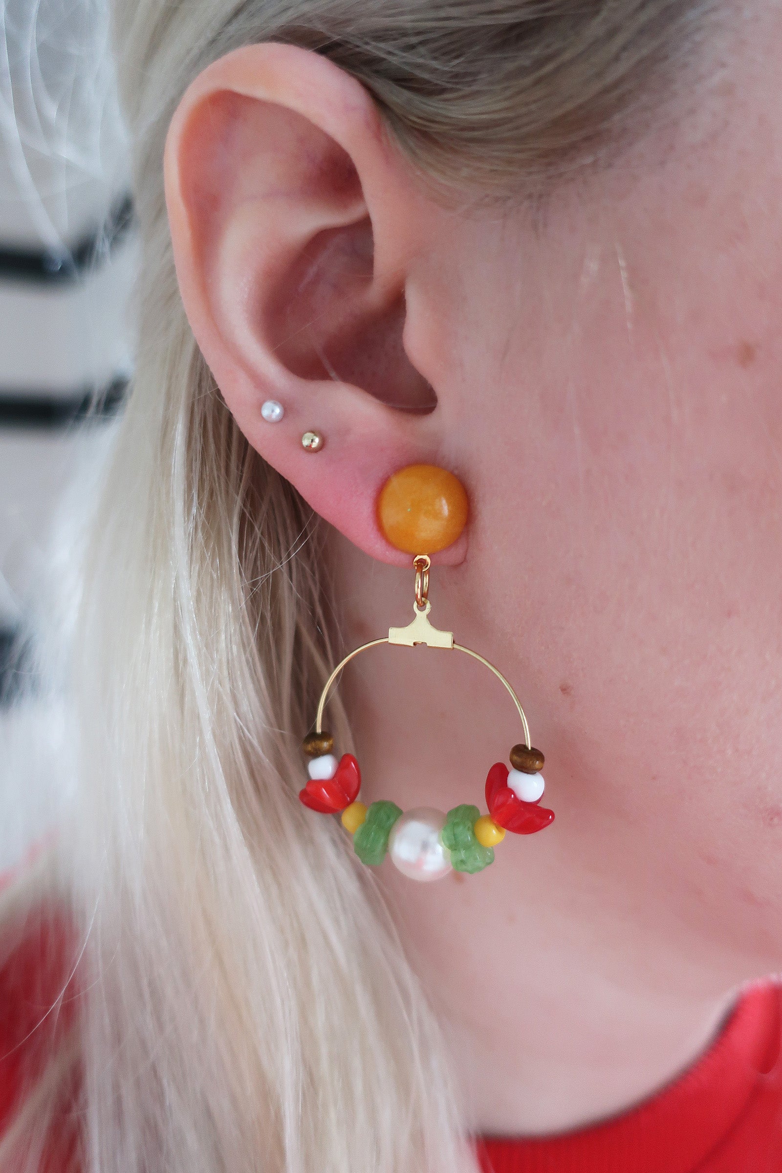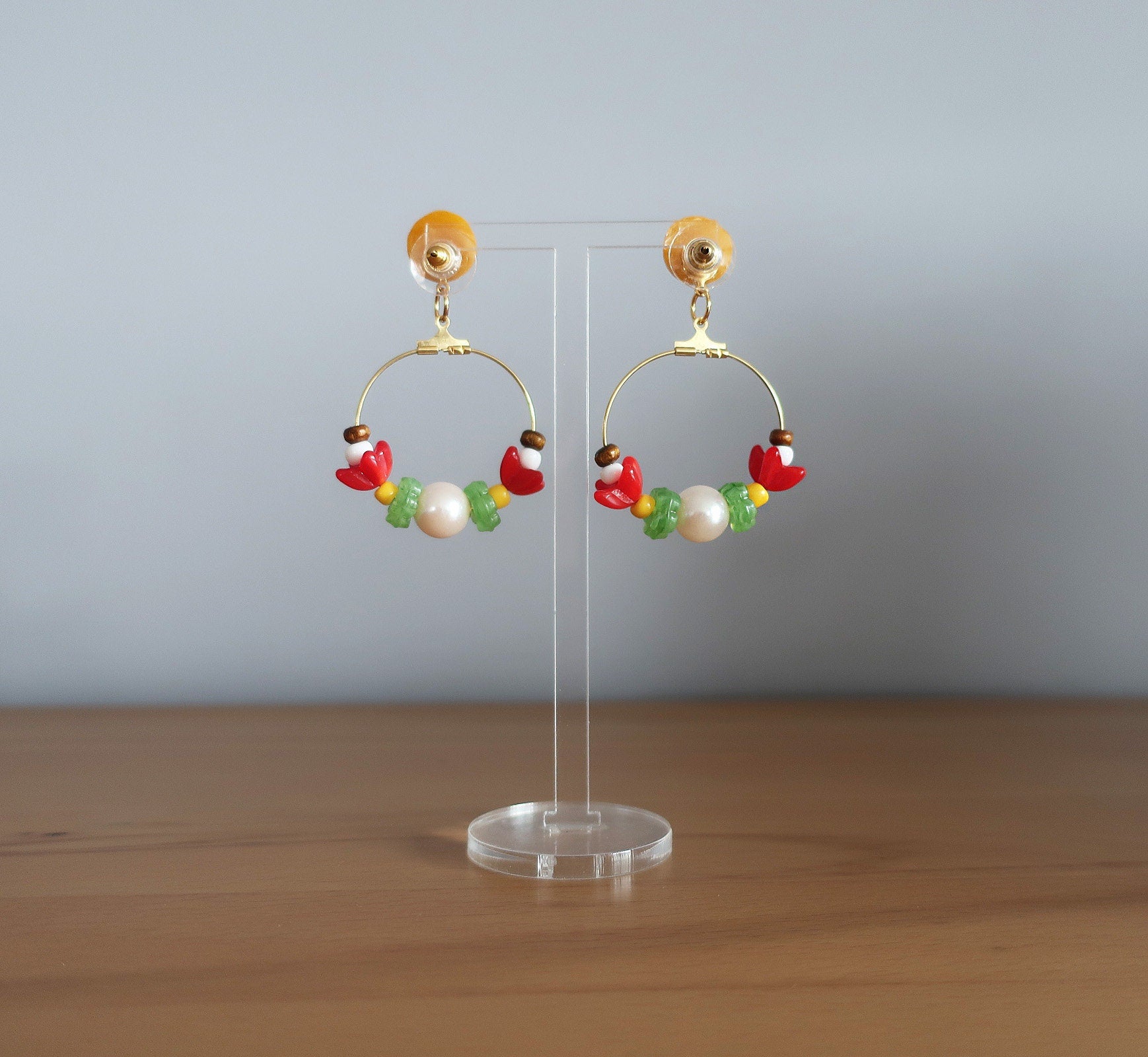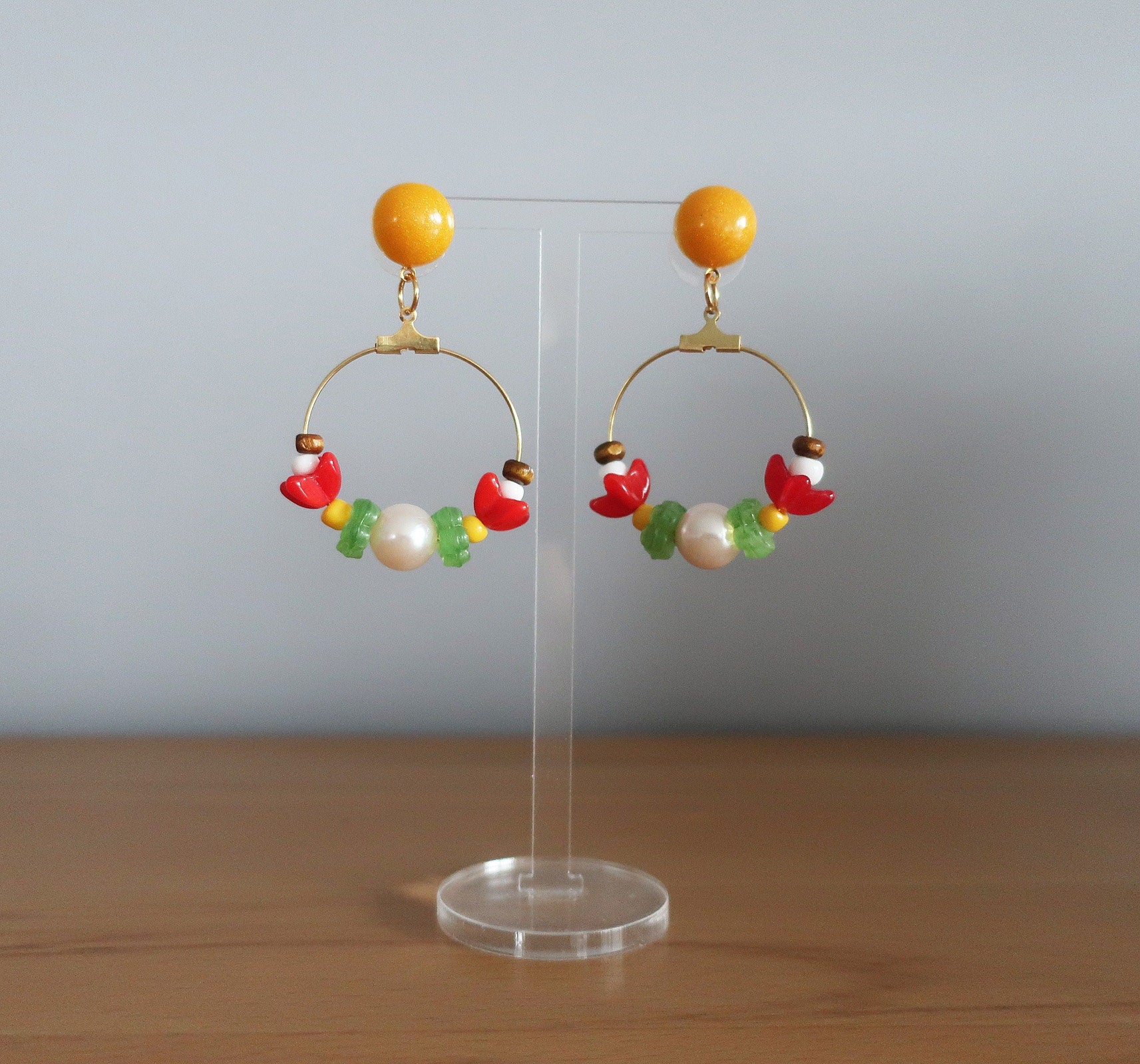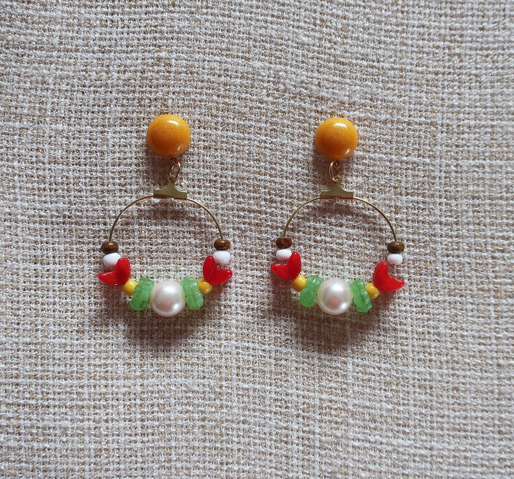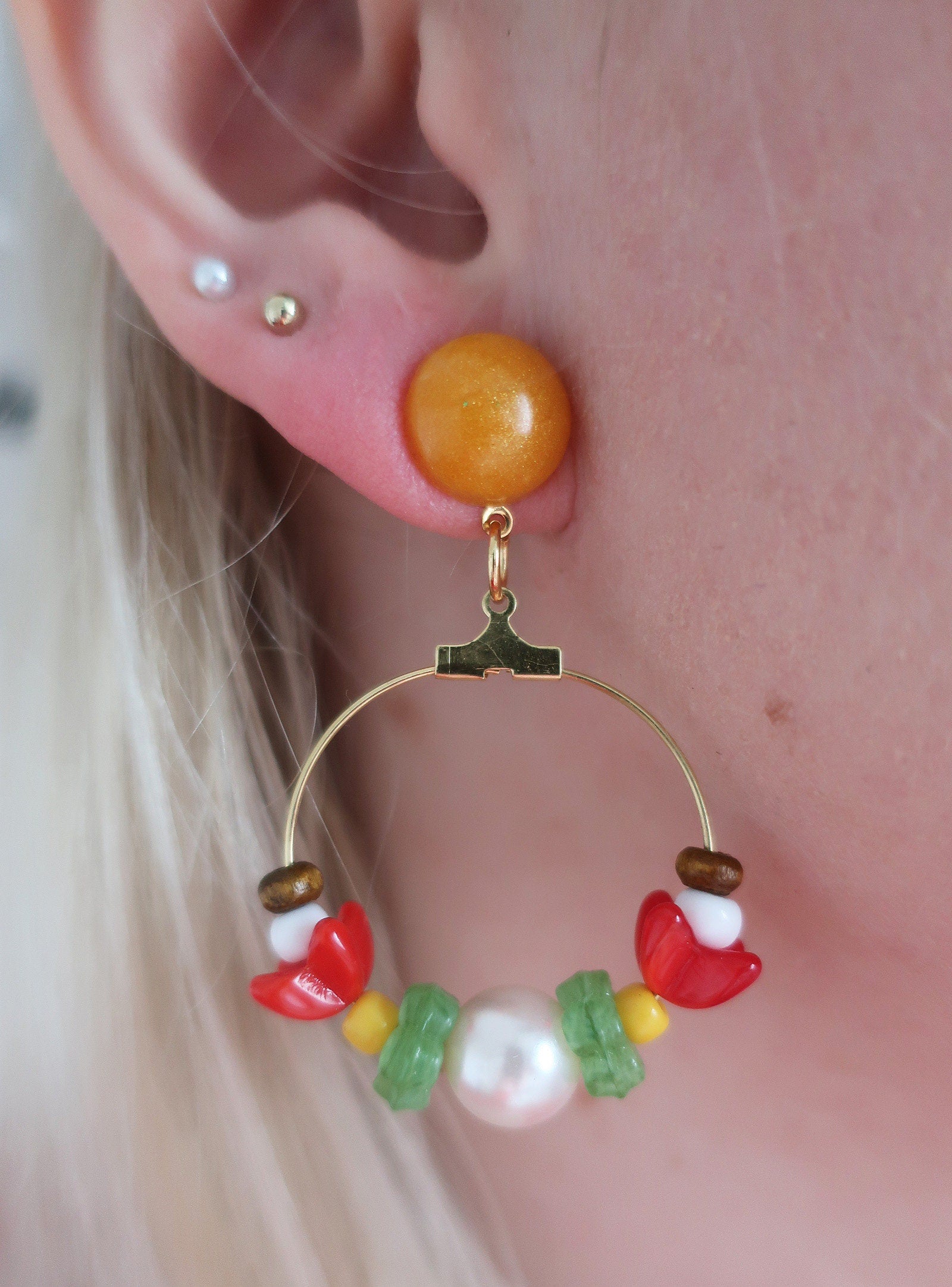 Materialien: Plastikperlen, Glasperlen, Holzperlen, Epoxidharz, goldfarbene Creolen, Messinghaken, Binderinge