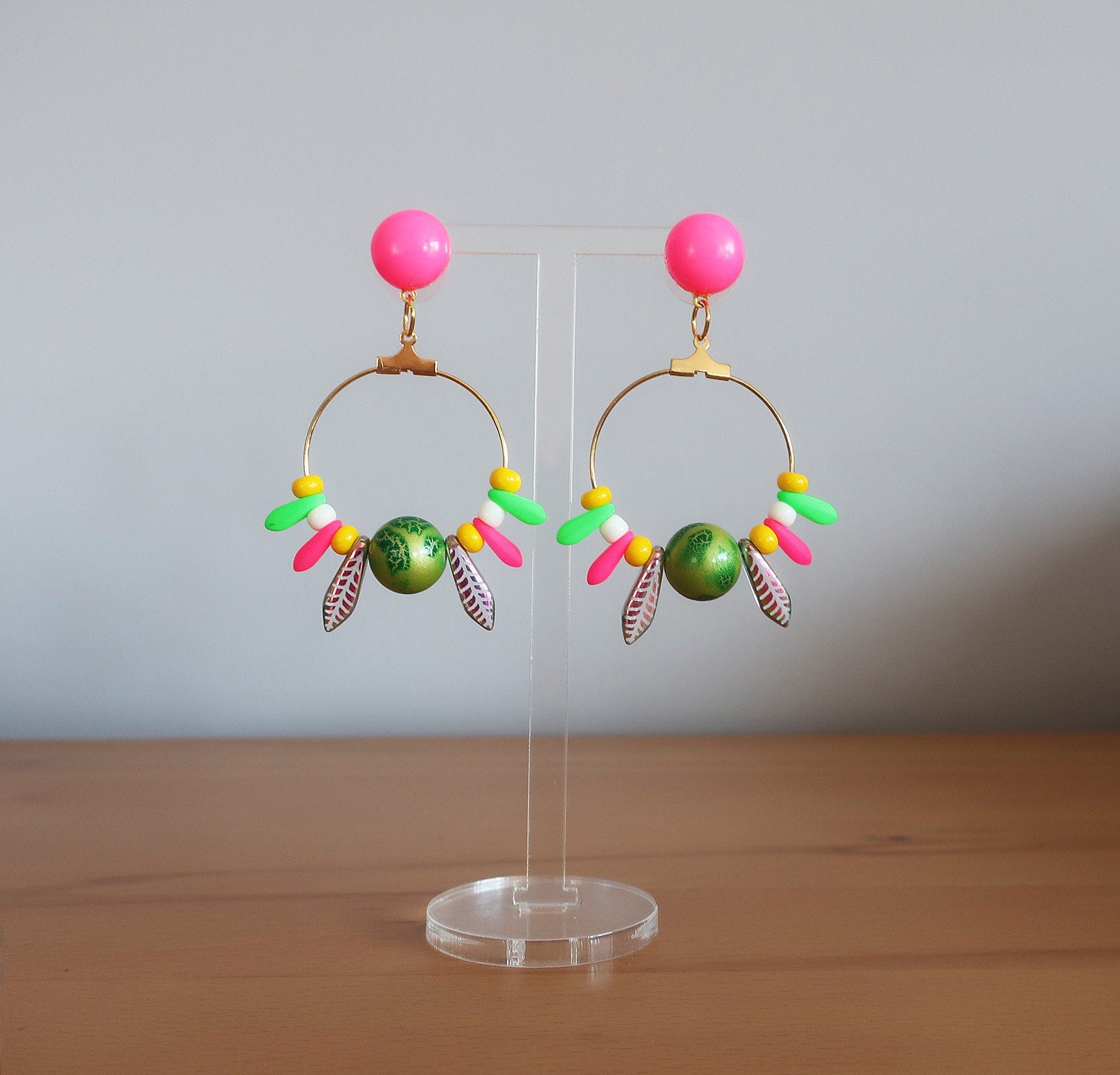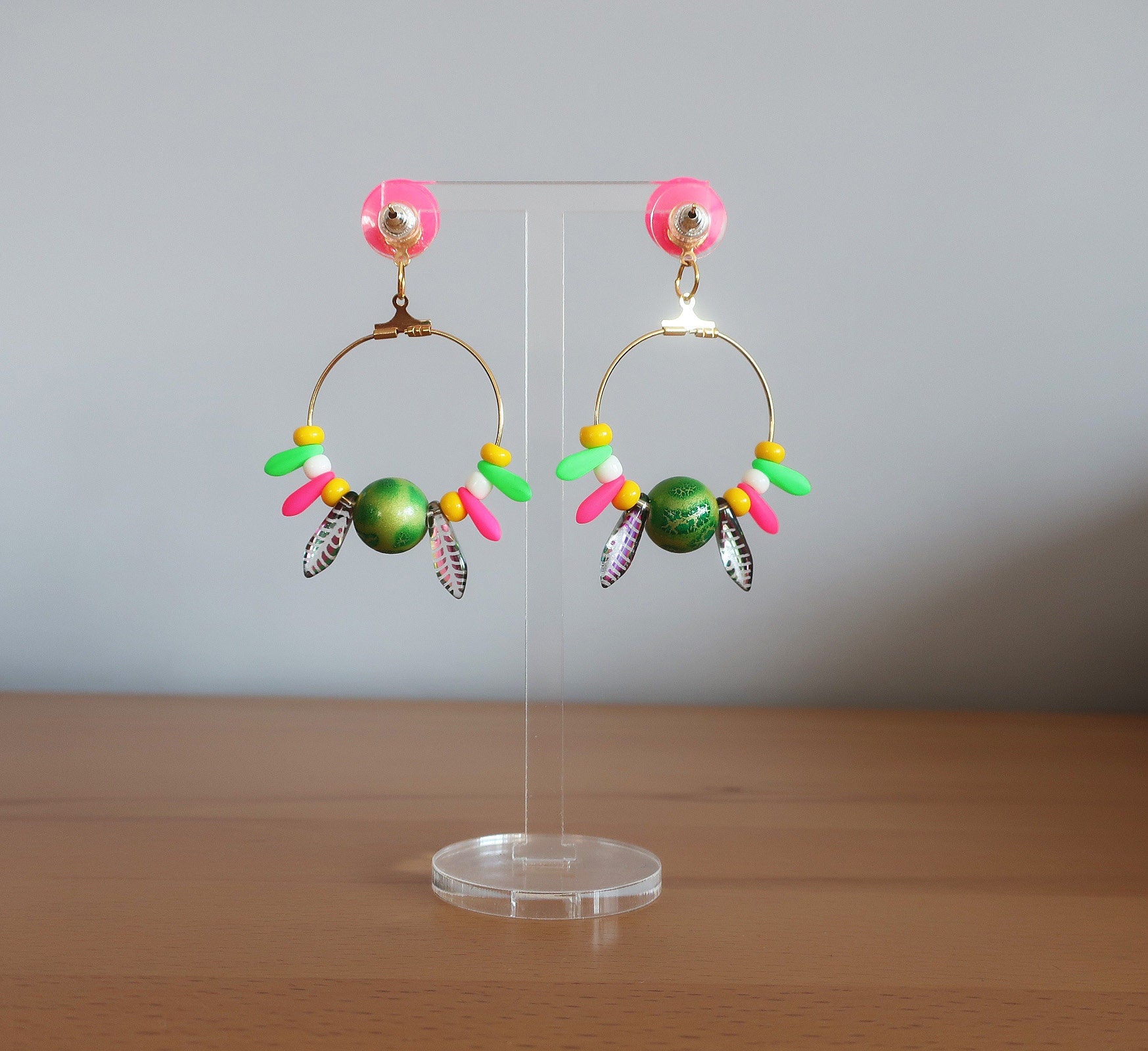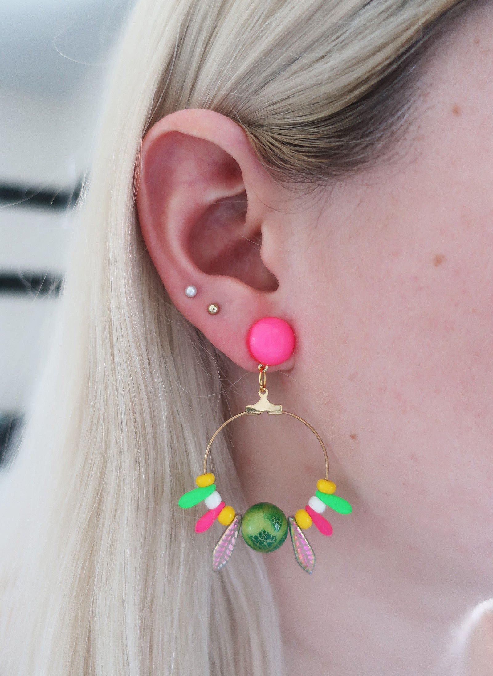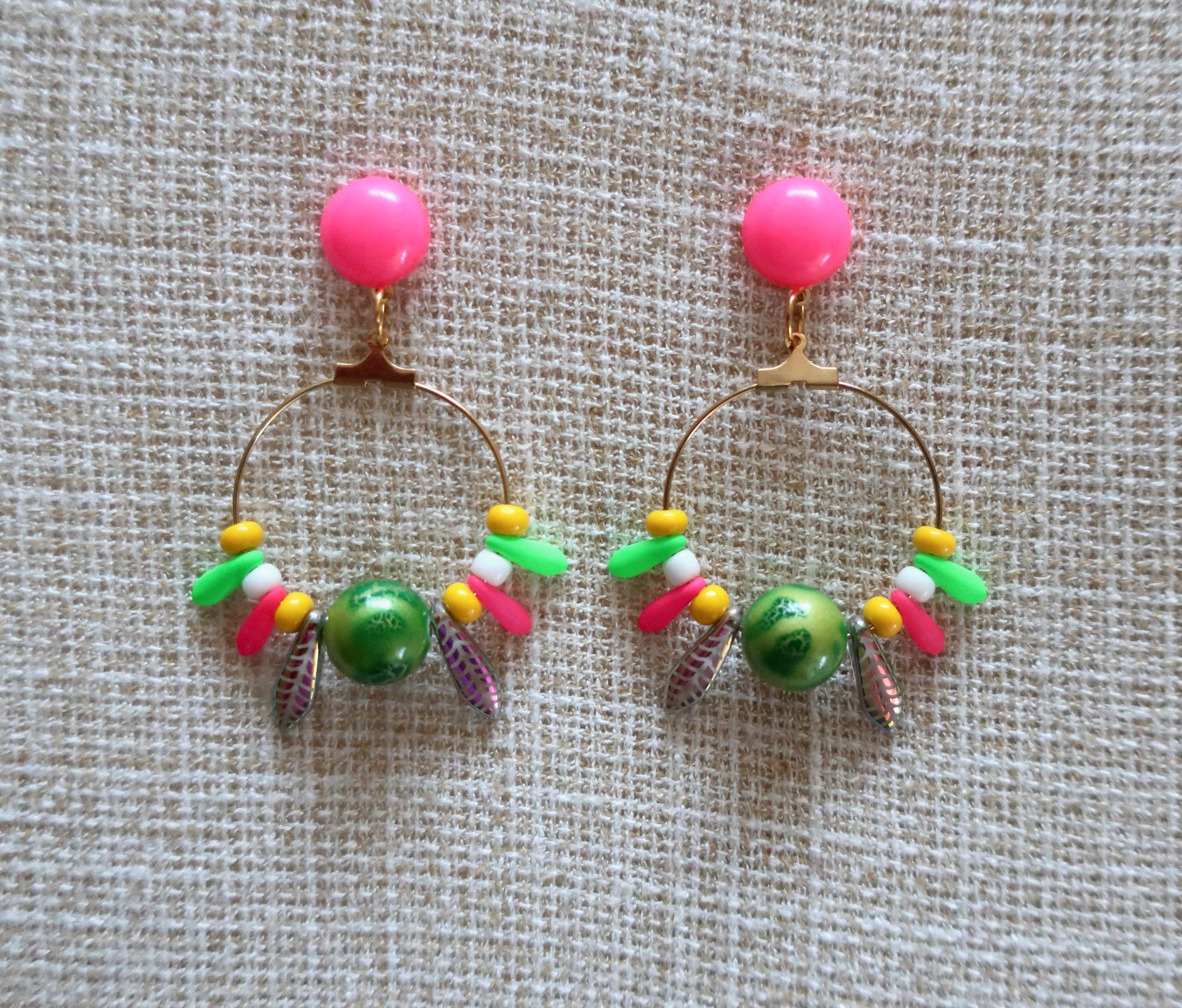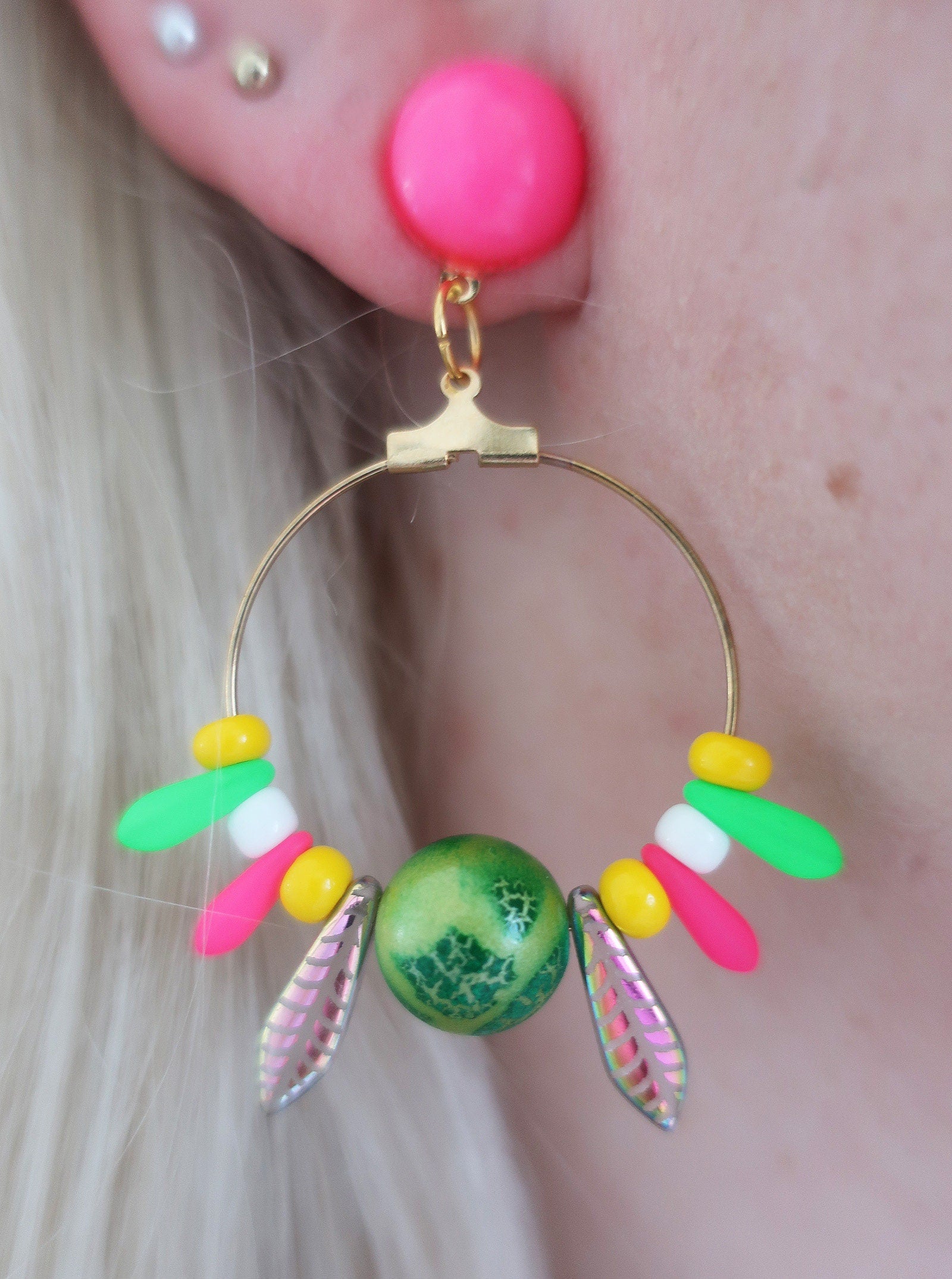 Materialien: Glasperlen, Plastikperlen, Holzperlen, Epoxidharz, goldfarbene Creolen, Messinghaken, Binderinge