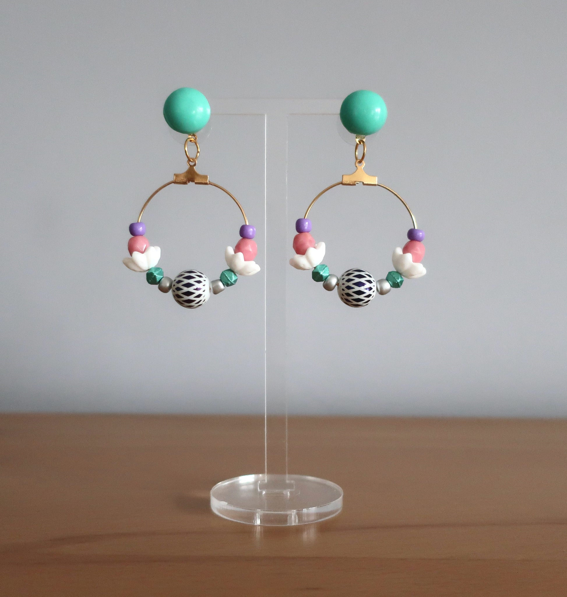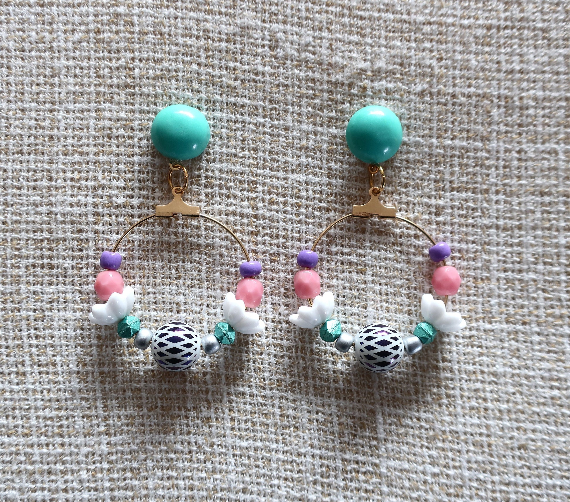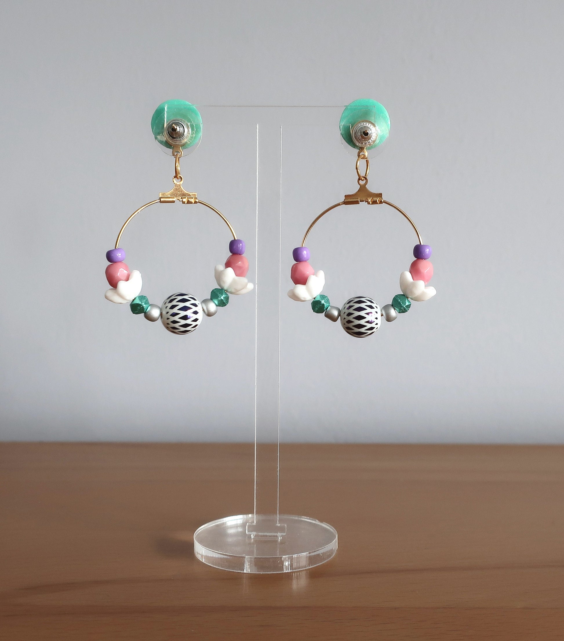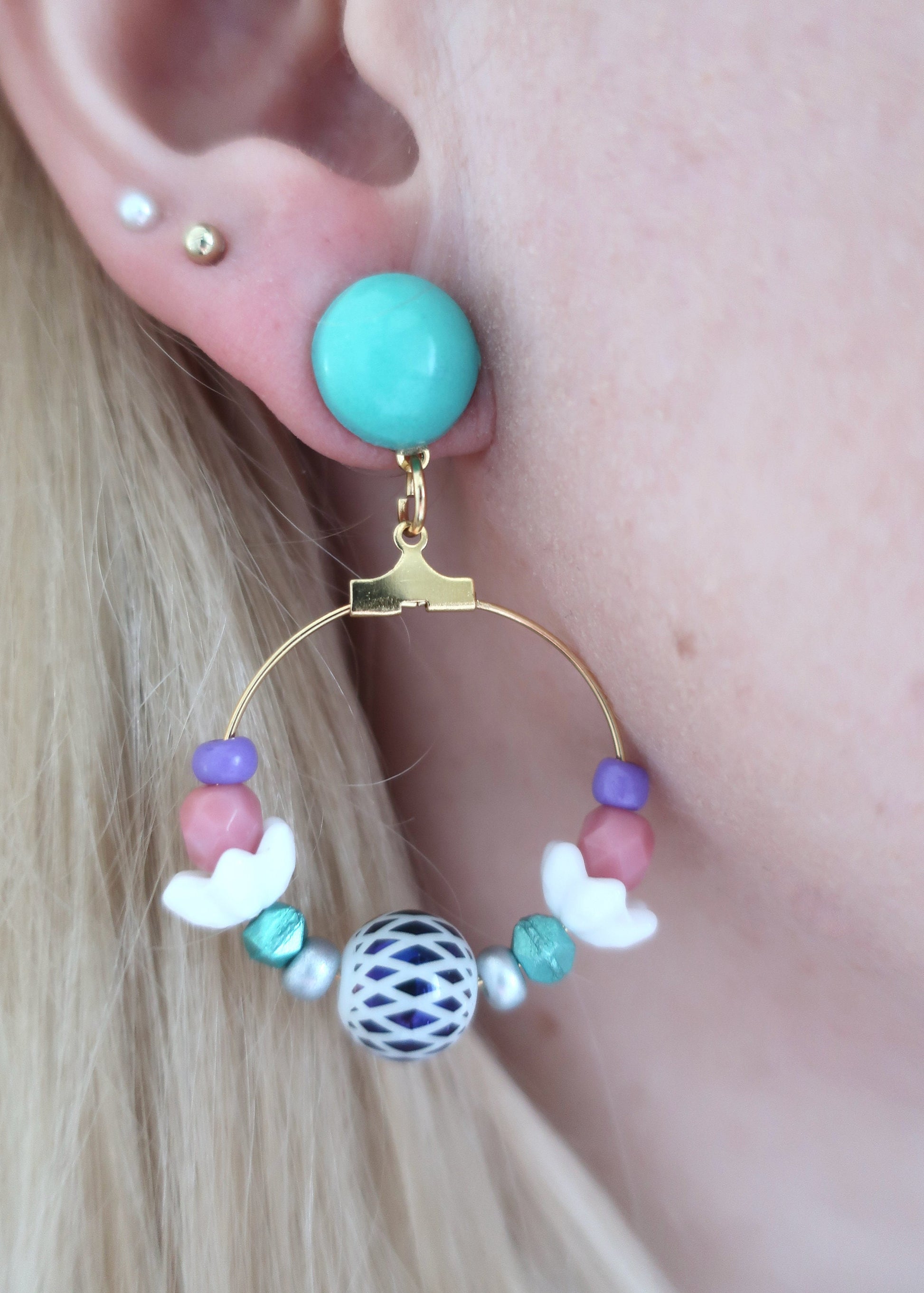 Materialien: Glasperlen, Plastikperlen, Epoxidharz, goldfarbene Creolen, Messingstecker, Binderinge