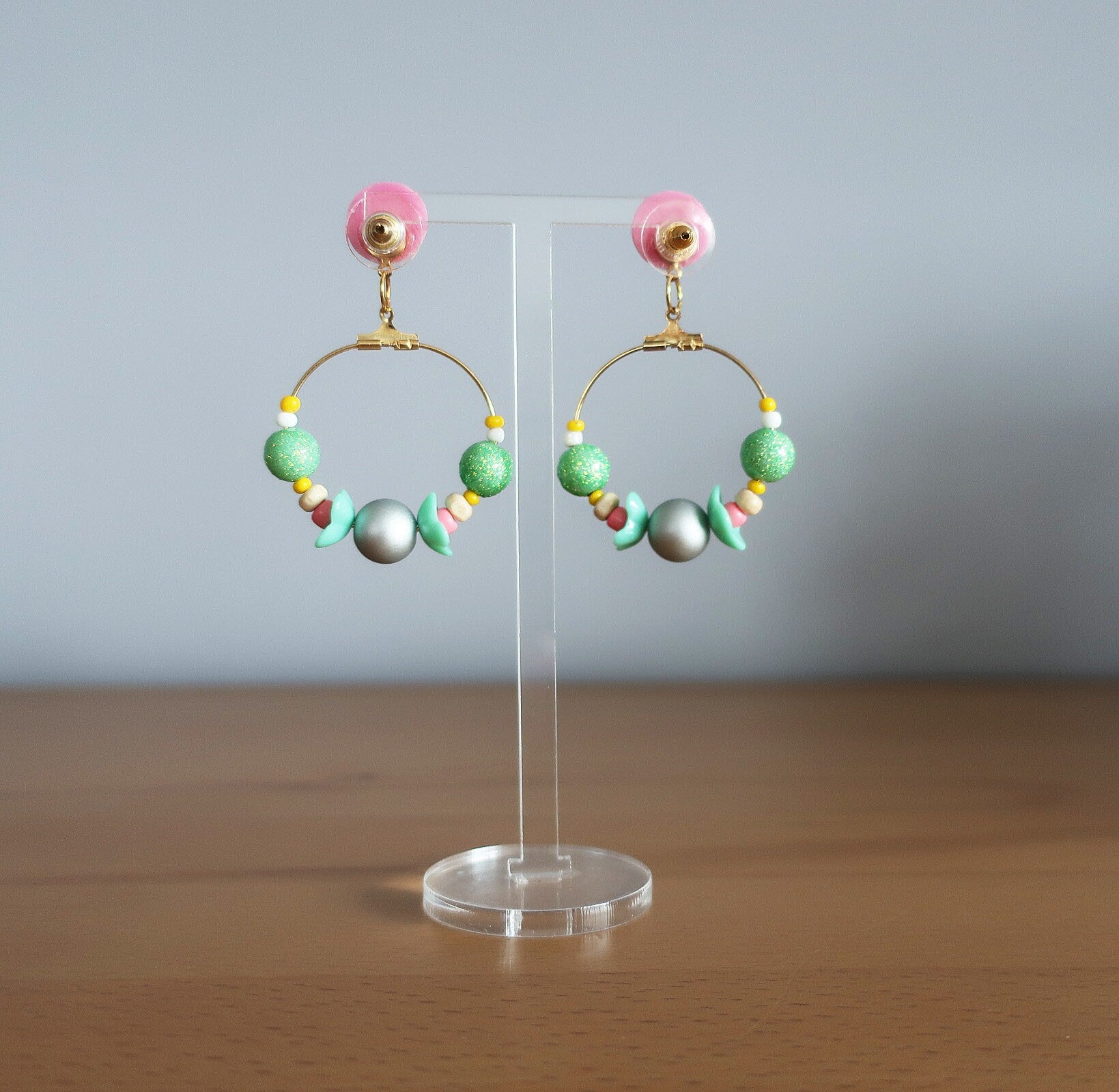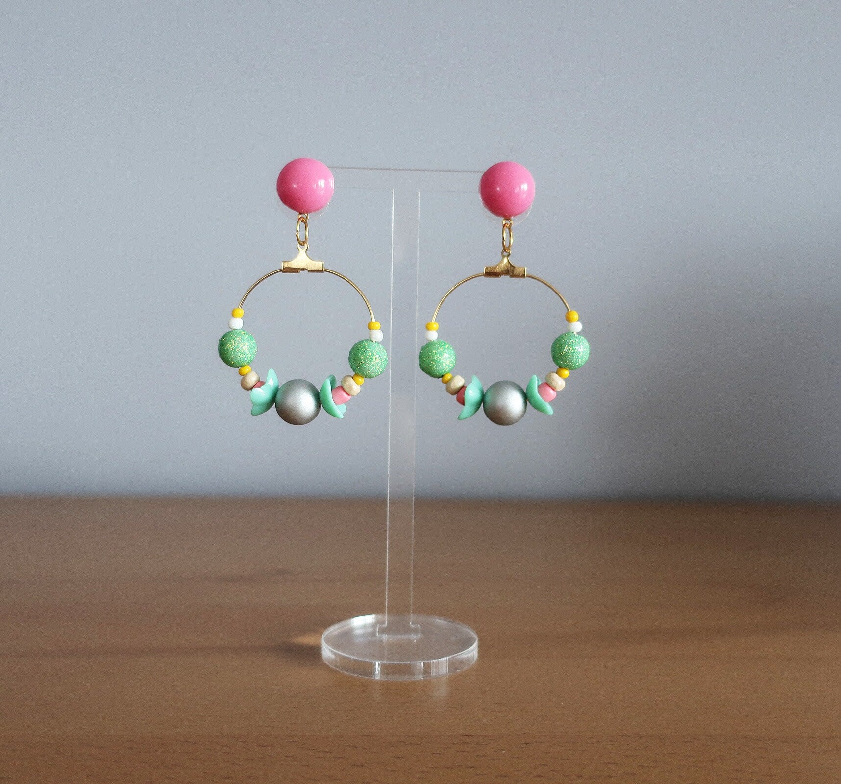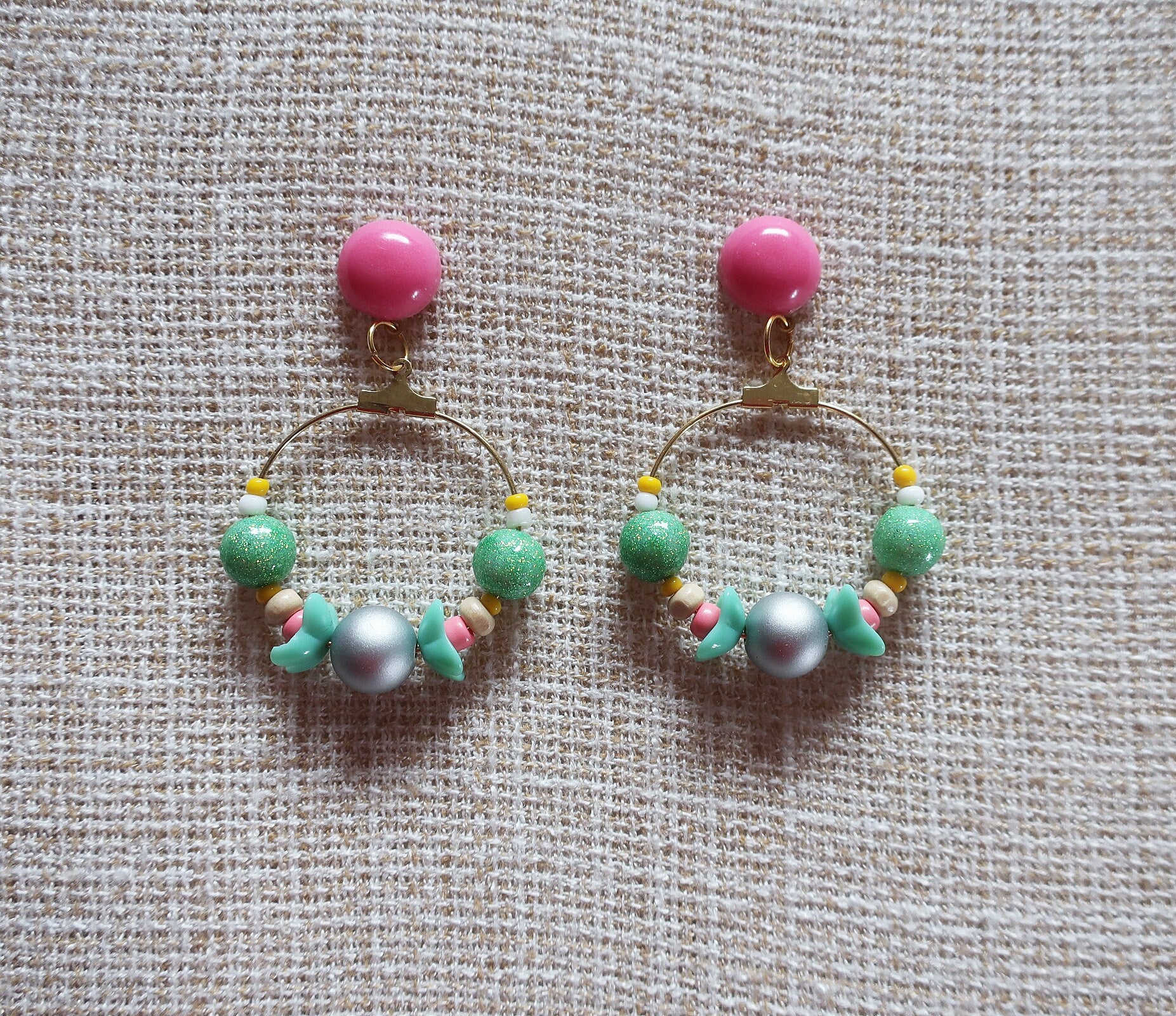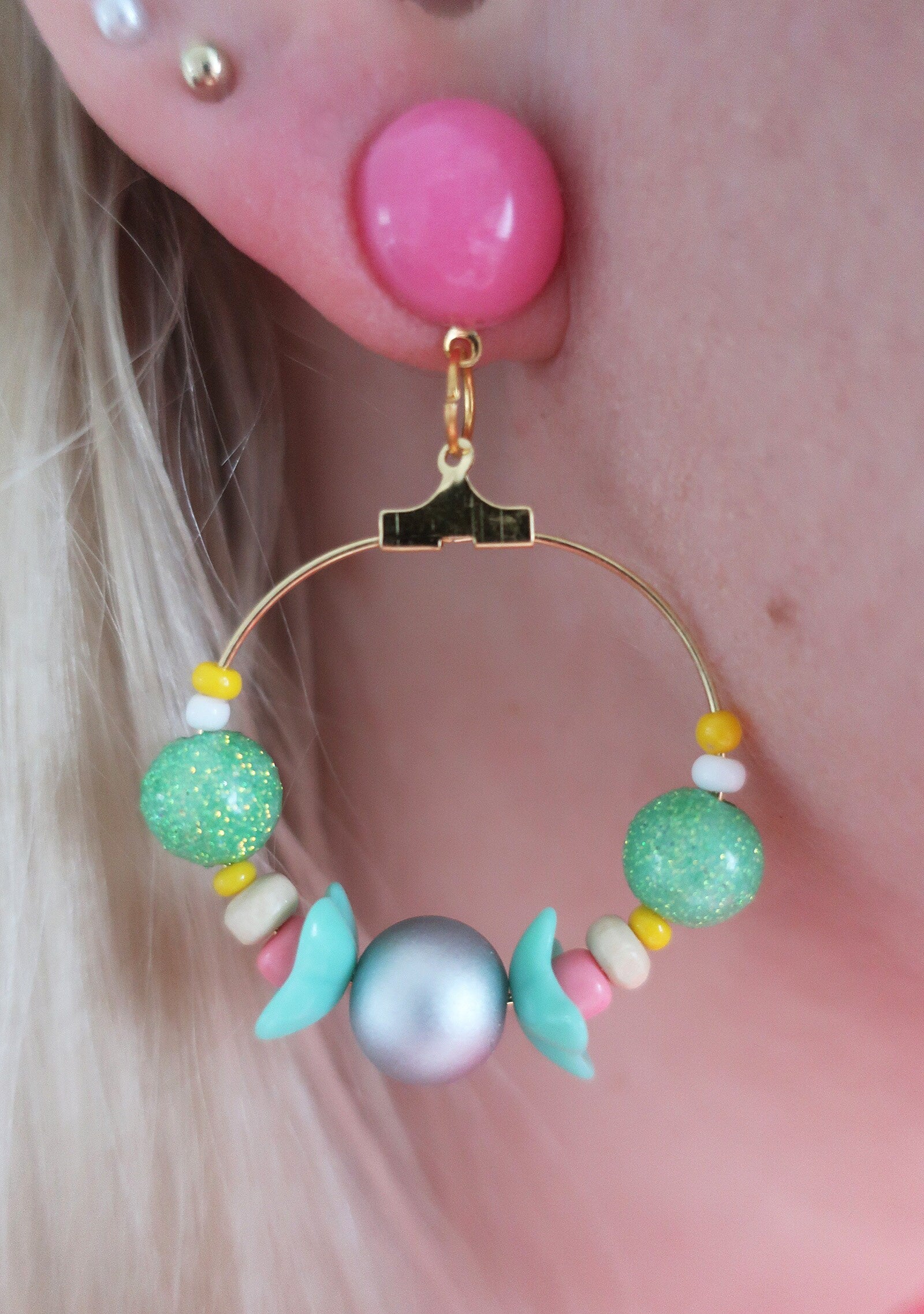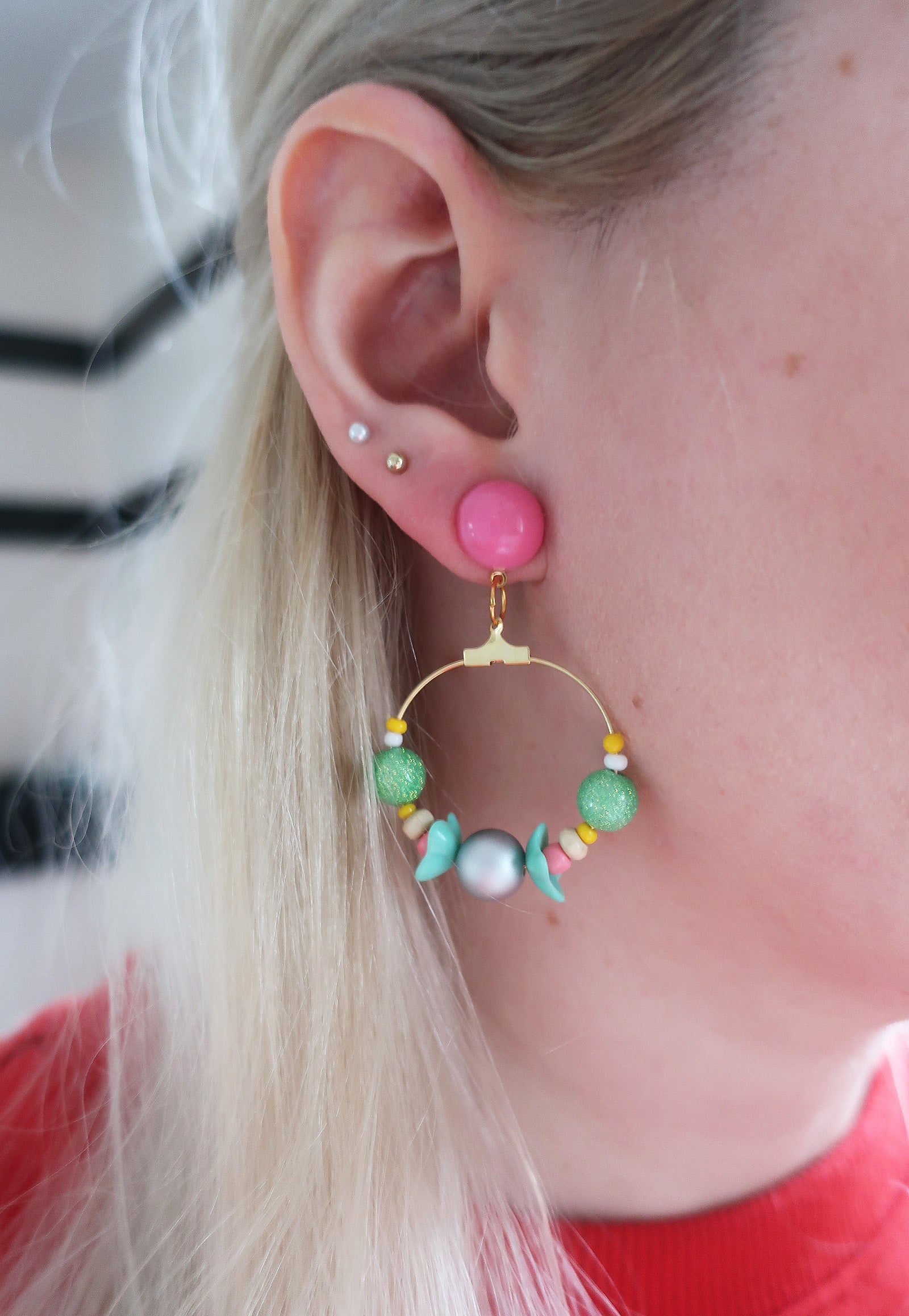 Materialien: Plastikperlen, Holzperlen, Glasperlen, Epoxidharz, goldfarbene Creolen, Messinghaken, Binderinge