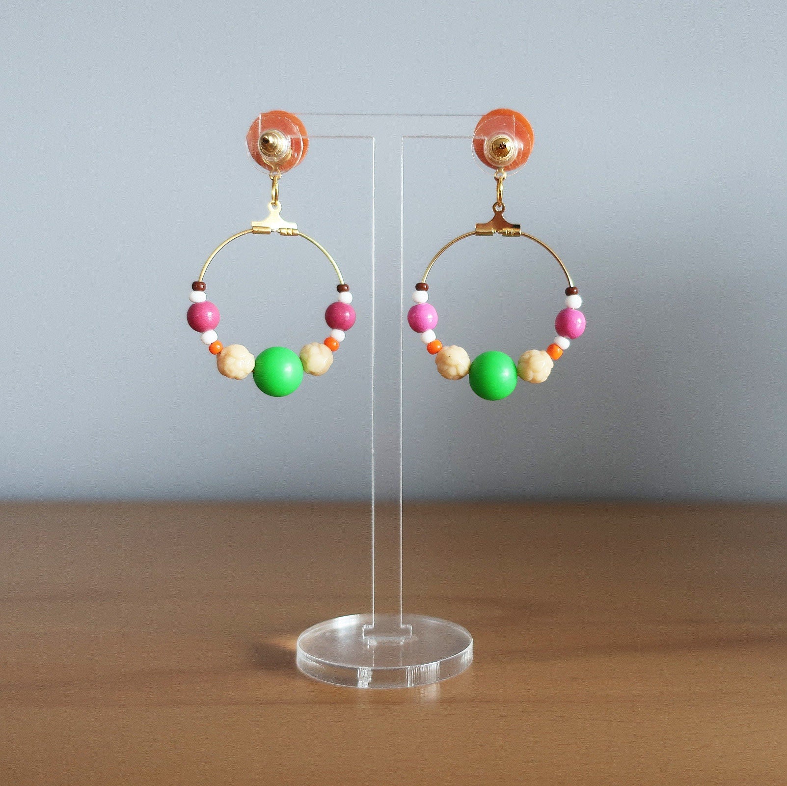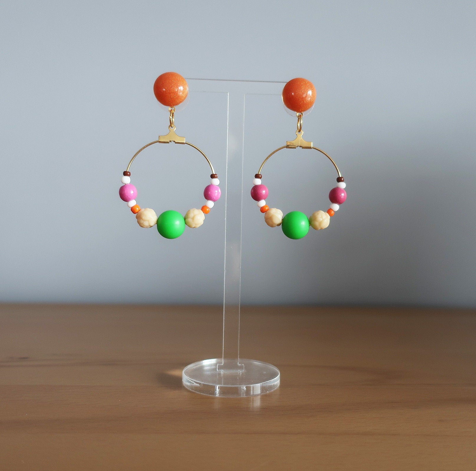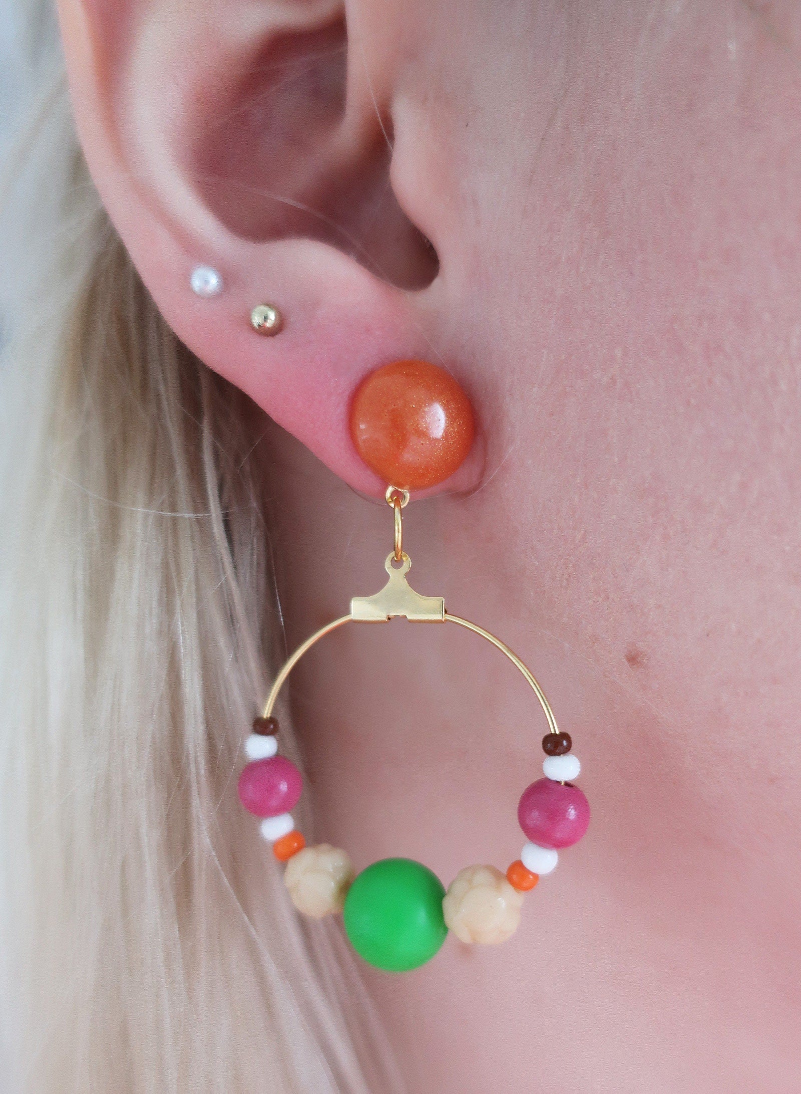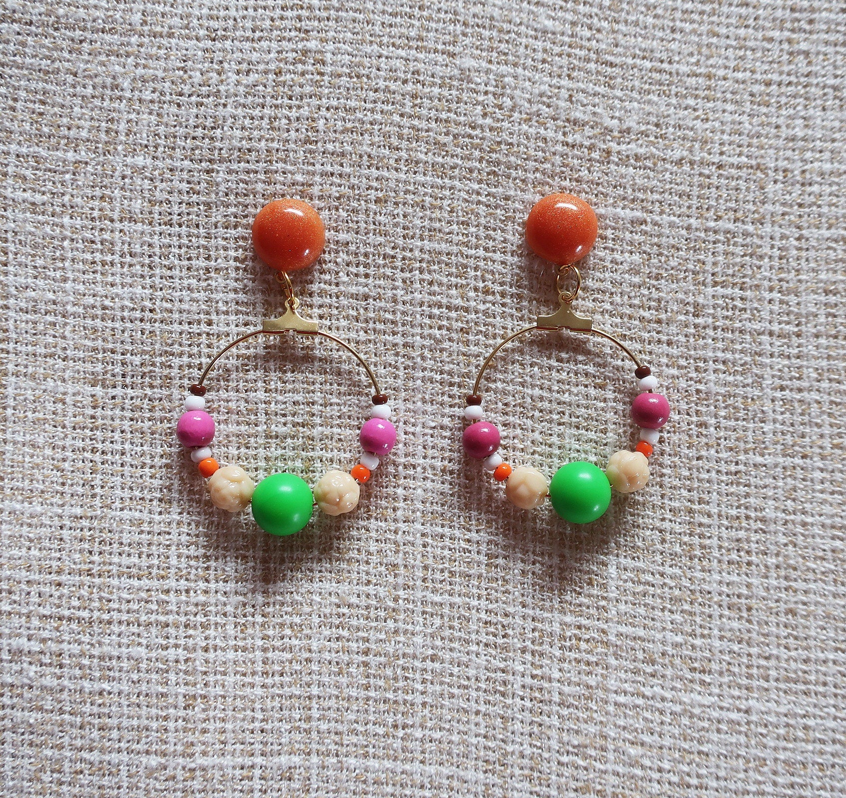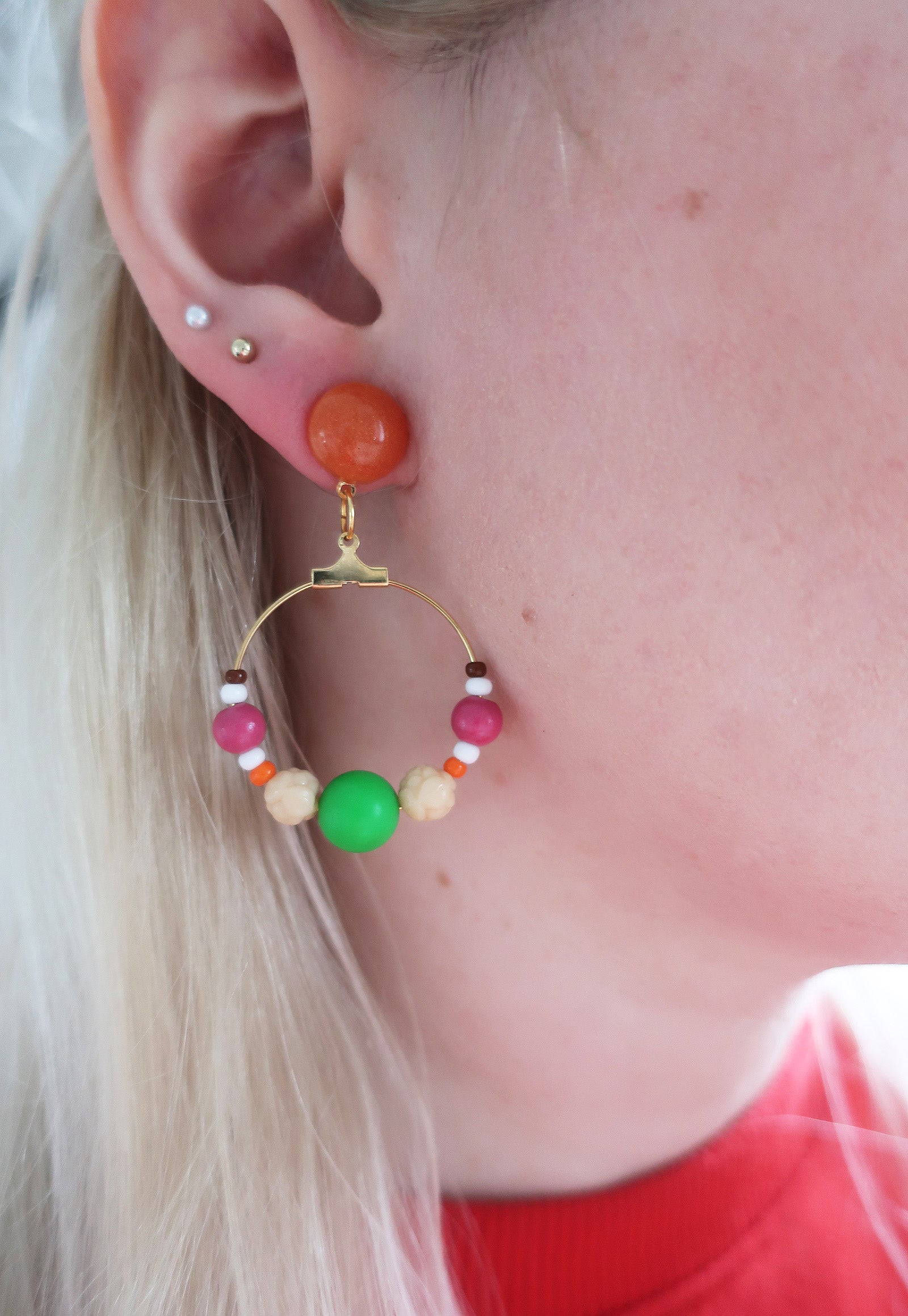 Materialien: Plastikperlen, Holzperlen, Glasperlen, Epoxidharz, goldfarbene Creolen, Messingstecker, Binderinge