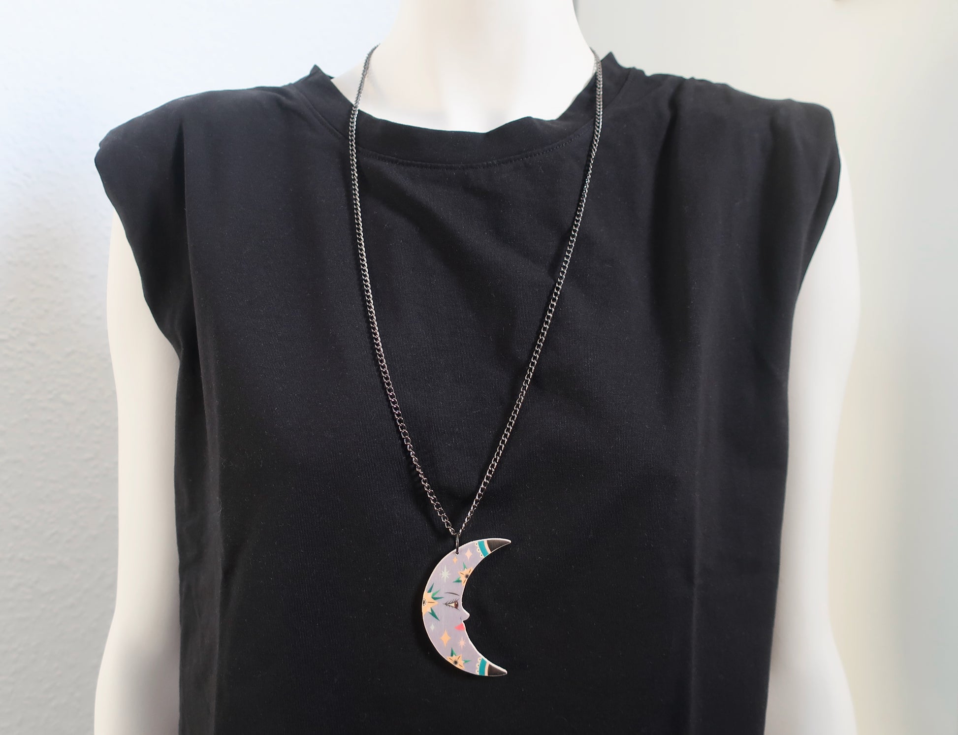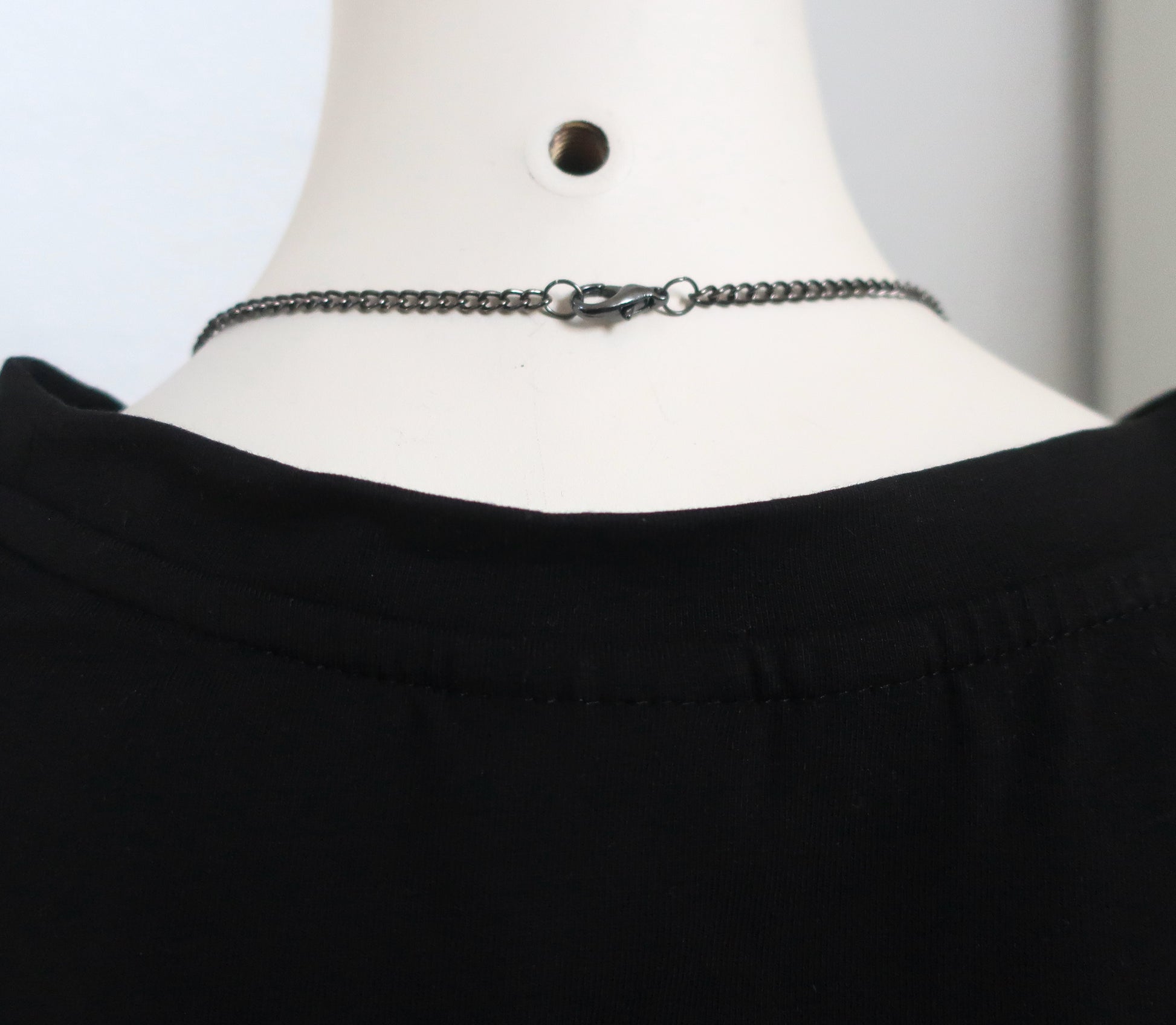 Die anthrazitfarbene Metallkette ist ungefähr 75,5 cm lang und hat einen Karabinerverschluss. Die gesamte Kettenlänge (mitsamt Verschluss) beträgt ungefähr 78 cm.