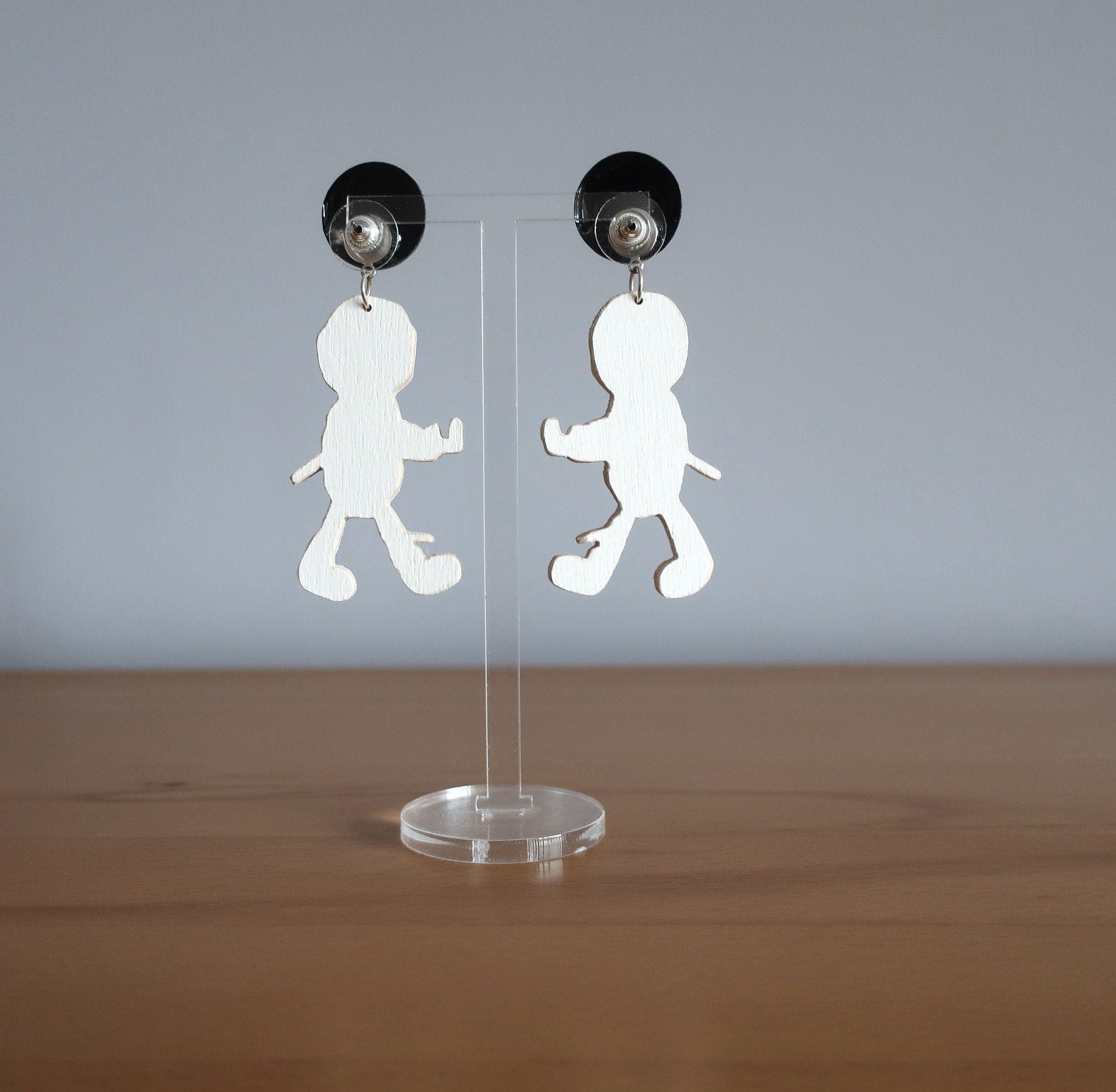 Für diese Ohrringe habe ich eine Zeichnung am Computer erstellt, die ich anschließend manuell auf Birkenholz übertragen und dann mit einer Dekupiersäge ausgesägt habe. Um die Haltbarkeit zu verbessern wurde eine Schicht matter Lack aufgetragen.