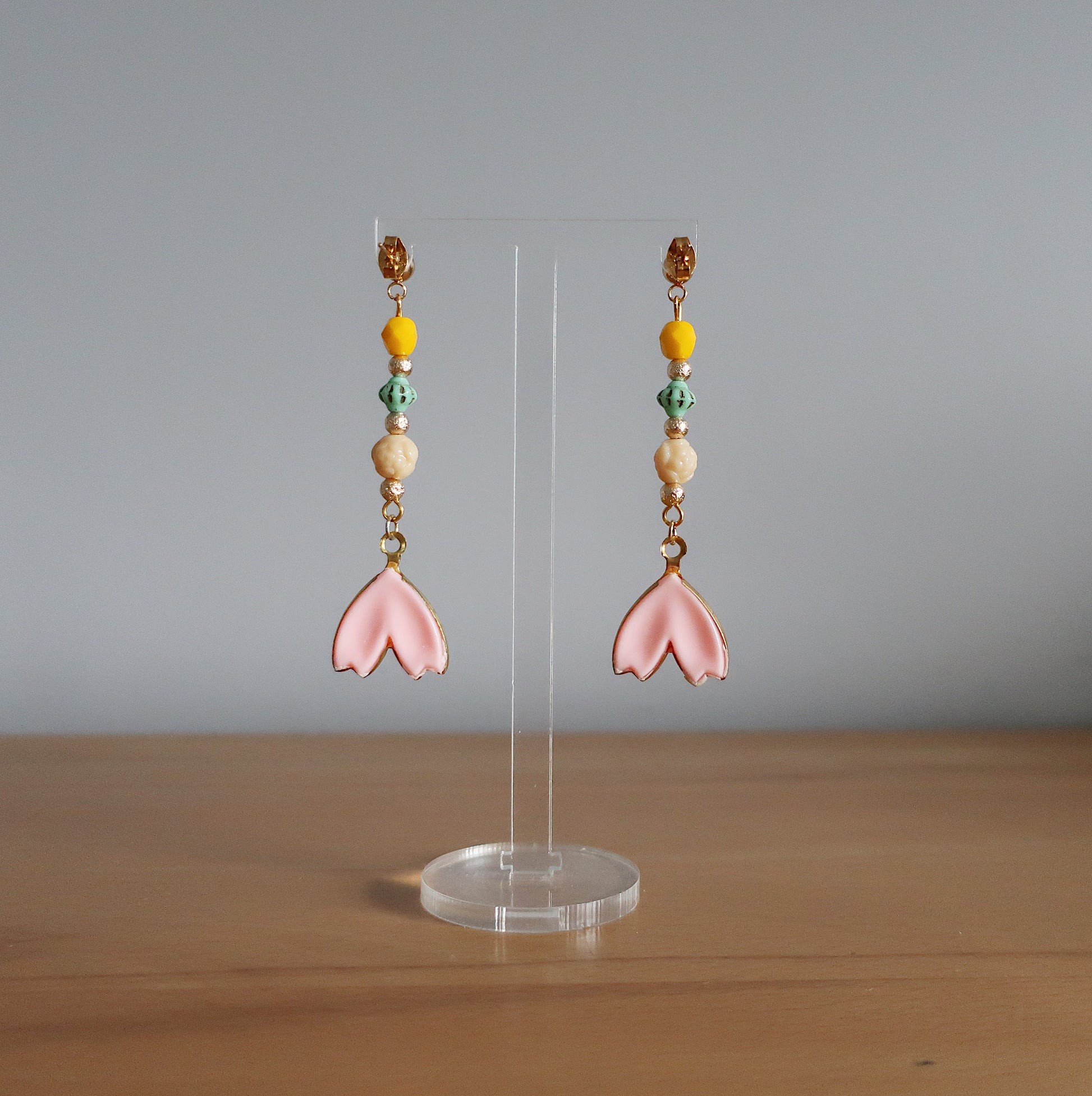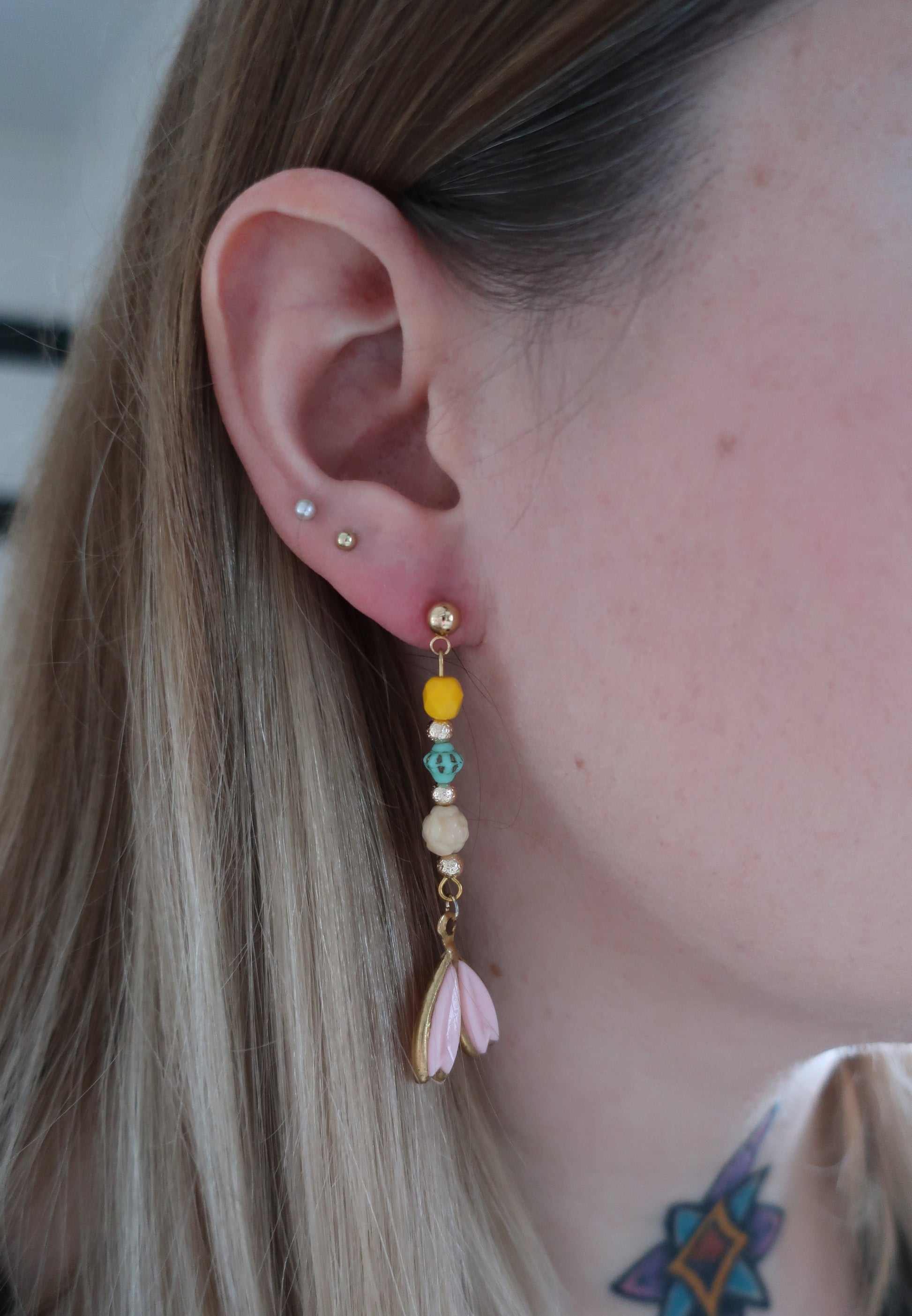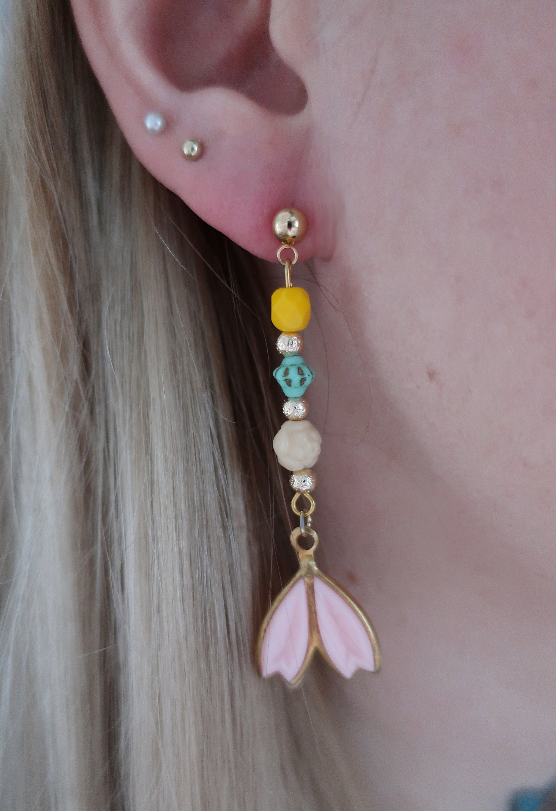 Für diese Ohrringe wurden Glas-und Metallperlen auf Ösenstifte aufgereiht und ein Vintage-'Blütenblatt' daran befestigt.