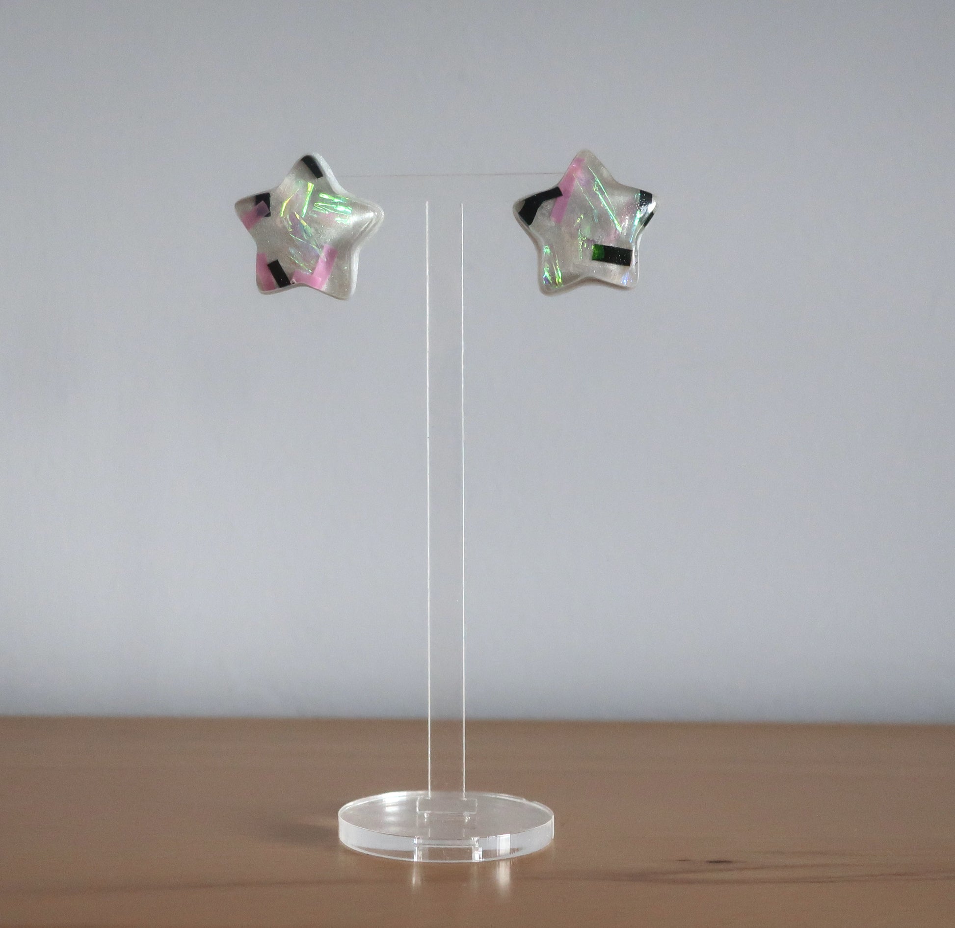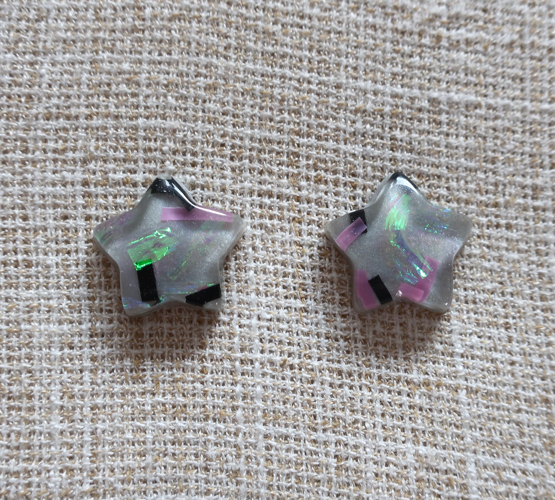Ich habe diese Ohrringe aus Epoxidharz und buntem Glitzer hergestellt.
