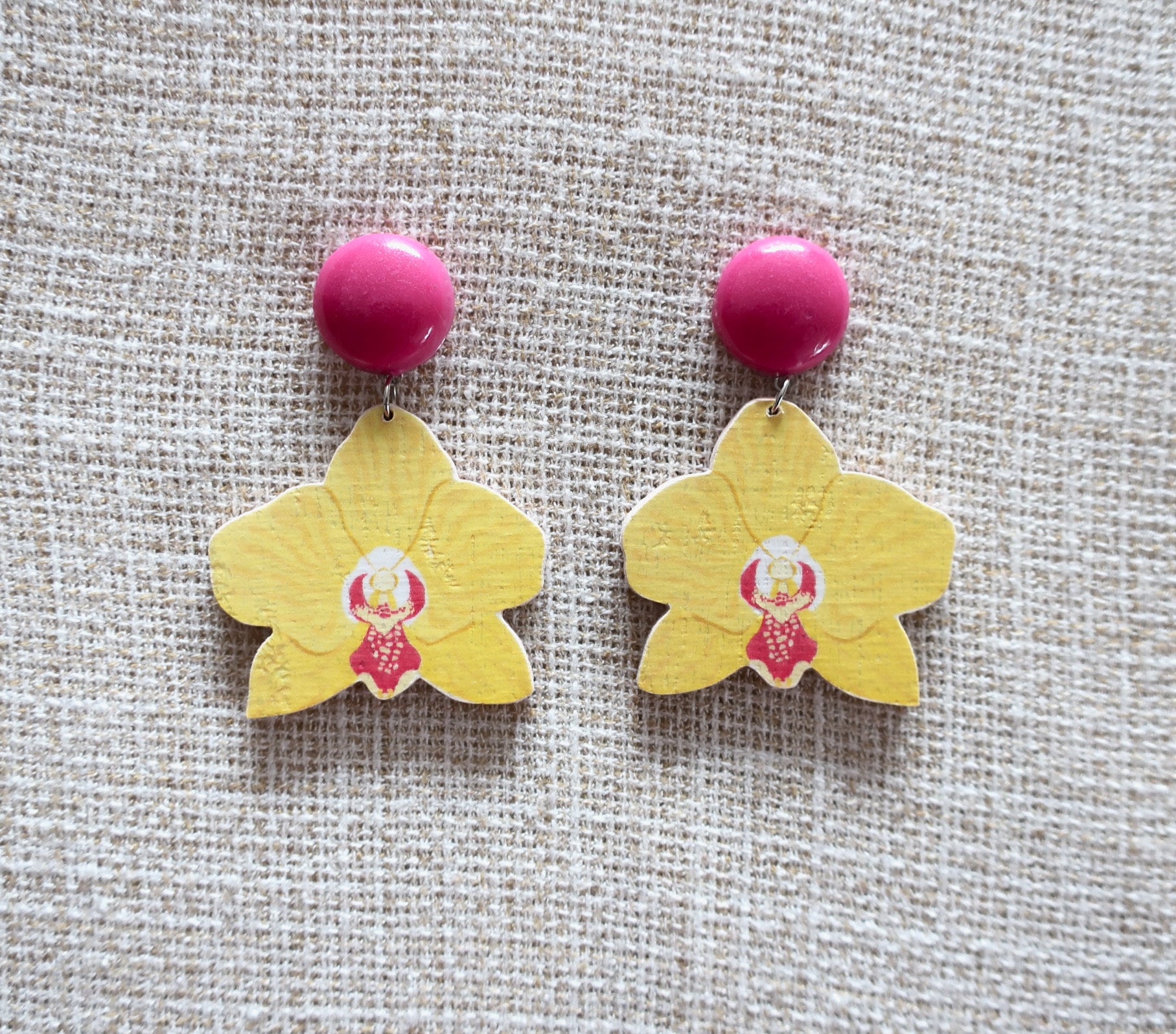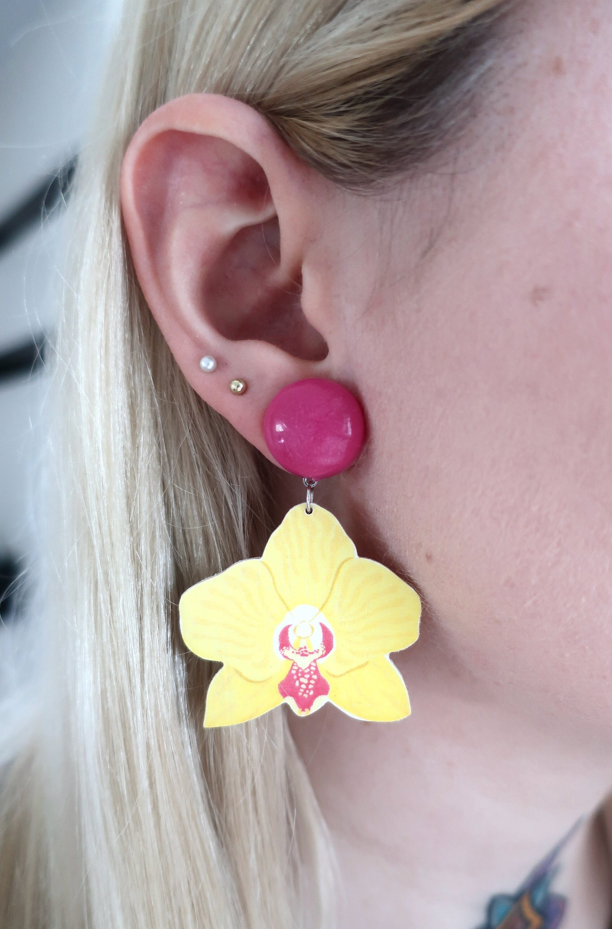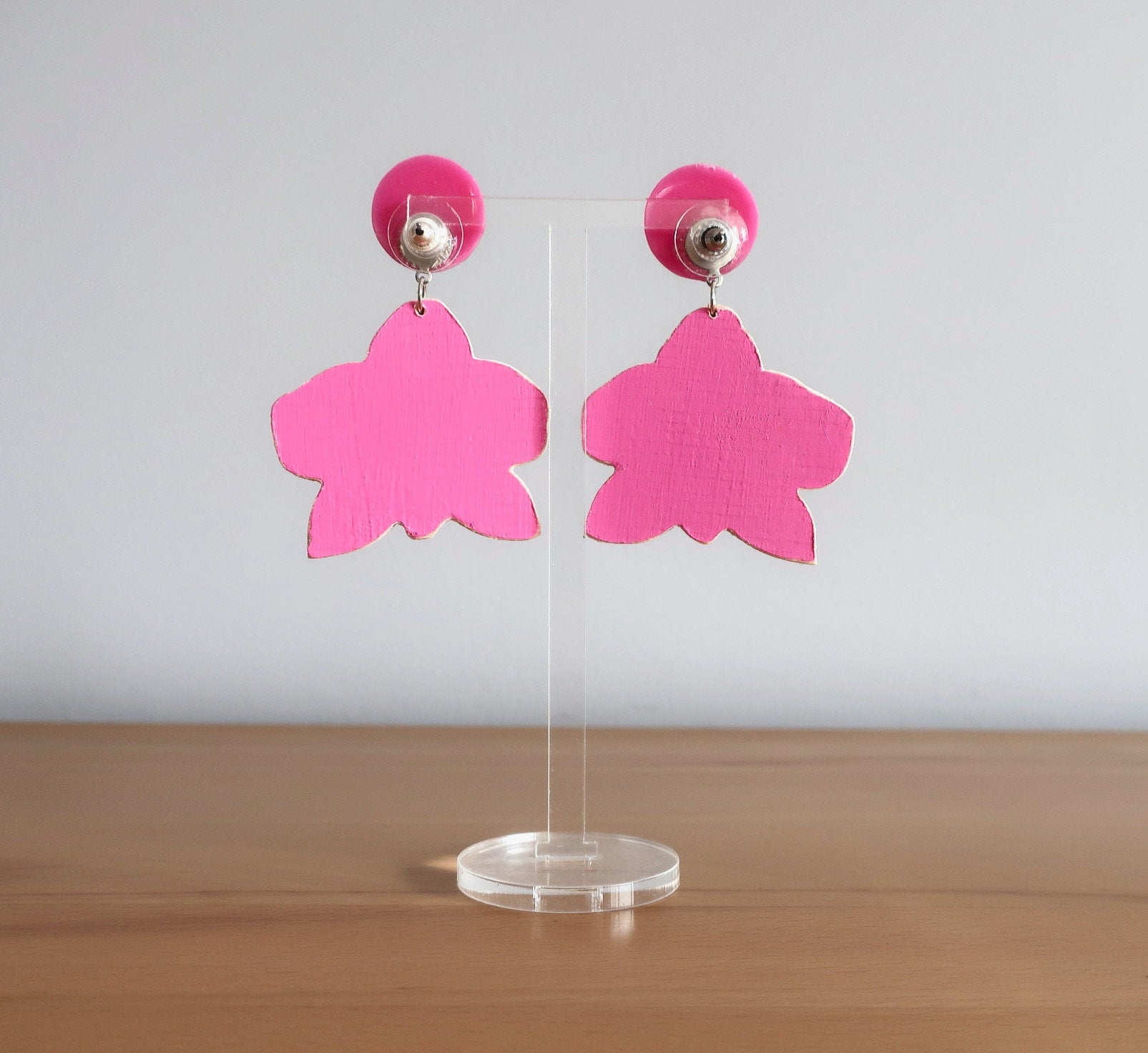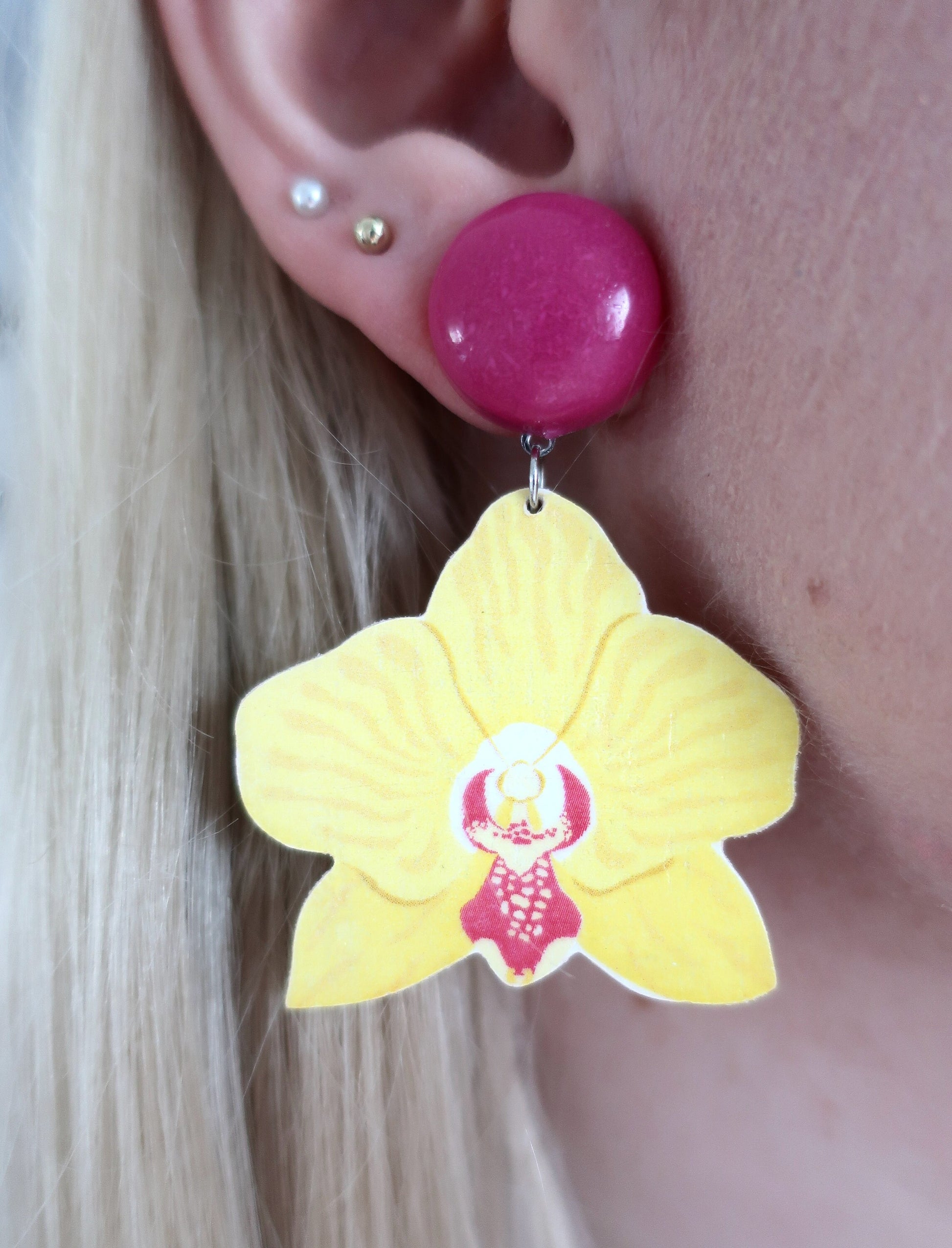Für diese Ohrringe habe ich eine Zeichnung am Computer erstellt, die ich anschließend manuell auf Birkenholz übertragen und dann mit einer Dekupiersäge ausgesägt habe. Um die Haltbarkeit zu verbessern wurde eine Schicht matter Lack aufgetragen.