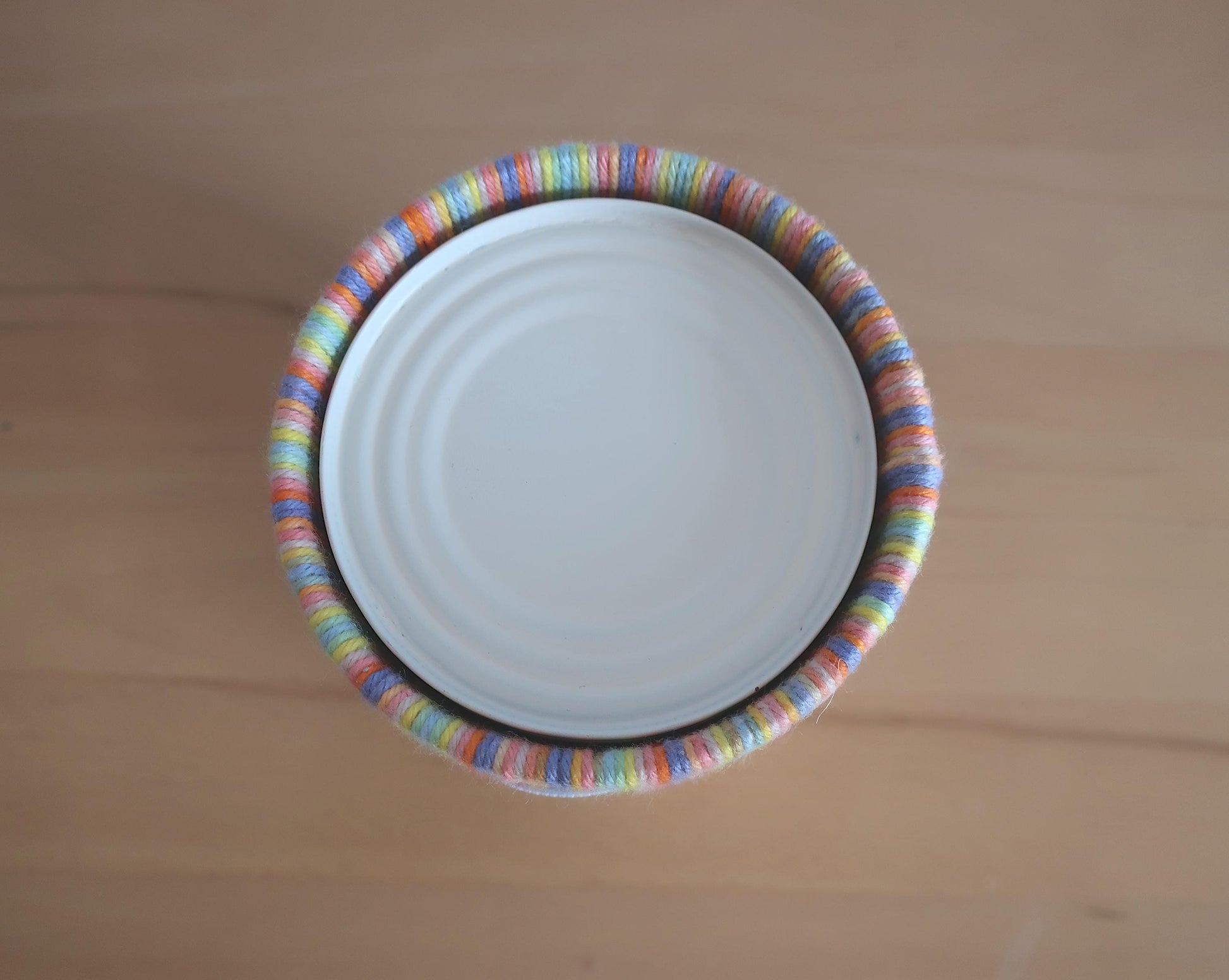 Materialien: Konservendose, Regenbogengarn, Schleifenband, Sprühfarbe