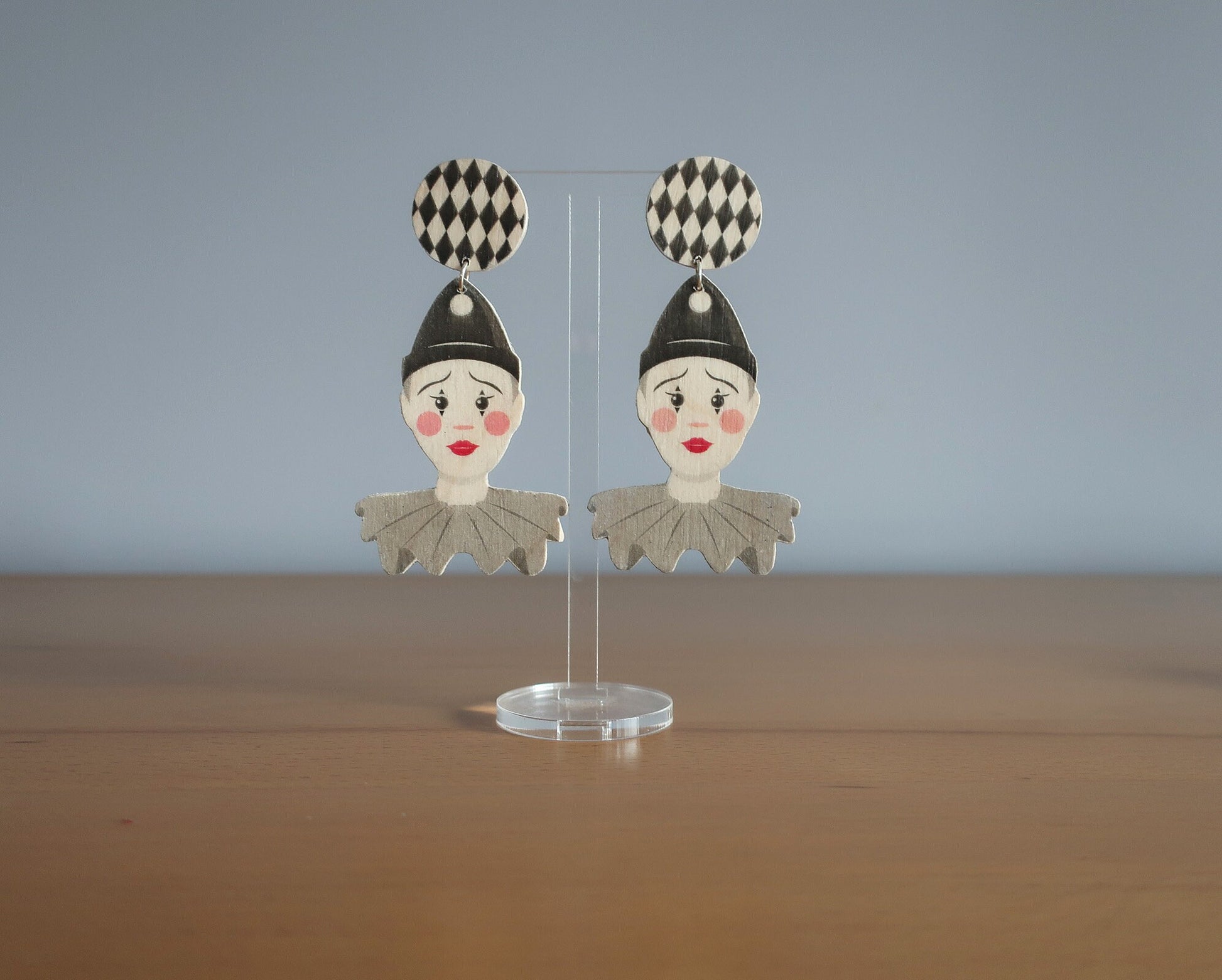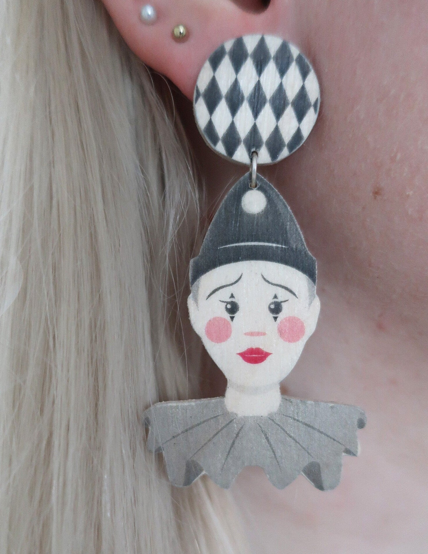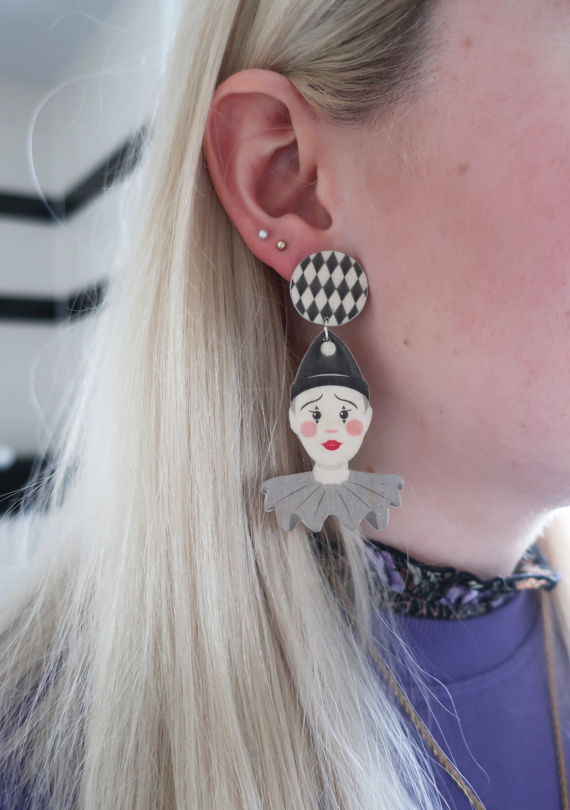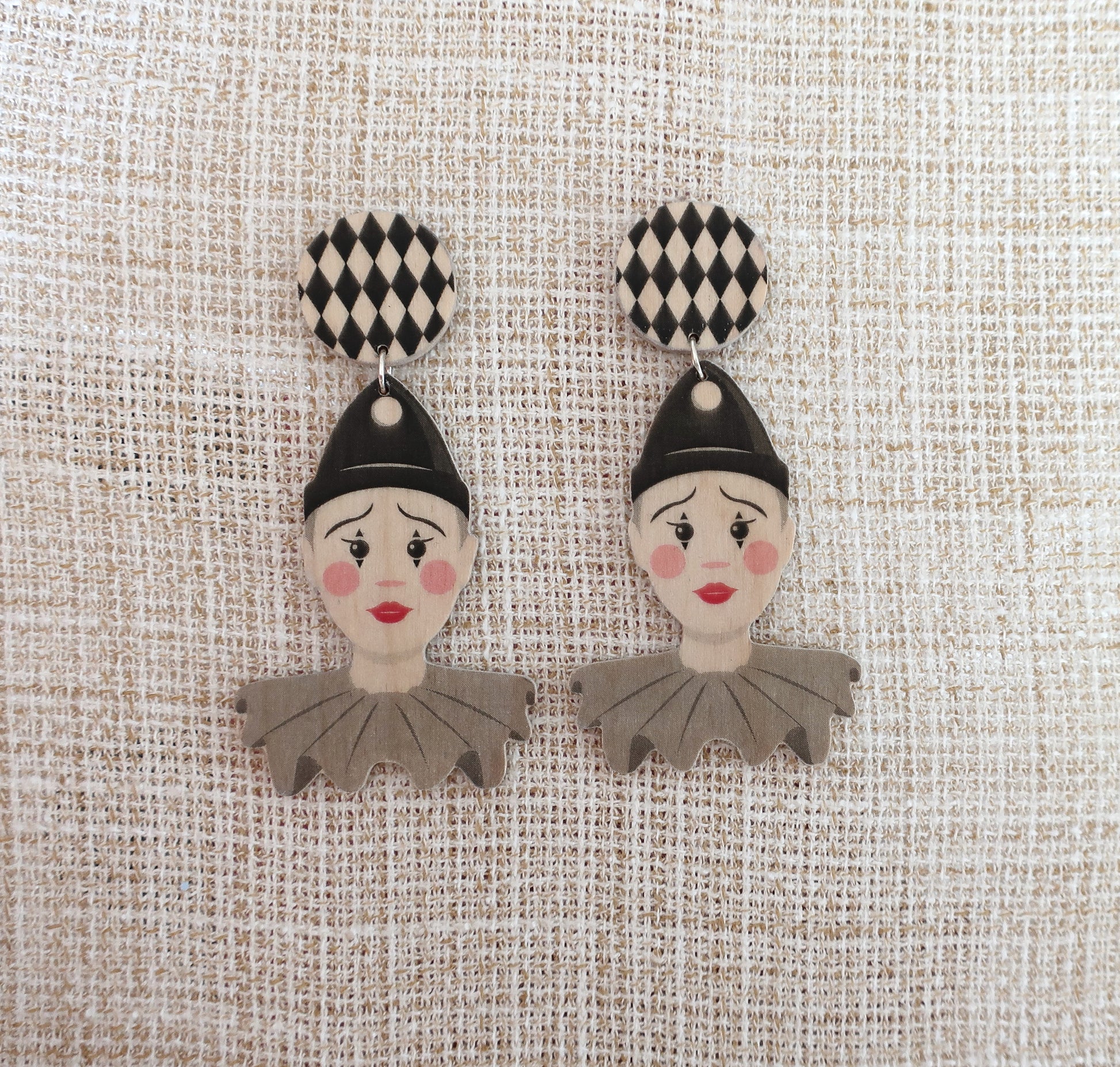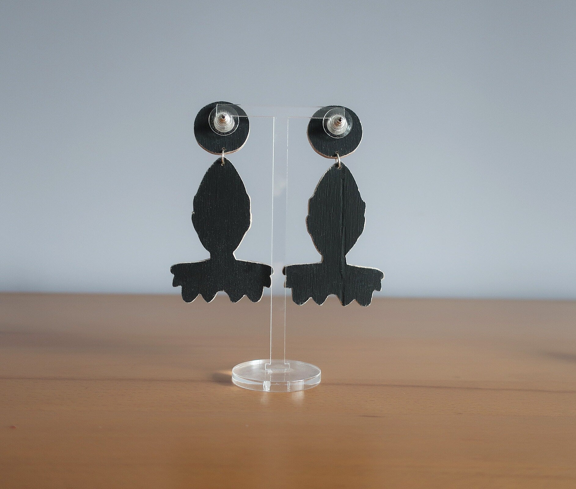 Für diese Ohrringe habe ich eine Zeichnung am Computer erstellt, die ich anschließend manuell auf Birkenholz übertragen und dann mit einer Dekupiersäge ausgesägt habe. Um die Haltbarkeit zu verbessern wurde eine Schicht matter Lack aufgetragen.