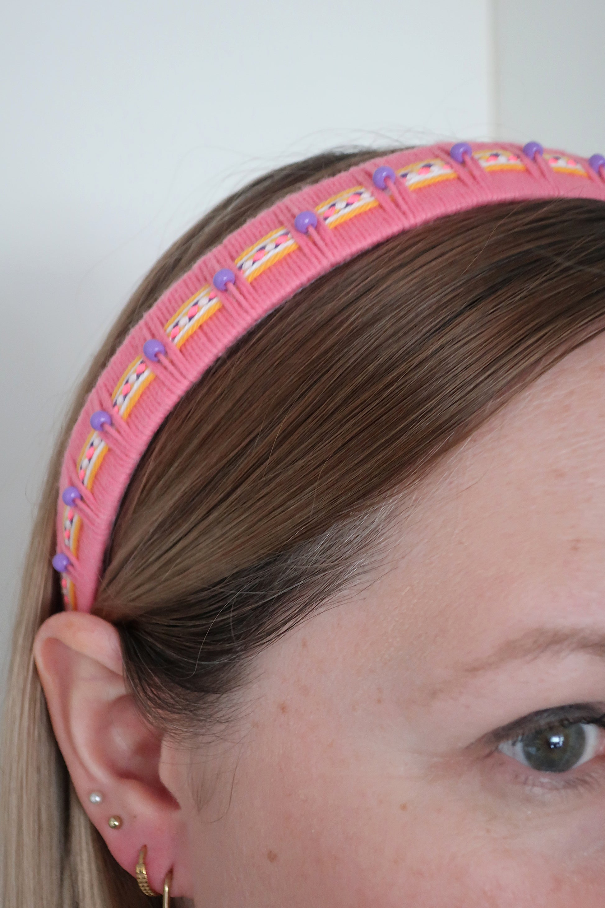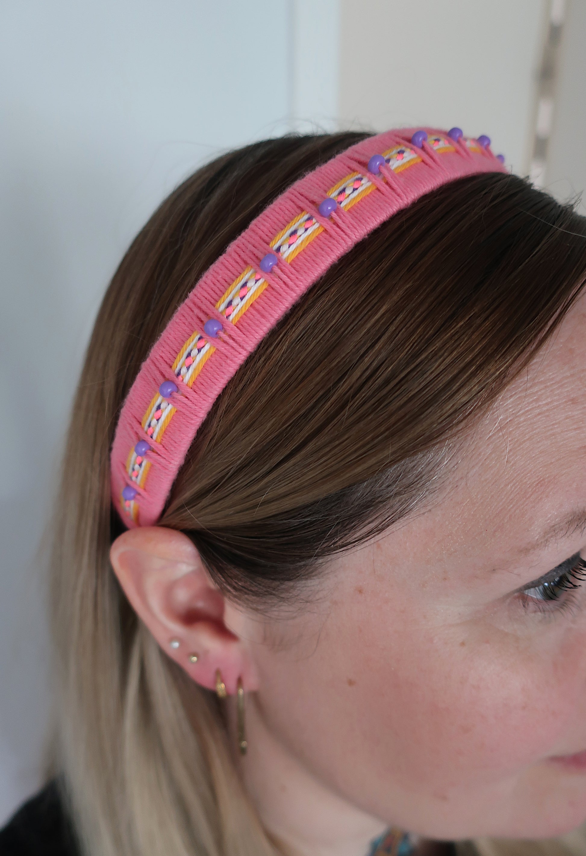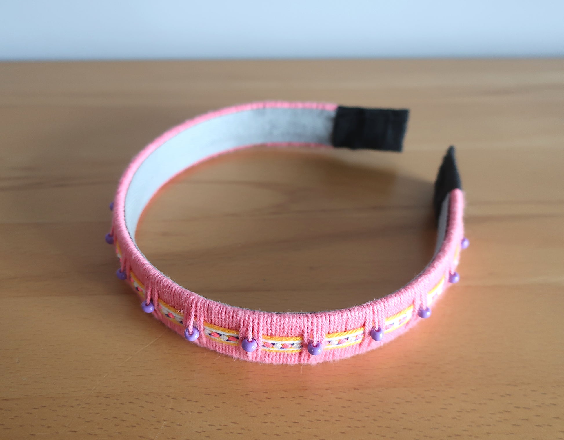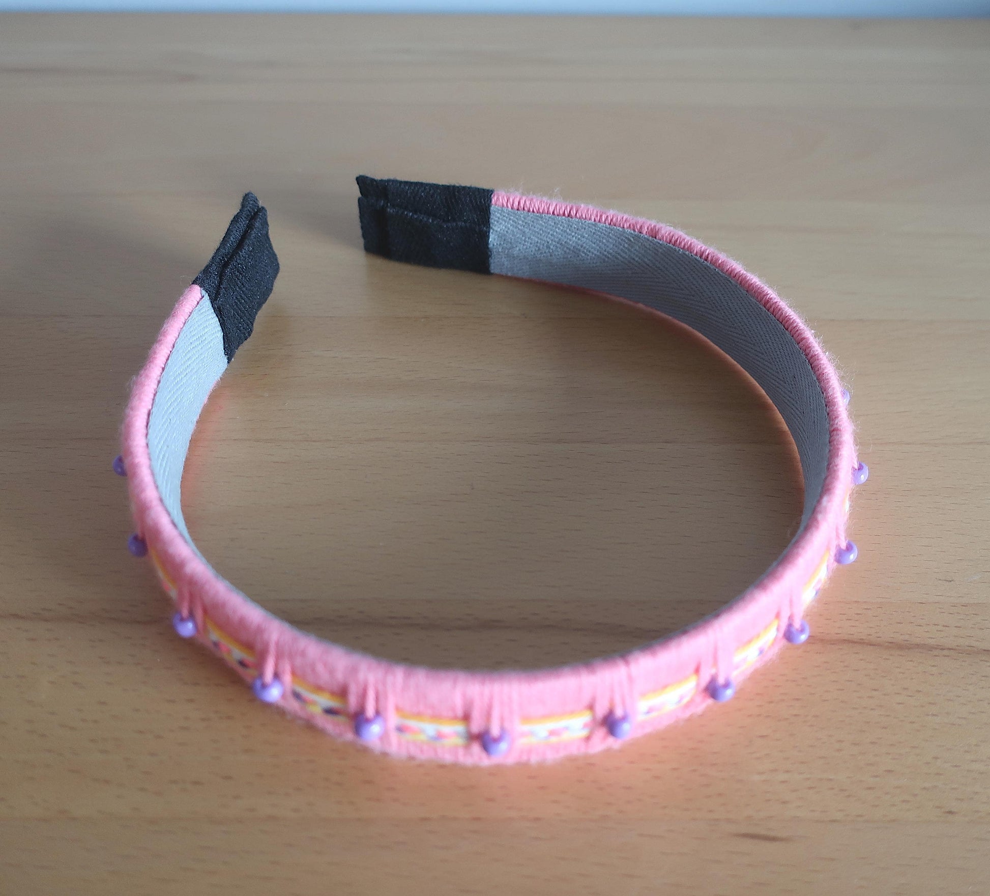 Materialien: Baumwollgarn, Schmuckgarn, Perlen, Baumwollschrägband, Metallhaarreif