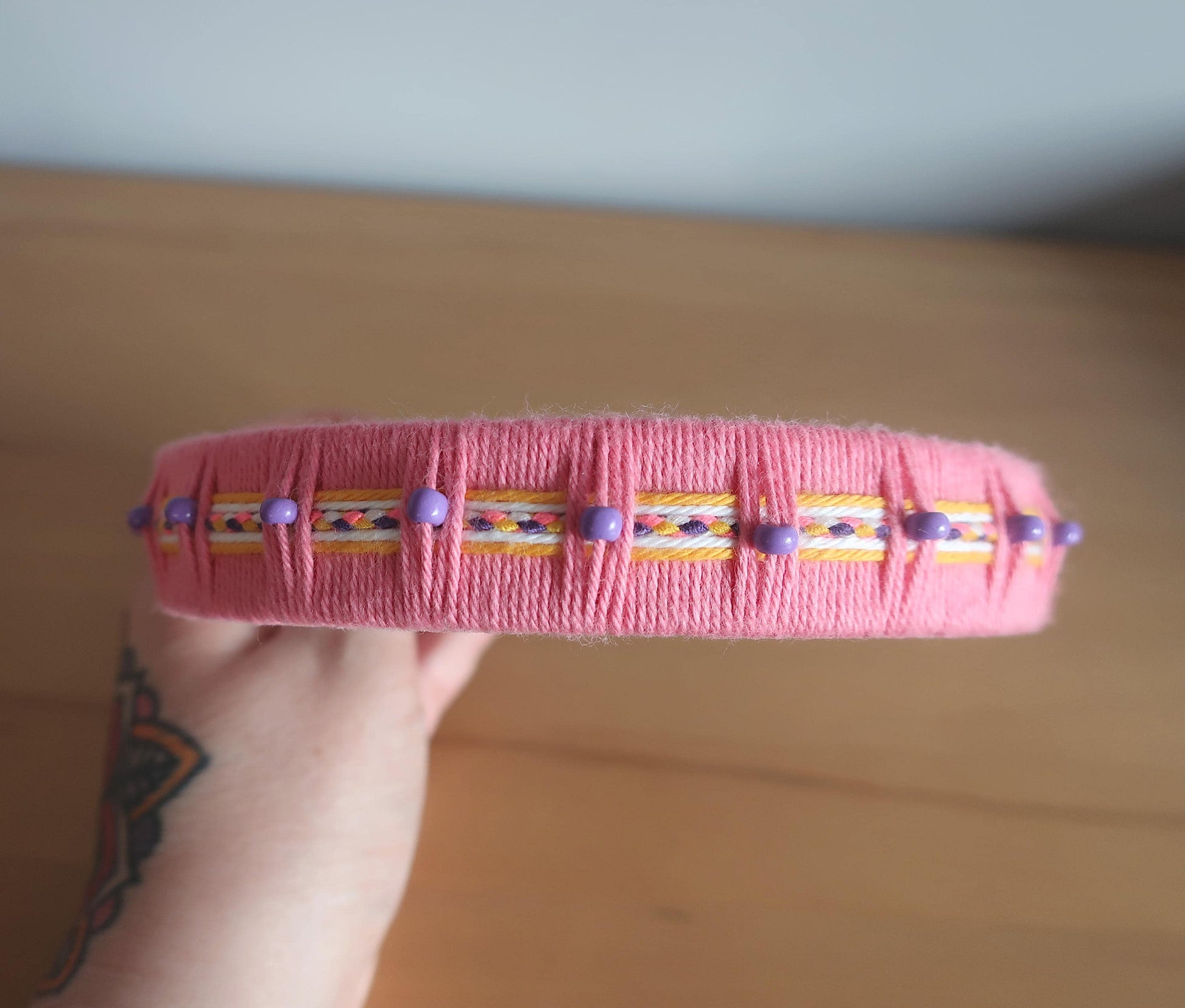 Für diesen Haarreif habe ich einen Plastikstreifen mit Baumwollgarn umwickelt und auf einen Metallhaarreifen geklebt. Die Innenseite des Haarreifs ist für einen sauberen Look mit grauem Baumwollschrägband ausgekleidet. Die Enden sind für einen bequemen Sitz mit schwarzem Schrägband eingefasst.