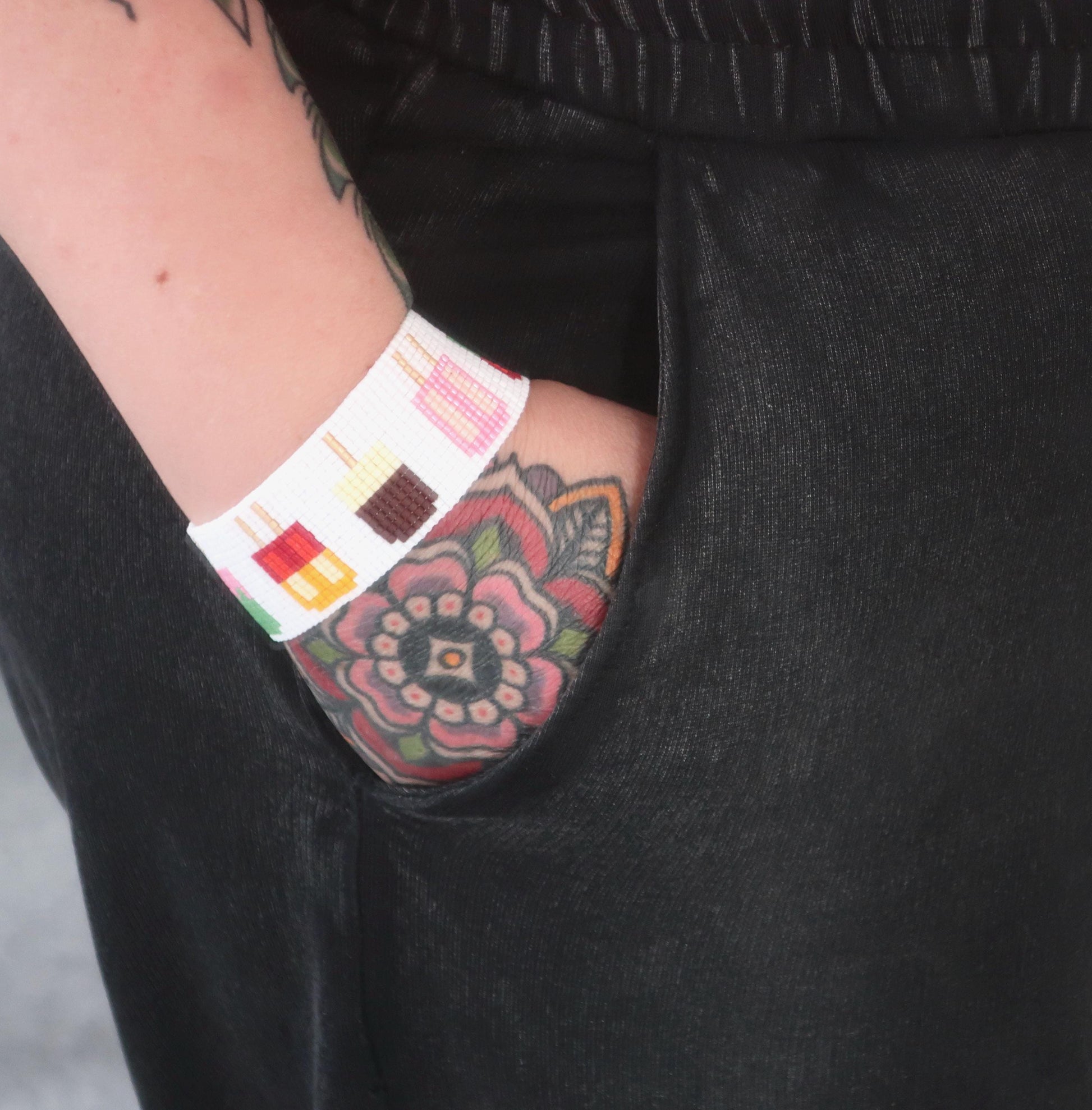 Dies ist ein handgewebtes Armband mit hochwertigen japanischen Miyuki-Perlen. Es hat goldfarbene Röhrenenden, einen Karabinerhaken als Verschluss und eine 5,5 cm lange Verlängerungskette. Es ist 2,6 cm breit.