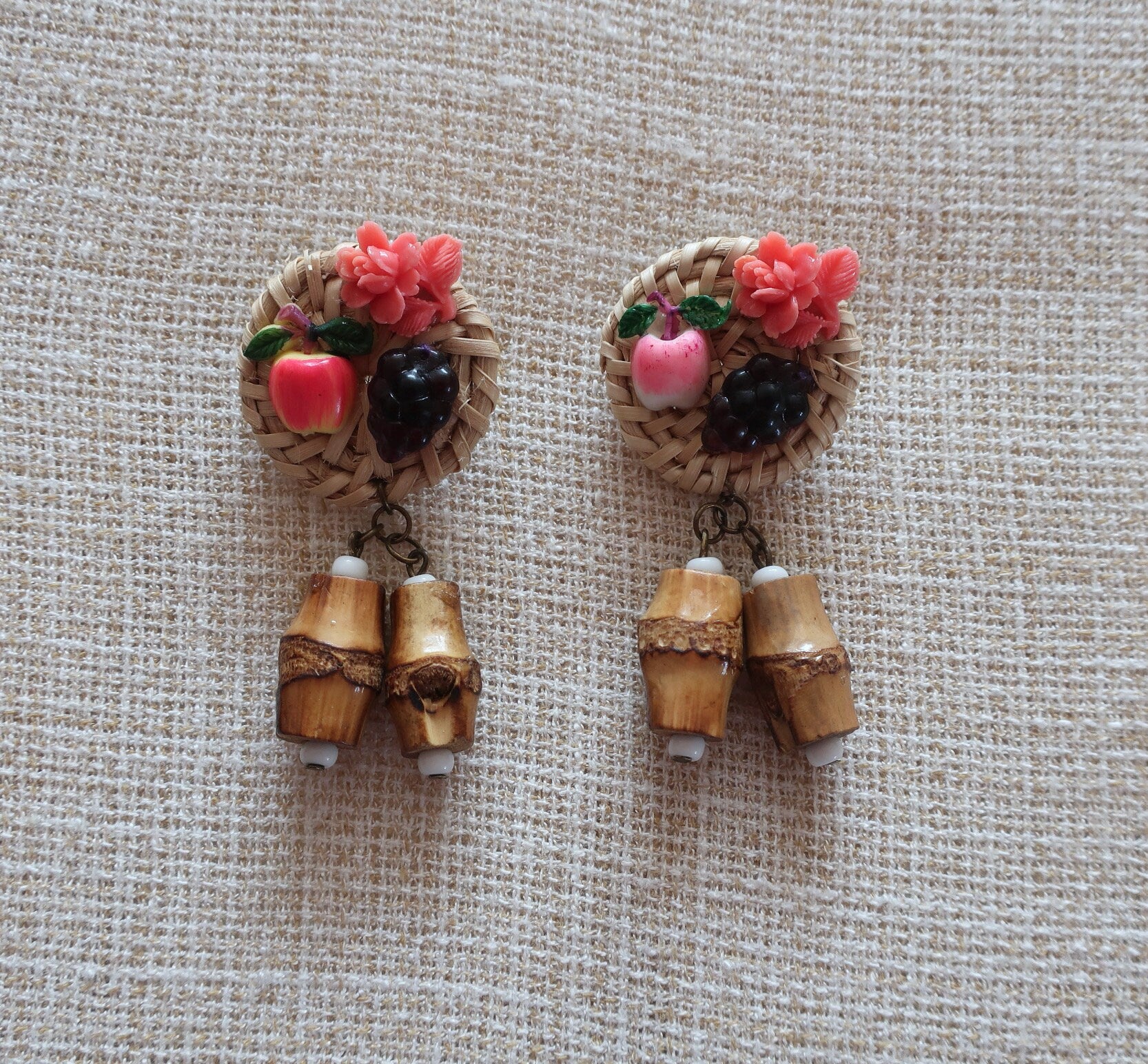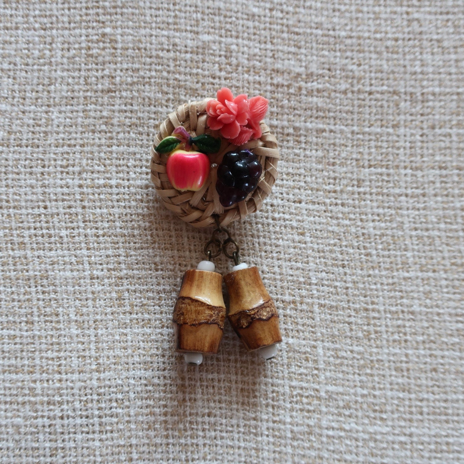 Für diese Brosche habe ich Frucht- und Blumencabochons auf eine Rattanscheibe geklebt bzw. genäht und Bambusperlen mit bronzefarbenen Binderingen daran befestigt. Da die Rattanscheiben nicht alle genau gleich groß sind variiert die Größe von Brosche zu Brosche leicht. Der Apfelcabochon ist vintage und kann gelb oder weiß sein (siehe Foto).
