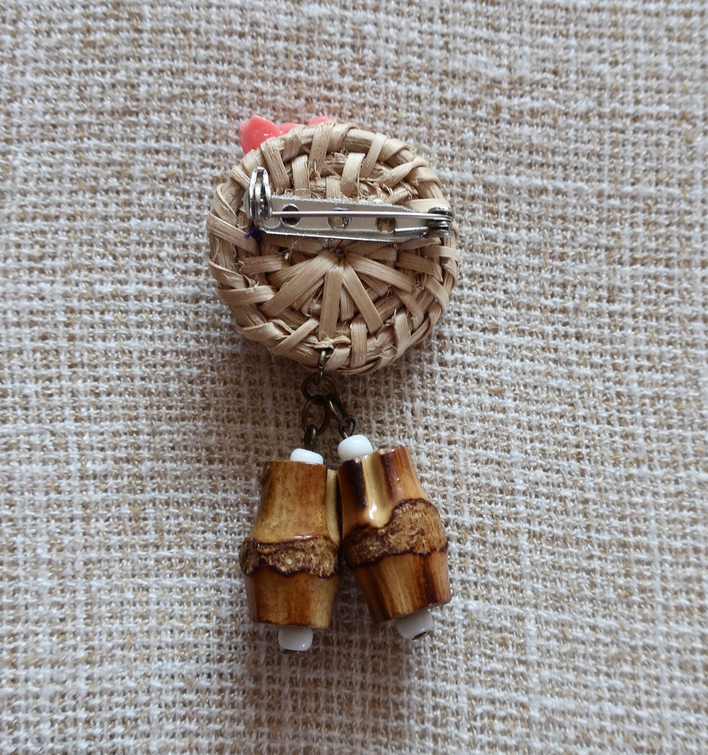 Materialien: Rattan, Bambus, Glasperle, Plastikcabochon, Anstecknadel, Binderinge