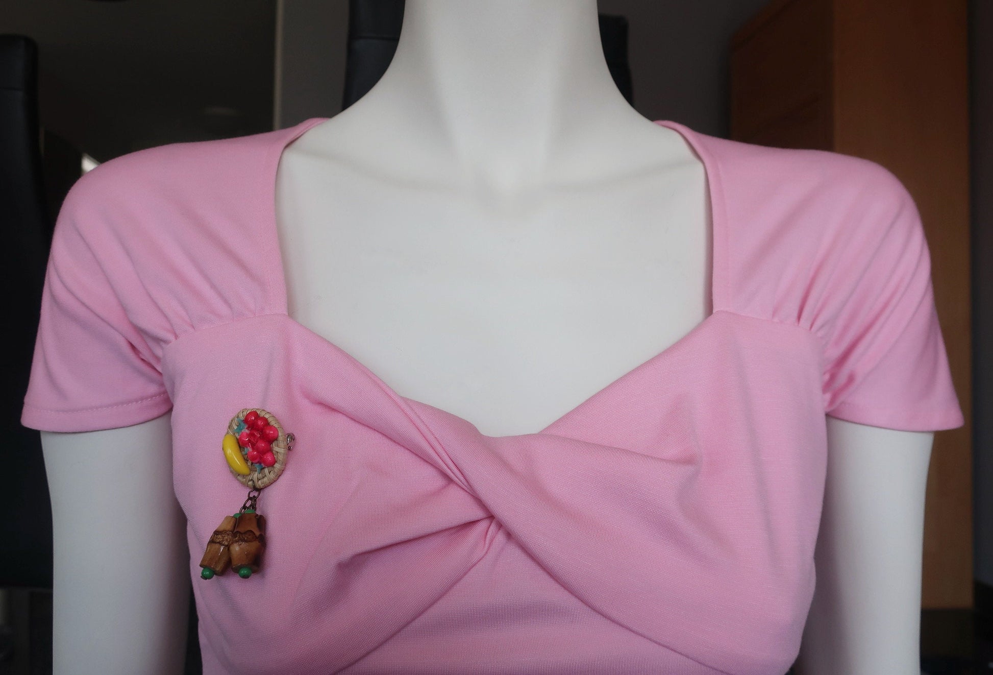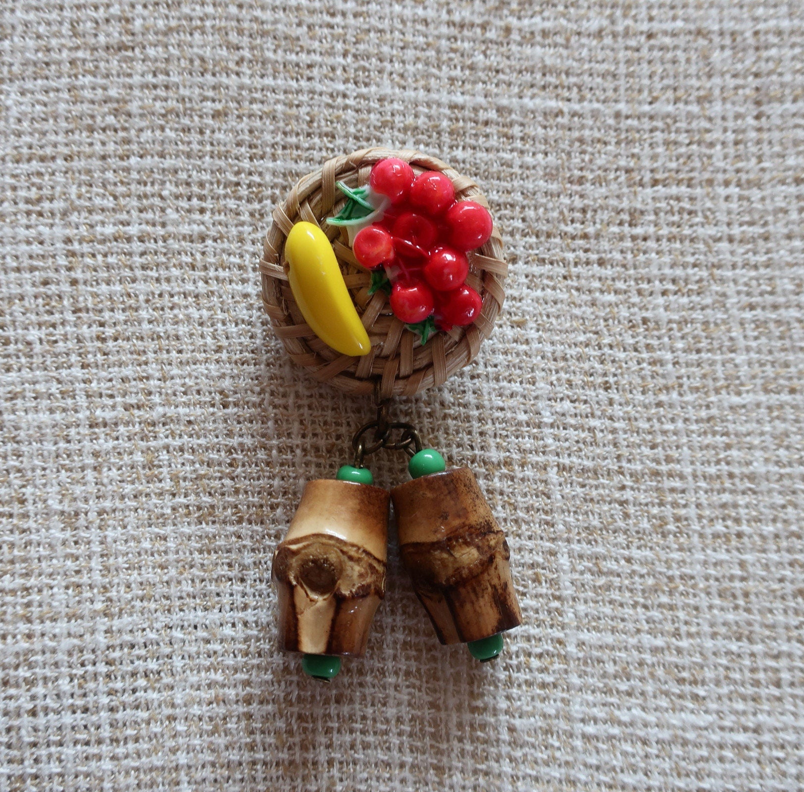 Für diese Brosche habe ich Fruchtcabochons auf eine Rattanscheibe geklebt und genäht und Bambusperlen mit bronzefarbenen Binderingen daran befestigt. Da die Rattanscheiben nicht alle genau gleich groß sind variiert die Größe von Brosche zu Brosche leicht.