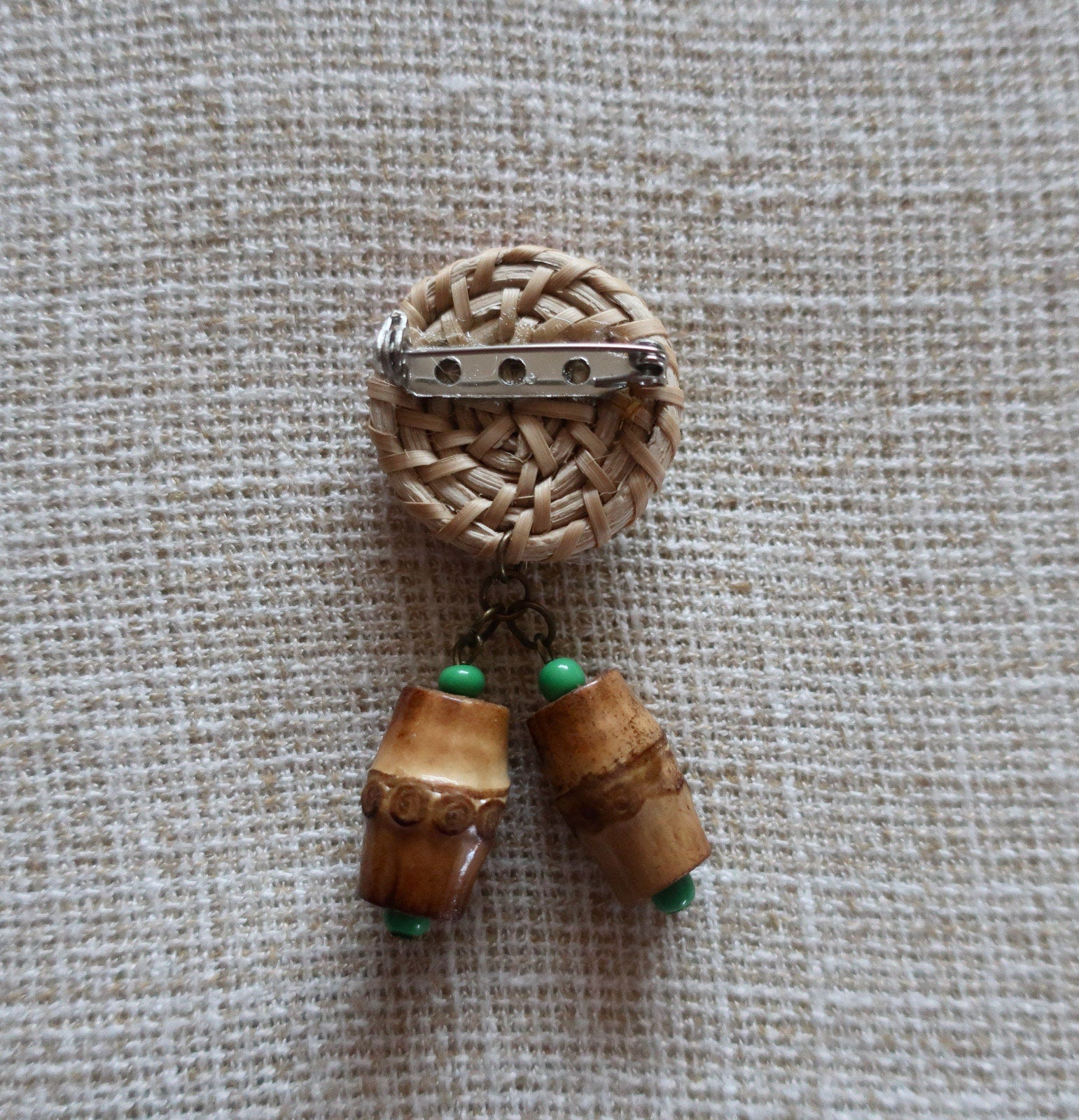 Materialien: Rattan, Bambus, Glasperlen, Plastikcabochon, Anstecknadel, Binderinge
