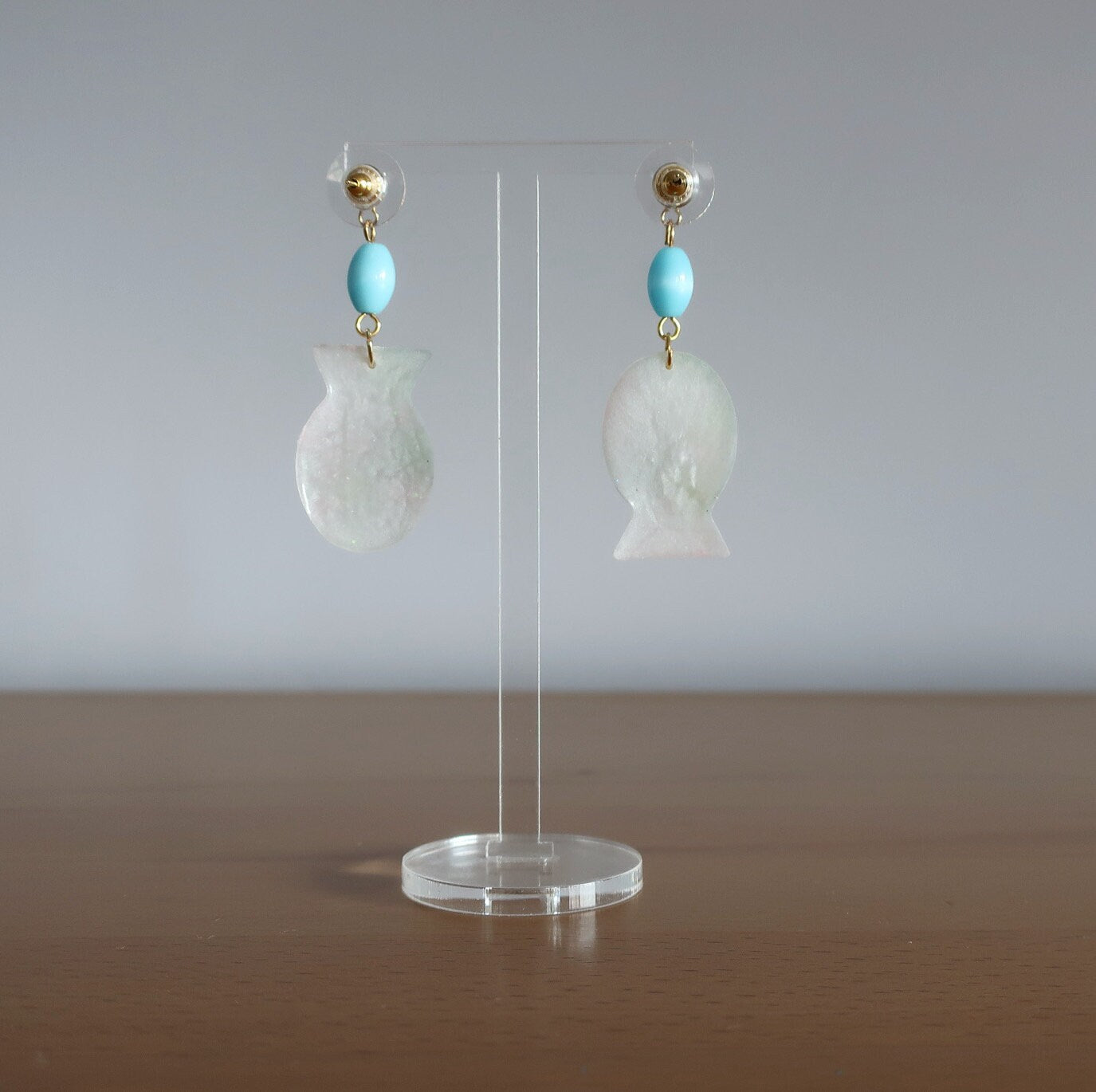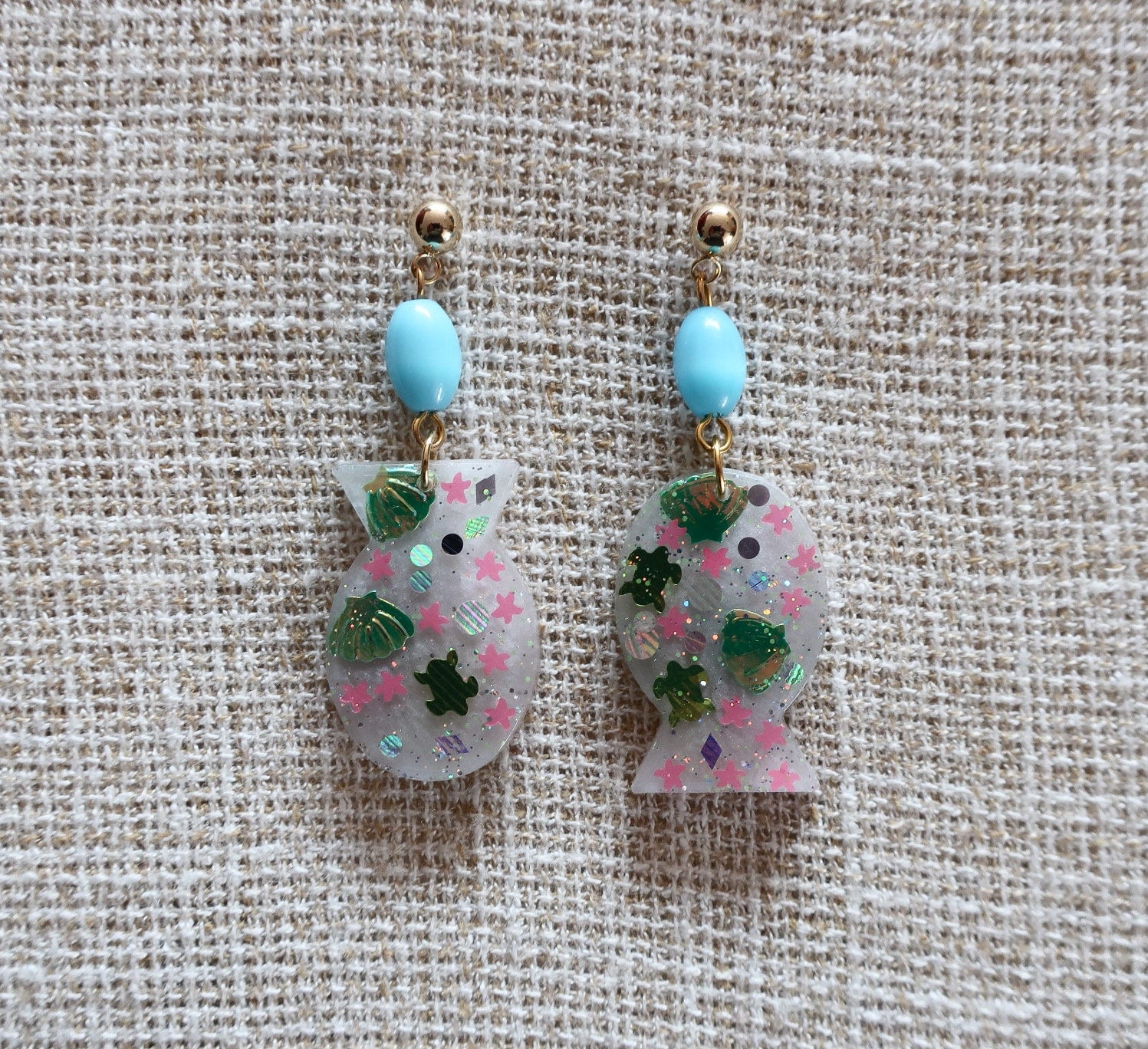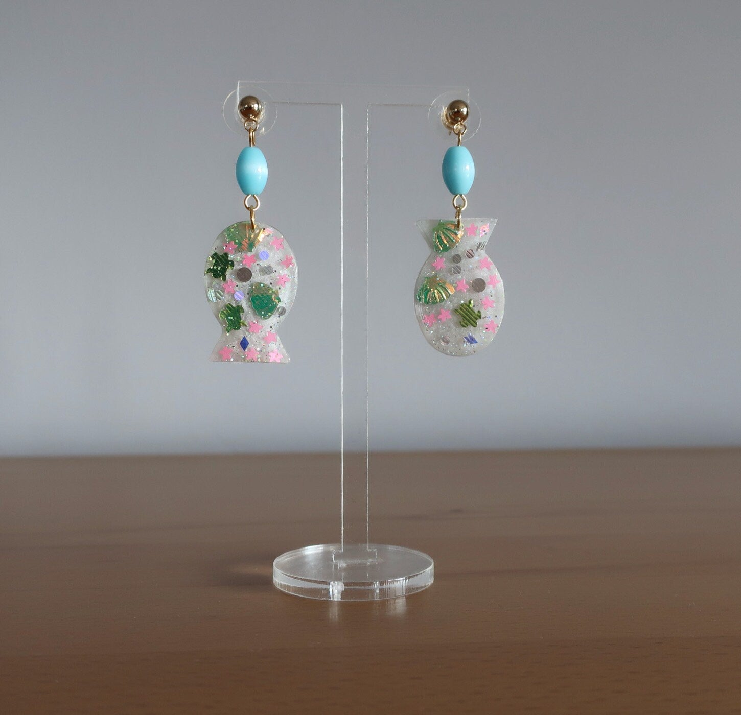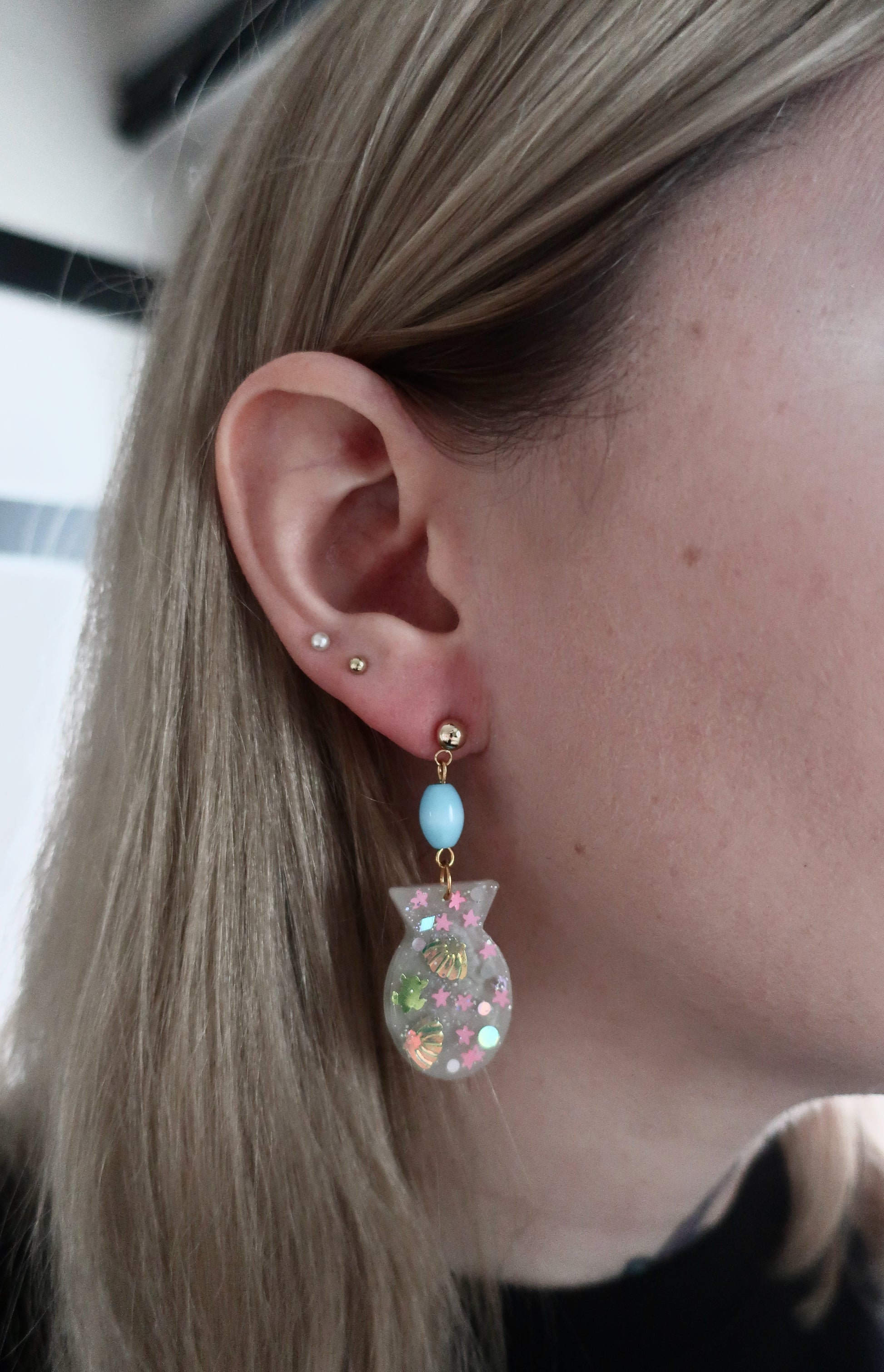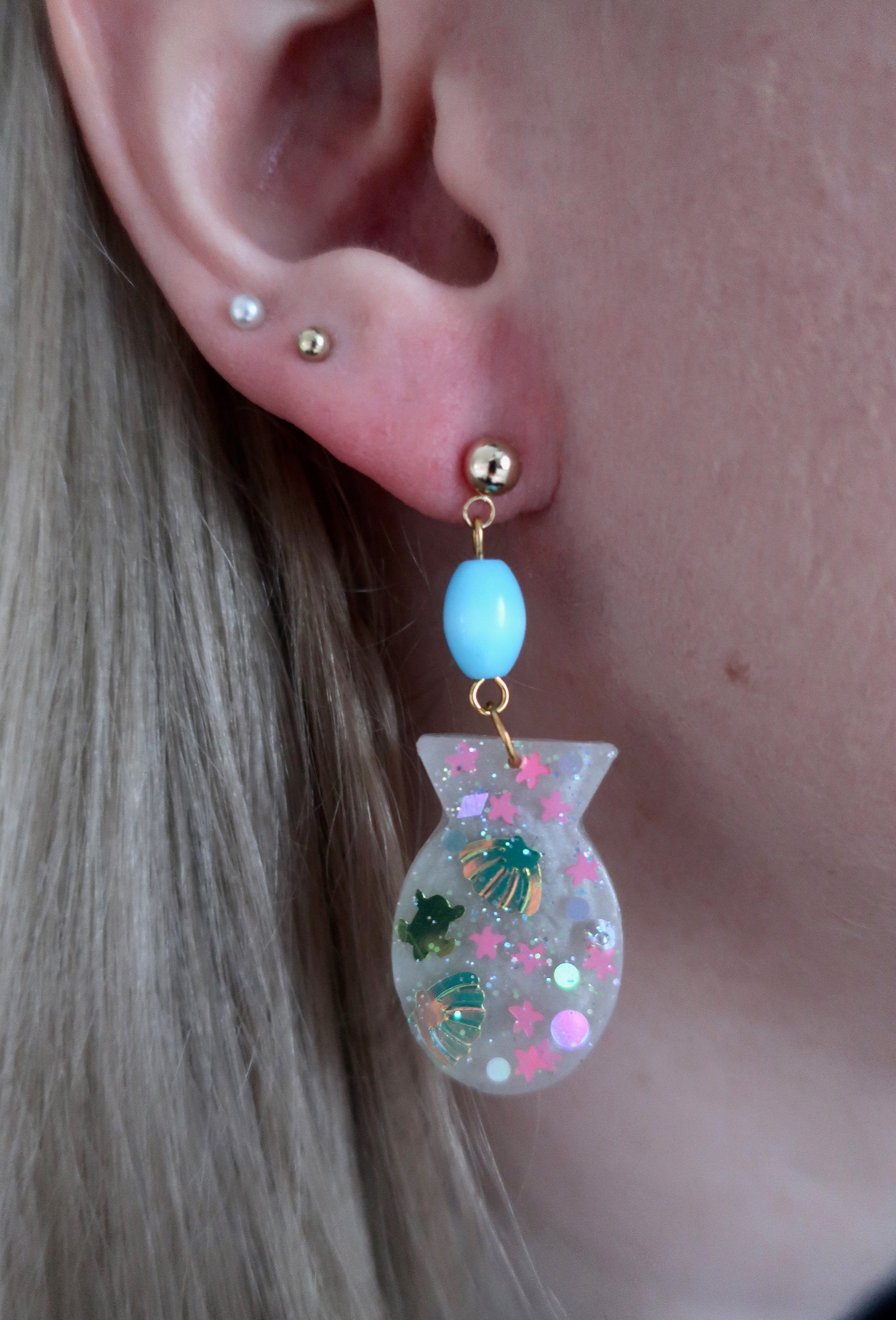 Materialien: Epoxidharz, Glitzer, Glasperlen, Edelstahlstecker, Ösenstifte, Binderinge
