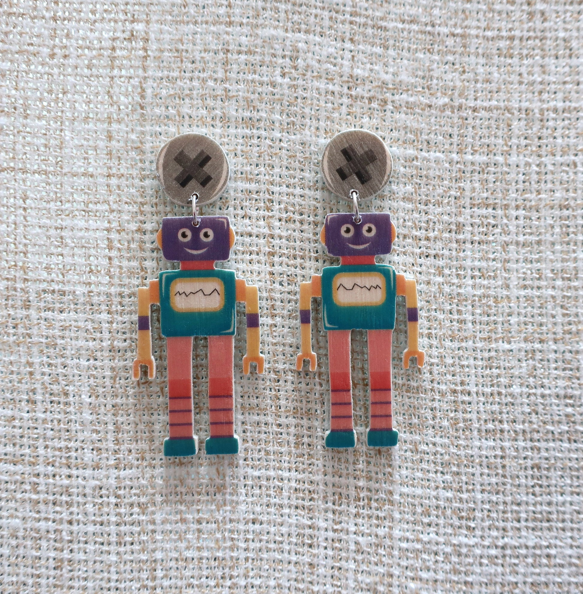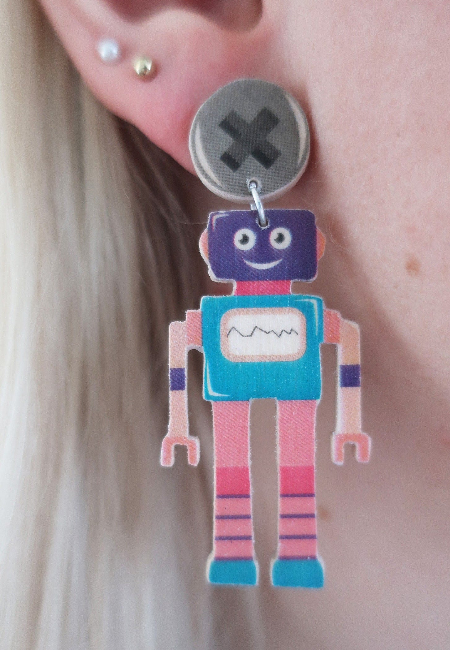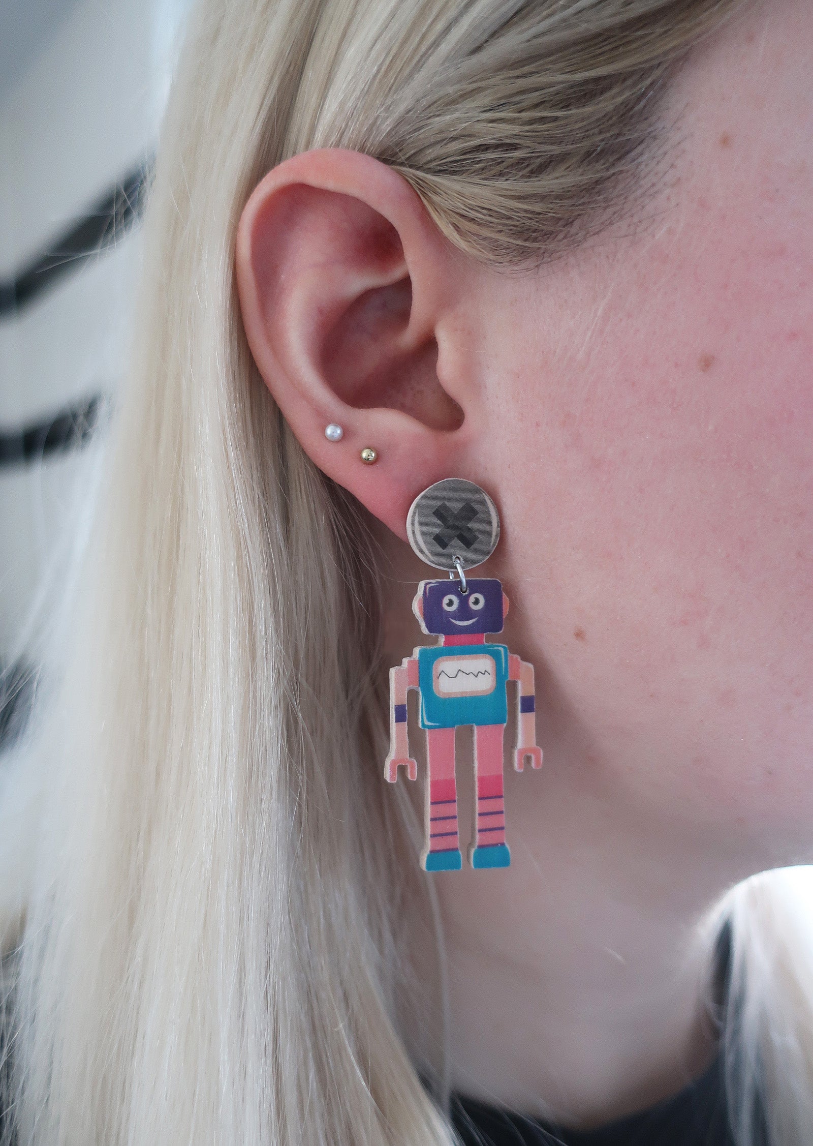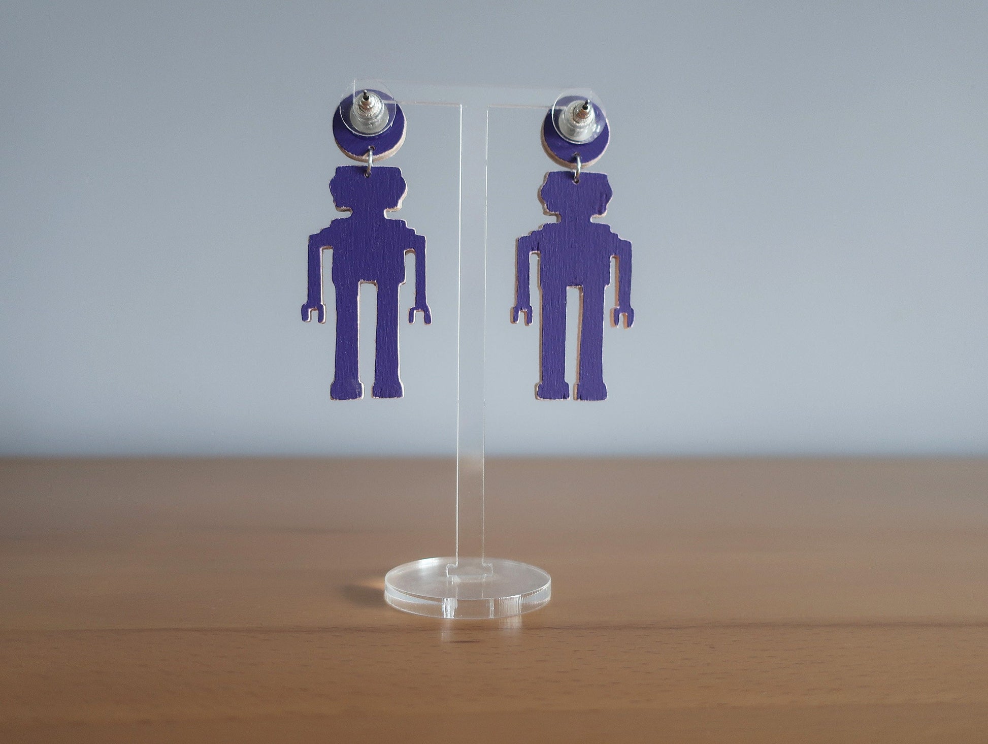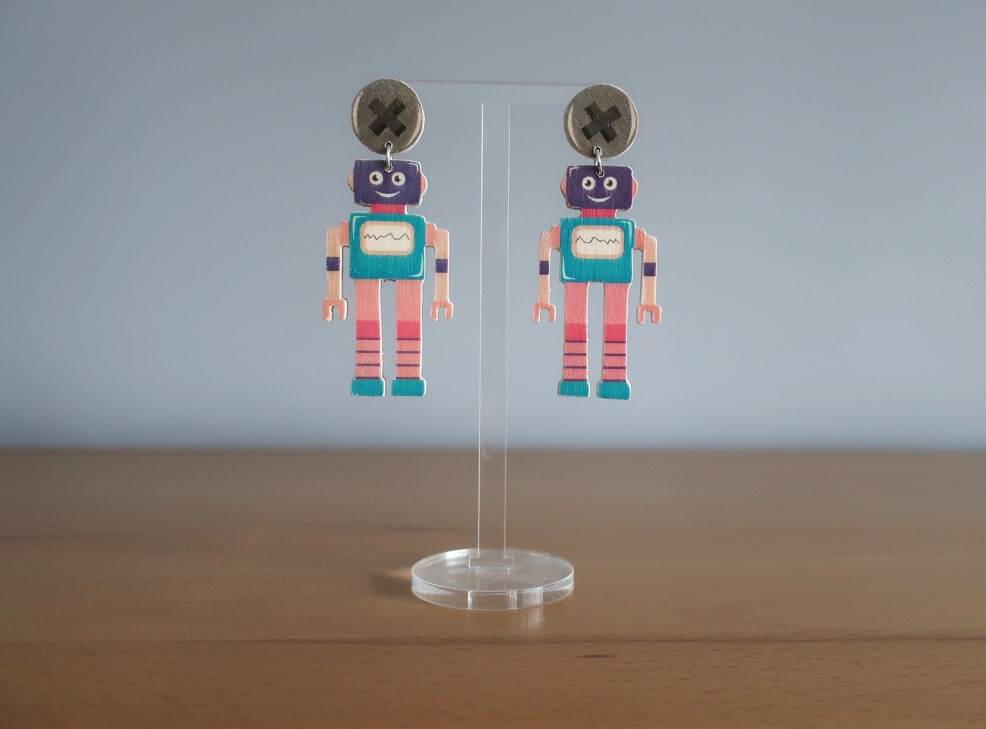 Für diese Ohrringe habe ich eine Zeichnung am Computer erstellt, die ich anschließend manuell auf Birkenholz übertragen und dann mit einer Dekupiersäge ausgesägt habe. Um die Haltbarkeit zu verbessern wurde eine Schicht matter Lack aufgetragen.