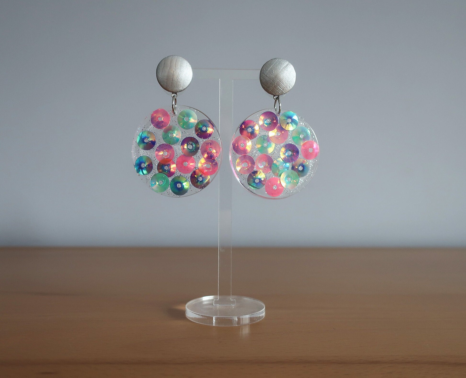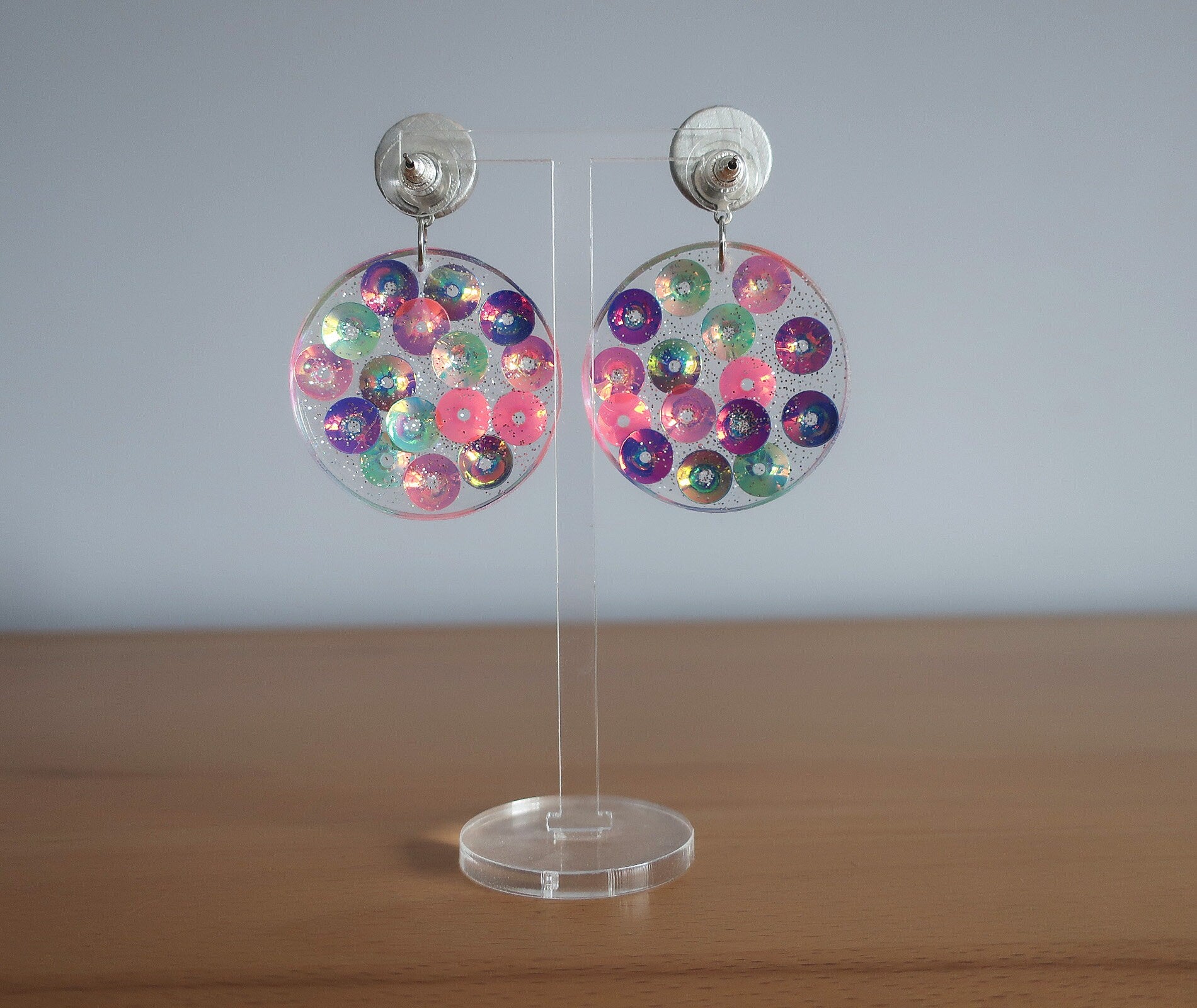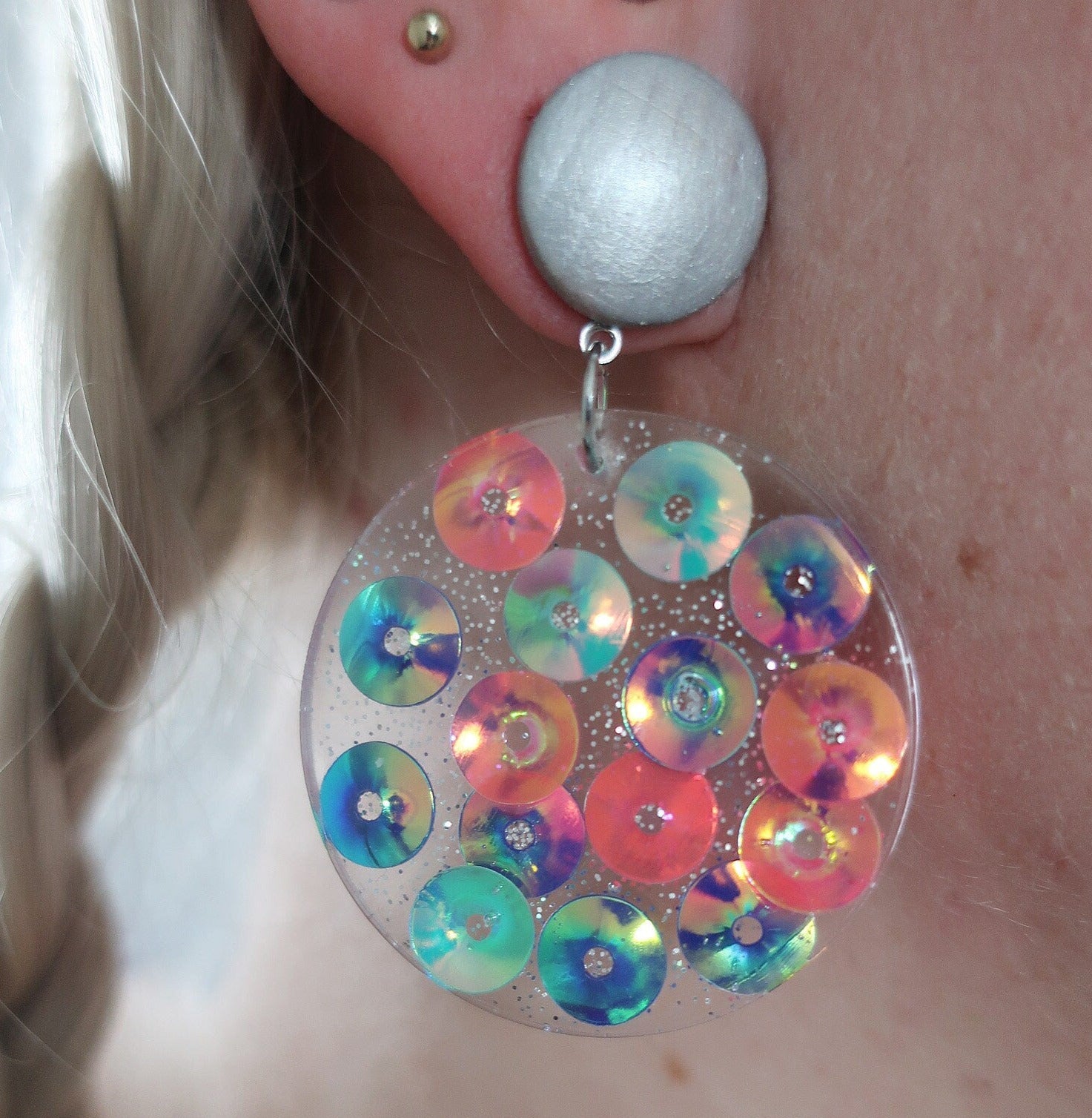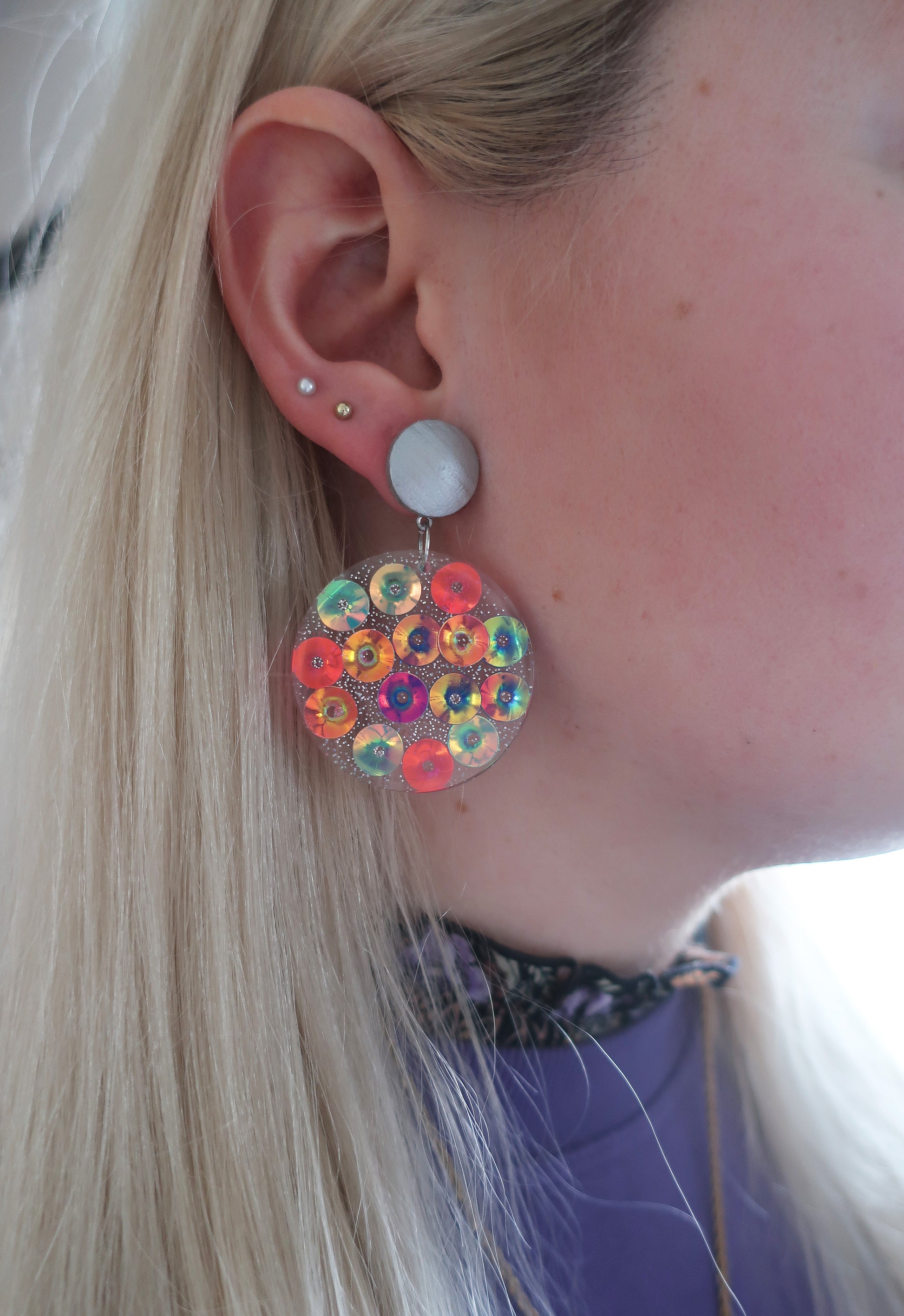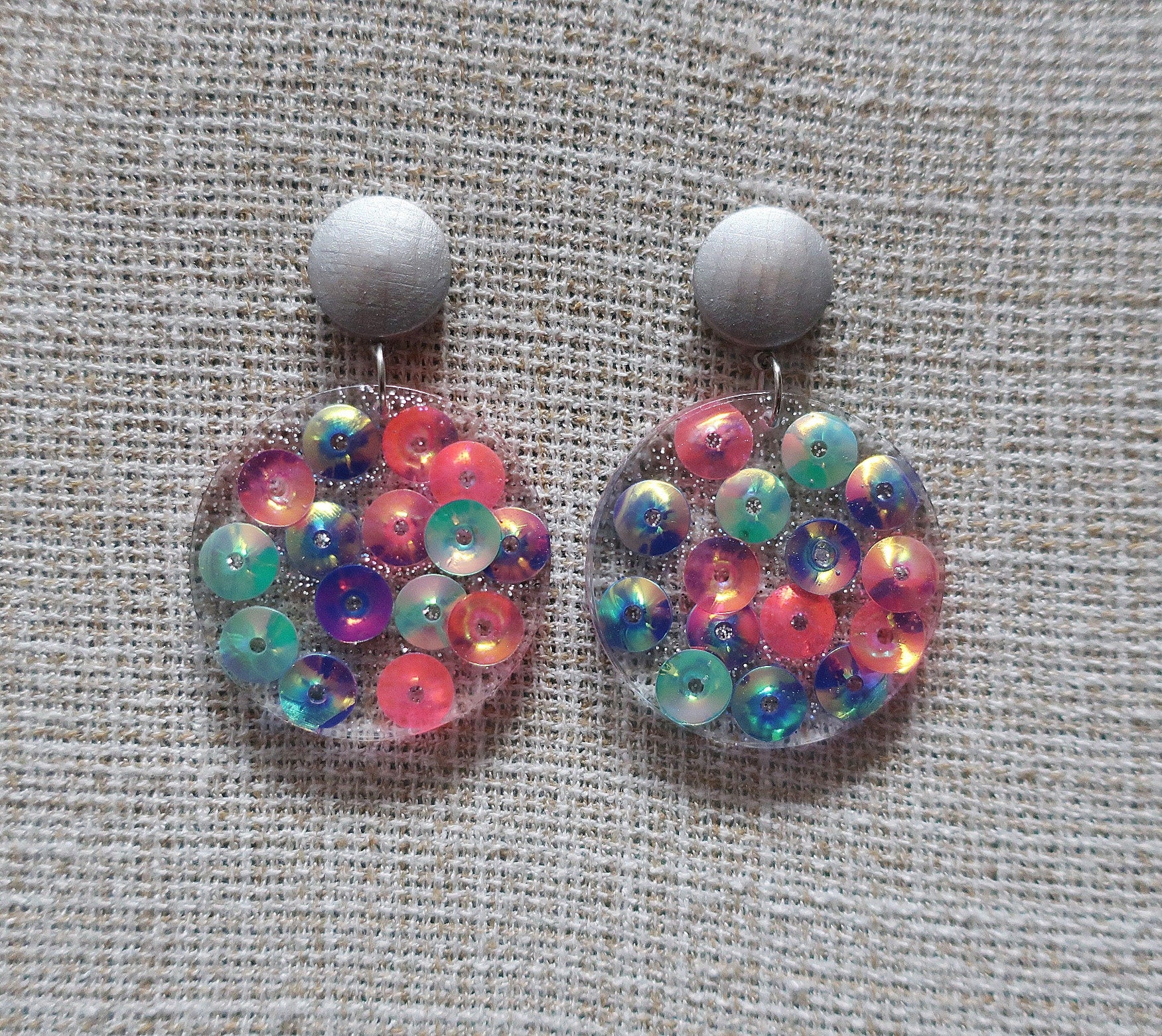 Ich habe diese Ohrringe aus Epoxidharz und bunten Pailletten und Glitzer hergestellt.