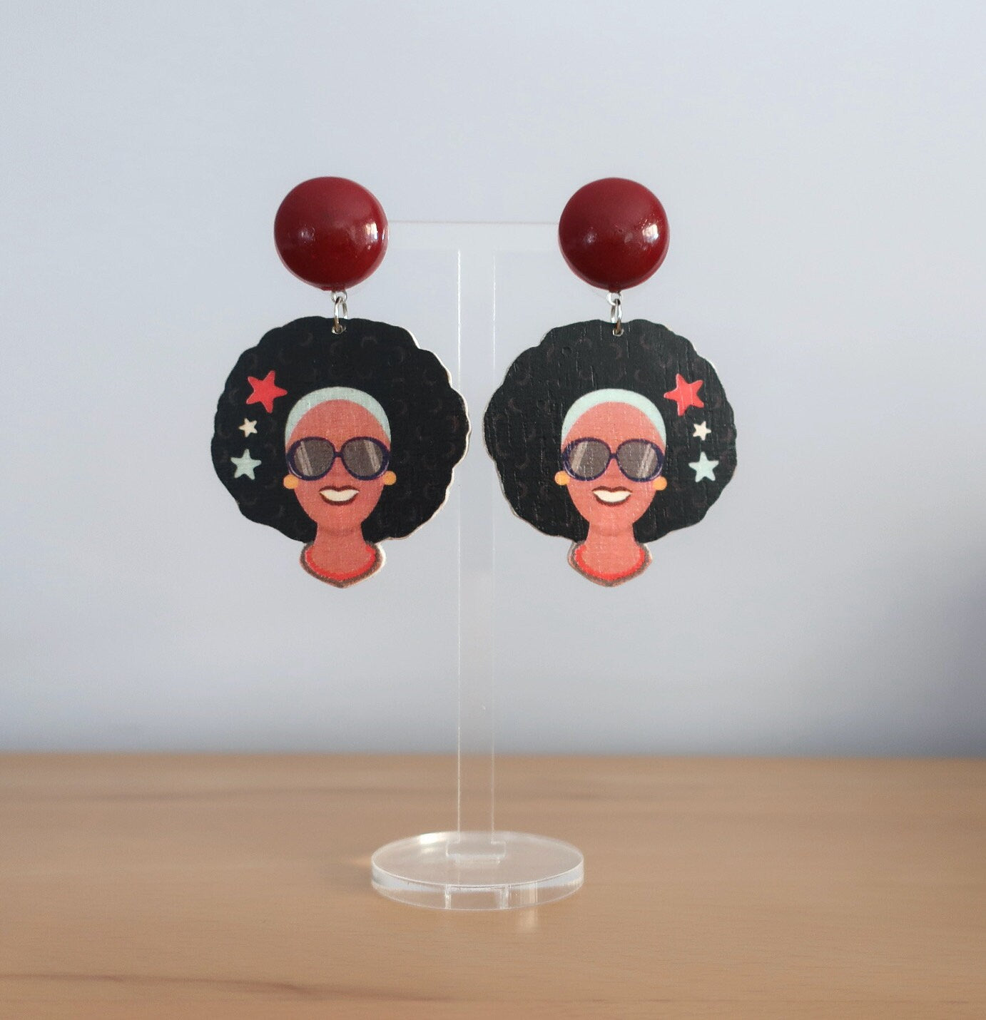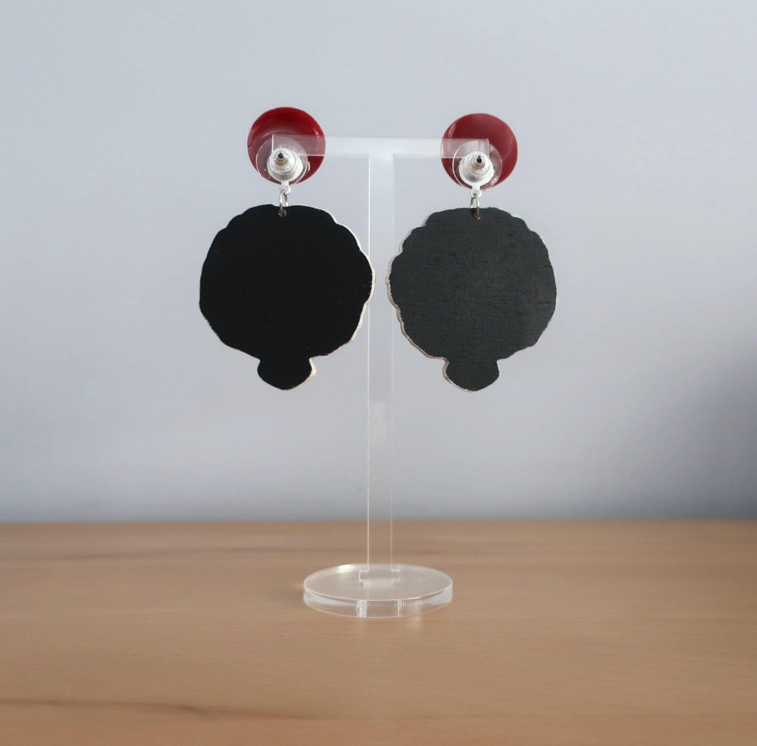 Für diese Ohrringe habe ich eine Zeichnung am Computer erstellt, die ich anschließend manuell auf Birkenholz übertragen und dann mit einer Dekupiersäge ausgesägt habe. Um die Haltbarkeit zu verbessern wurde eine Schicht matter Lack aufgetragen.