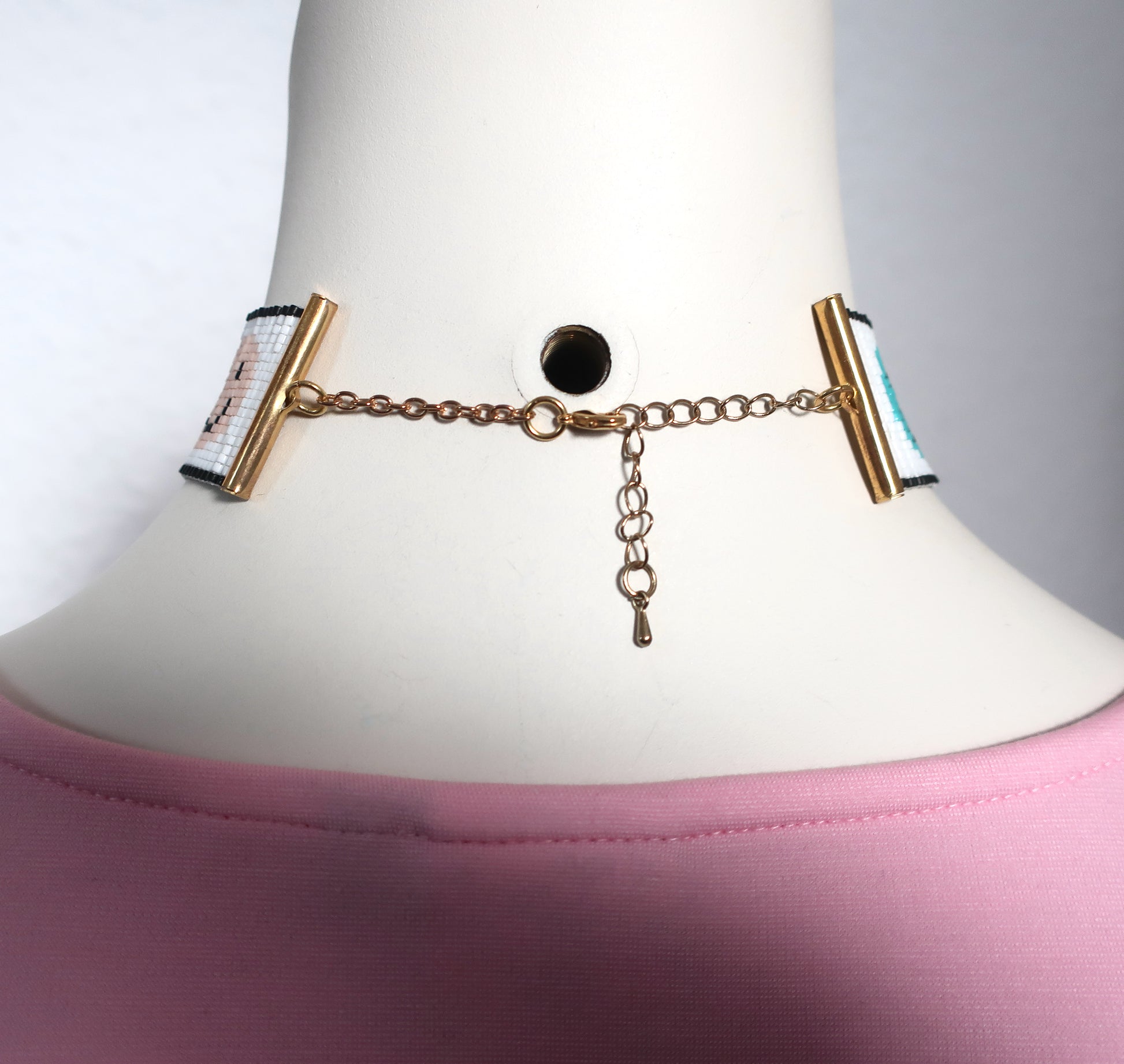 Dies ist ein handgewebter Choker aus hochwertigen japanischen Miyuki-Perlen. Er hat goldfarbene Röhrenenden, ein Kettchen mit Karabinerhaken als Verschluss und eine 5,5 cm lange Verlängerungskette. Es ist 2,6 cm breit.