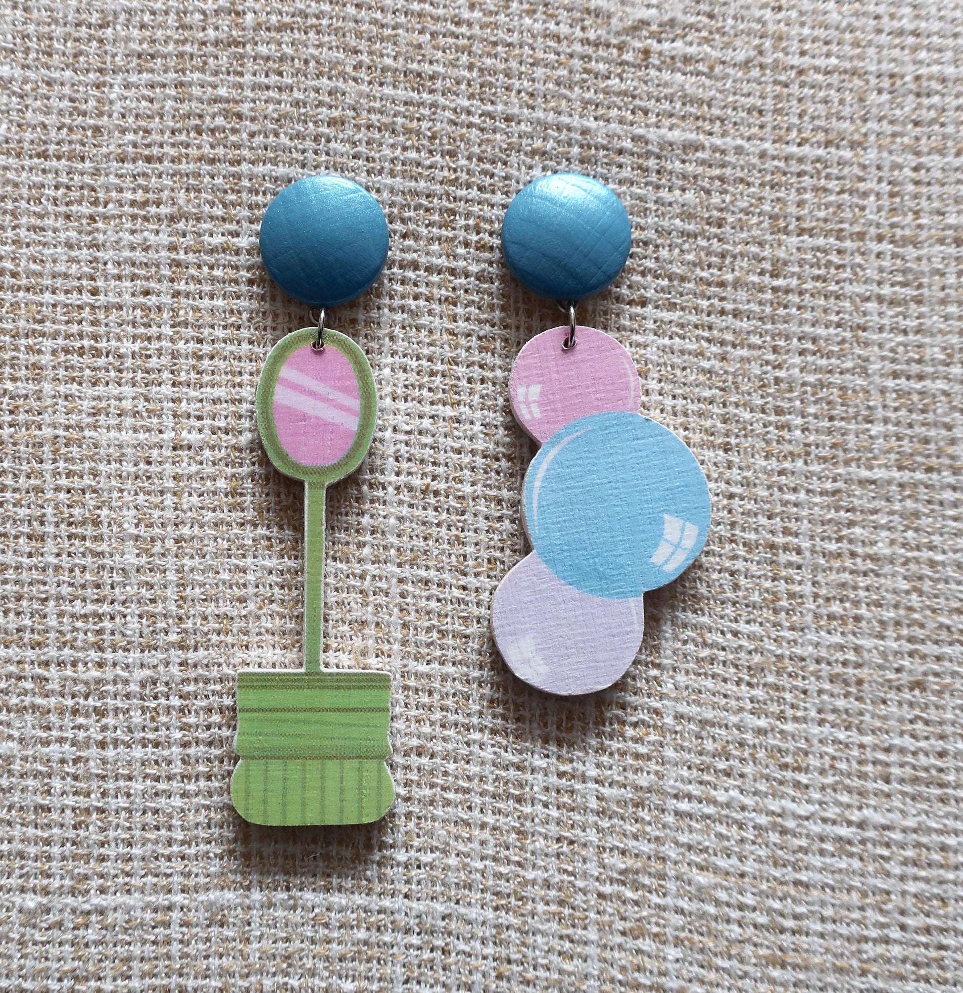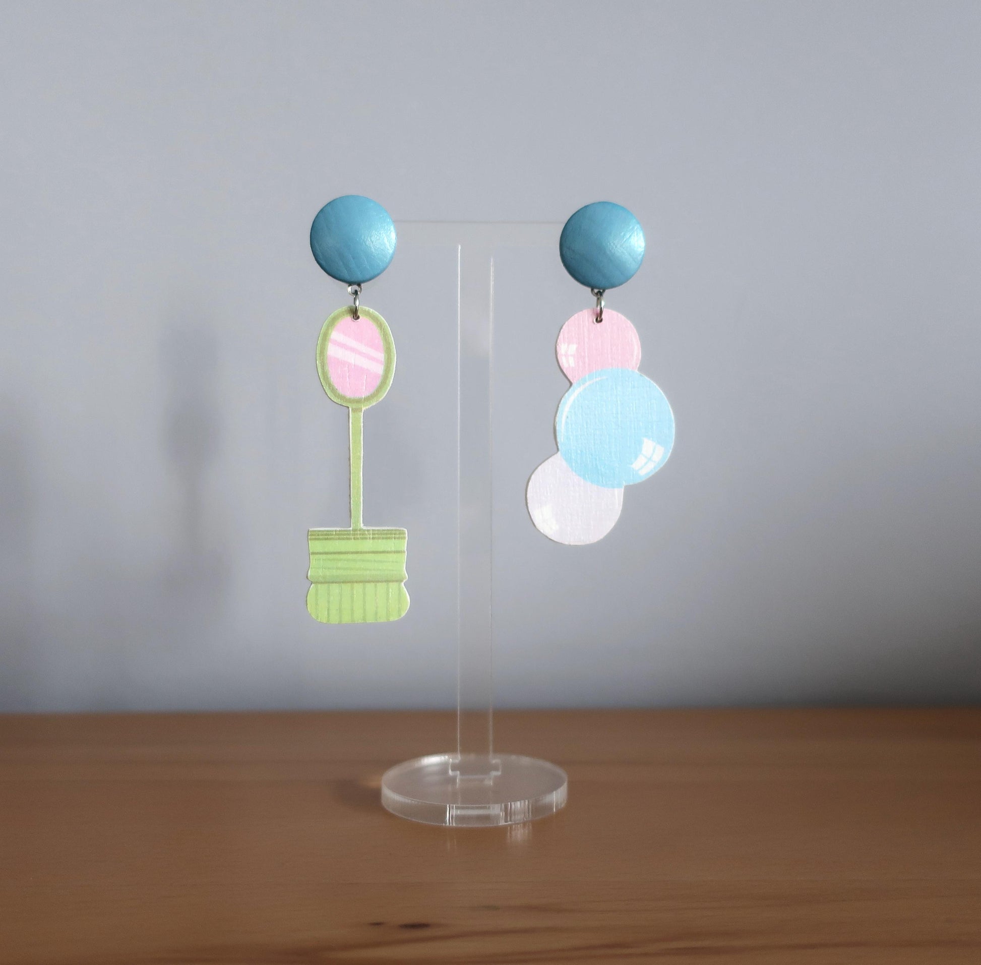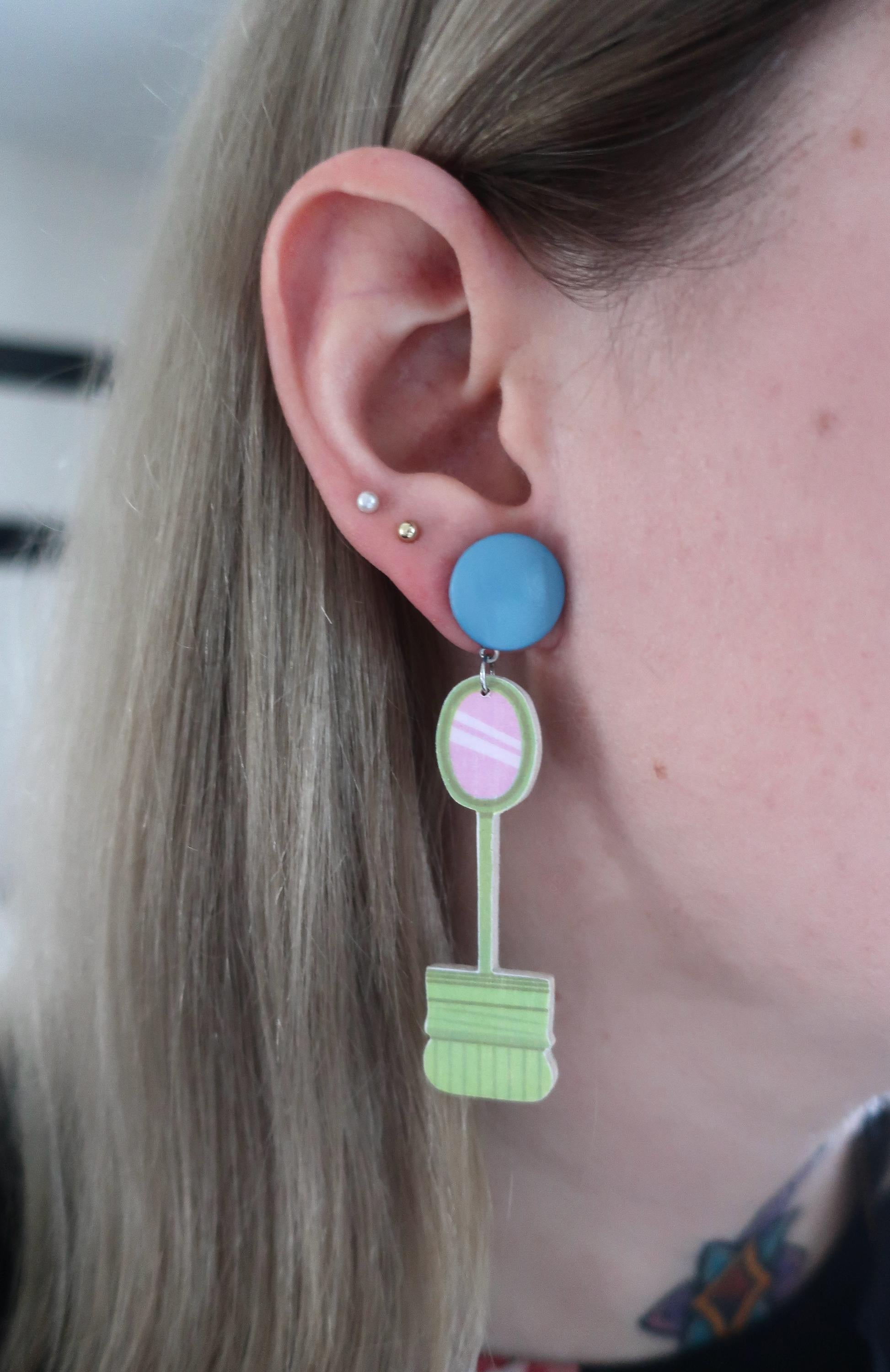 Die Stecker wurden aus mit Acrylfarbe bemalten Holzcabochons und Edelstahlsteckern gefertigt.