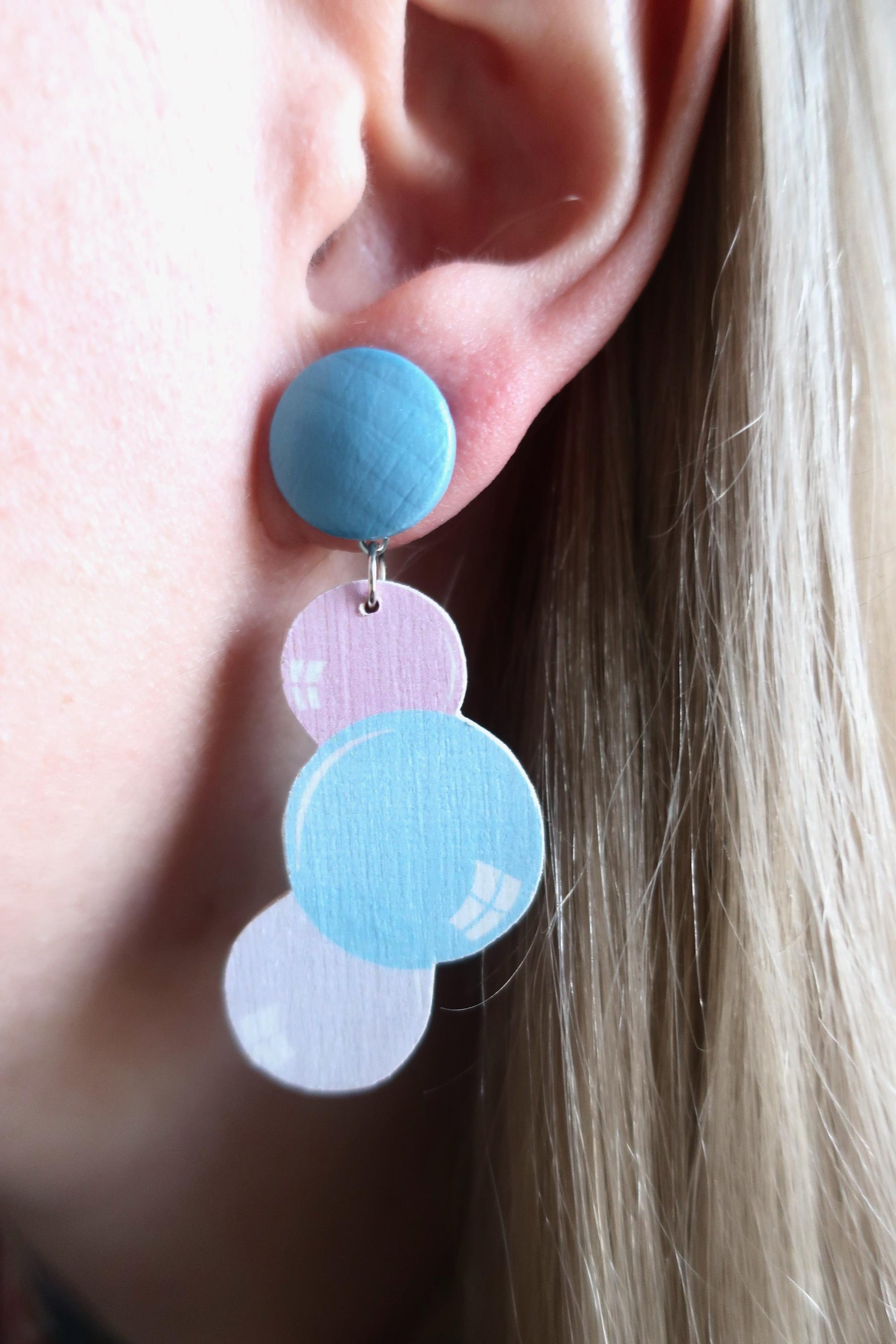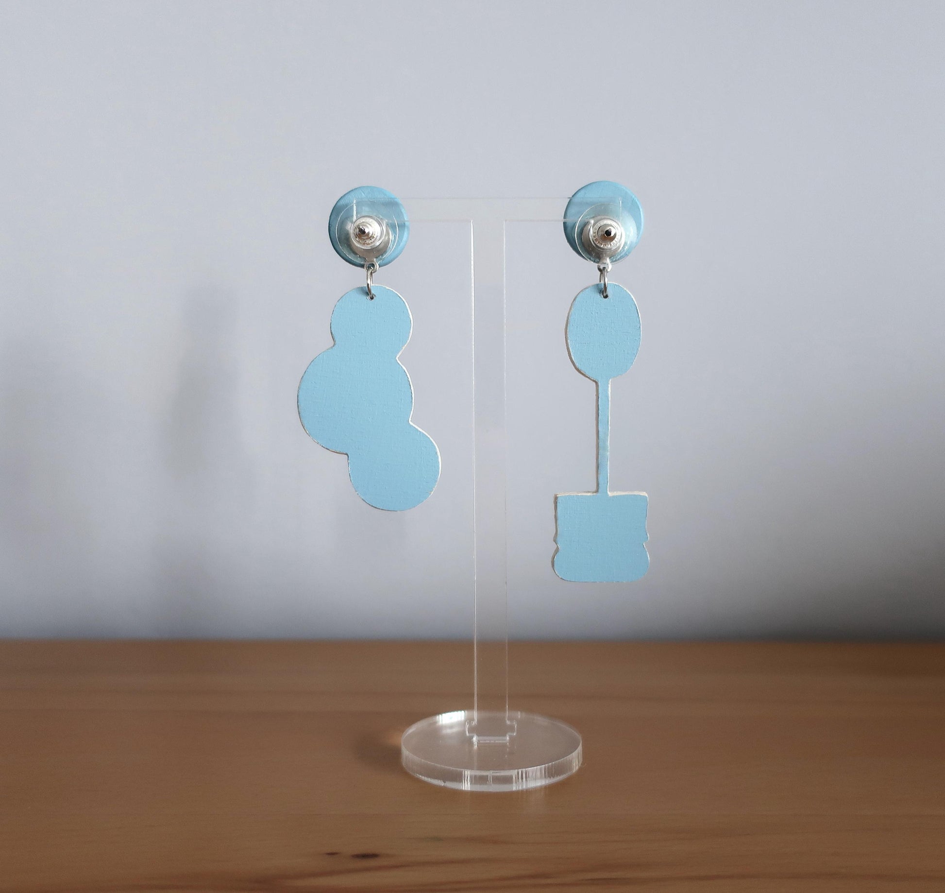 Für diese Ohrringe habe ich eine Zeichnung am Computer erstellt, die ich anschließend manuell auf Birkenholz übertragen und dann mit einer Dekupiersäge ausgesägt habe. Um die Haltbarkeit zu verbessern wurde eine Schicht matter Lack aufgetragen.