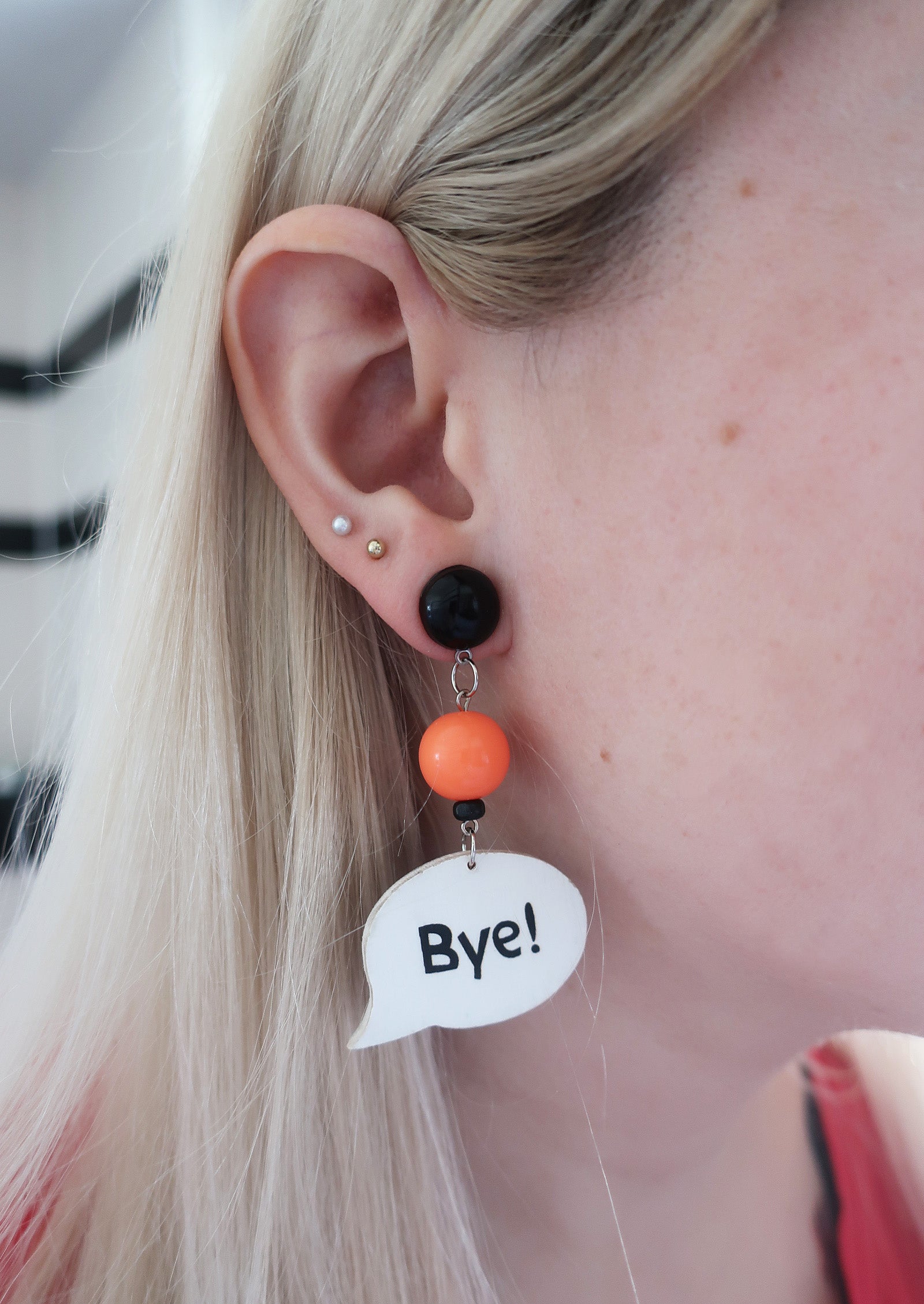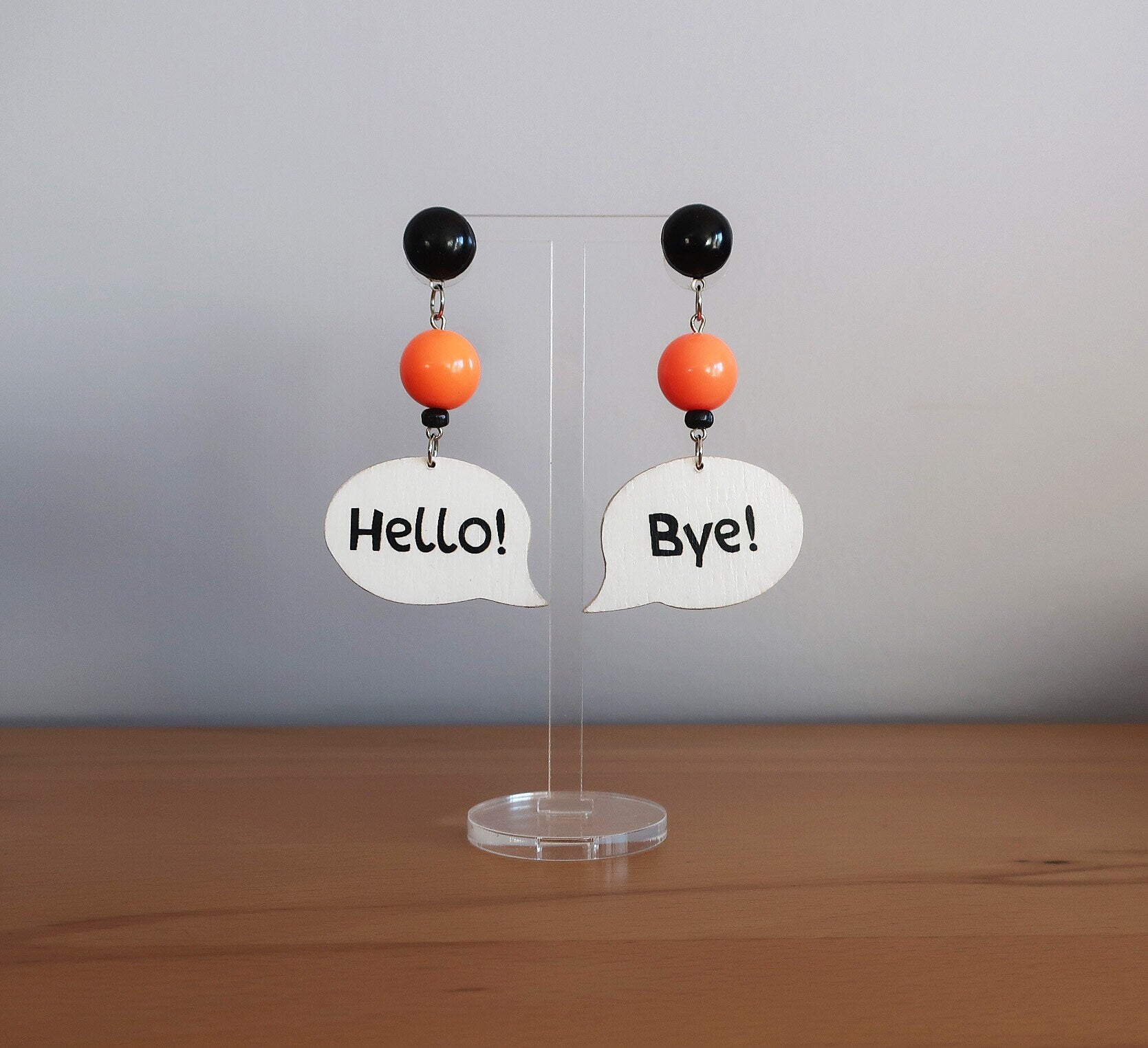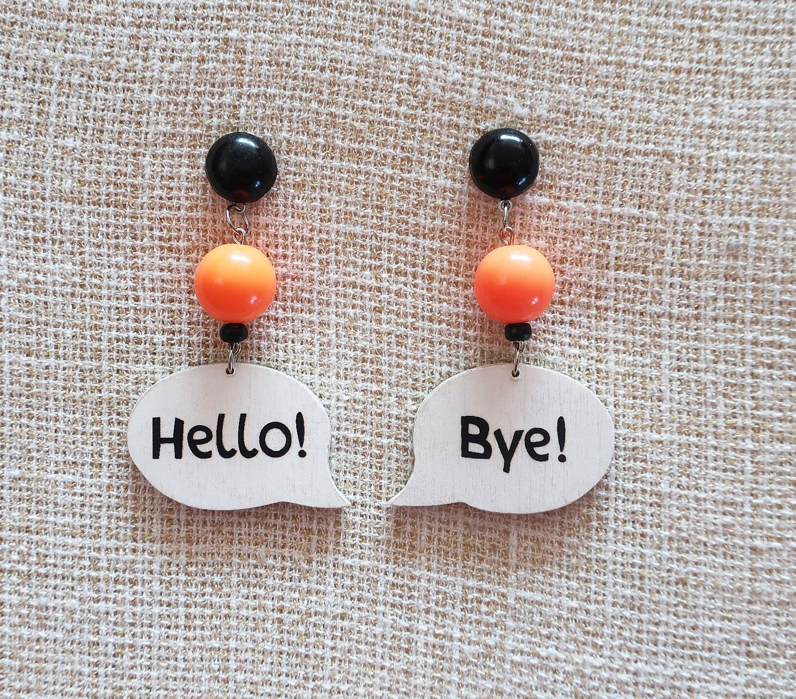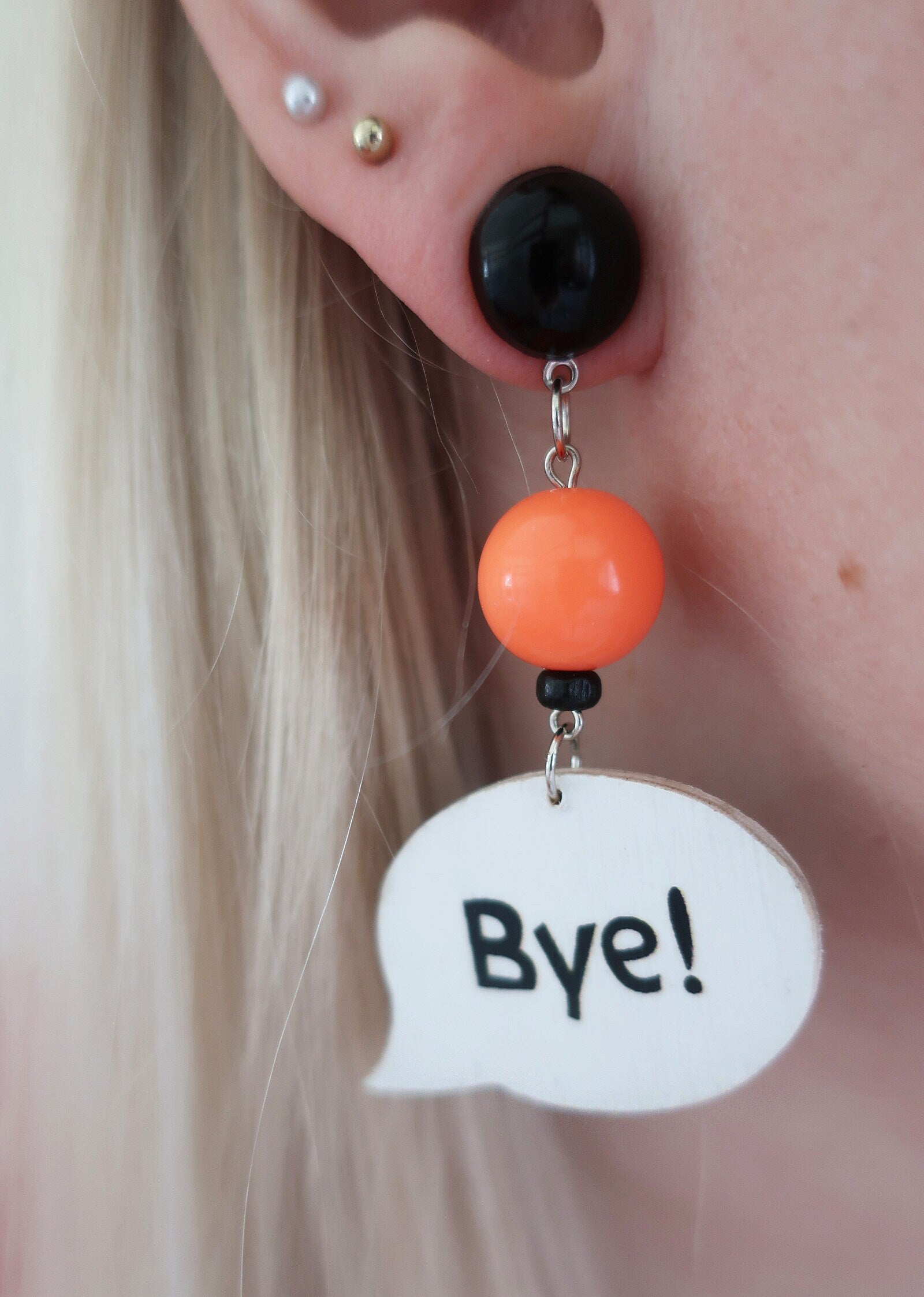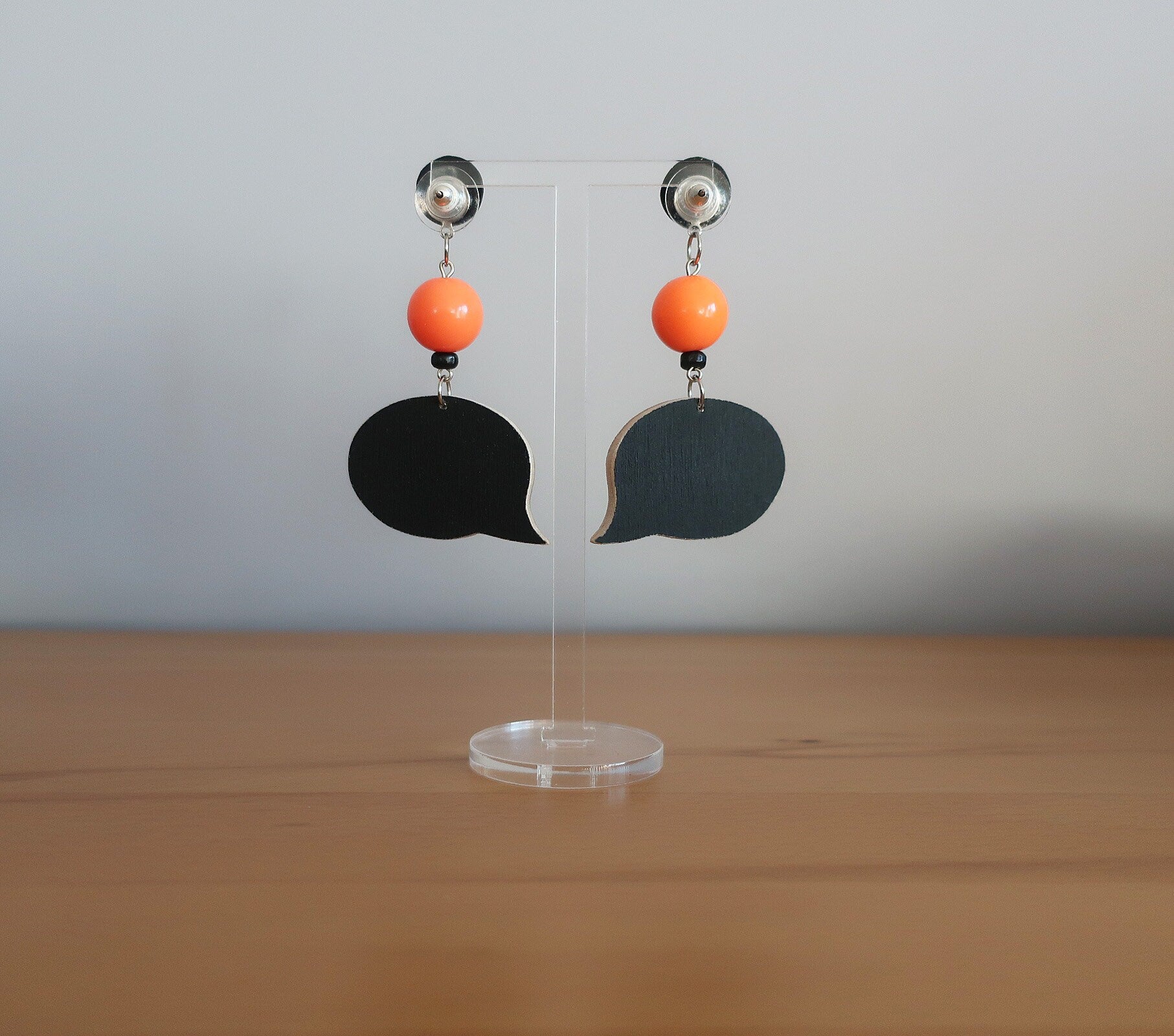 Für diese Ohrringe habe ich eine Zeichnung am Computer erstellt, die ich anschließend manuell auf Birkenholz übertragen und dann mit einer Dekupiersäge ausgesägt habe. Um die Haltbarkeit zu verbessern wurde eine Schicht matter Lack aufgetragen. Eine orange Plastikperle peppt das Design auf. Die Stecker wurden aus gefärbtem Epoxidharz und Edelstahlsteckern gefertigt.