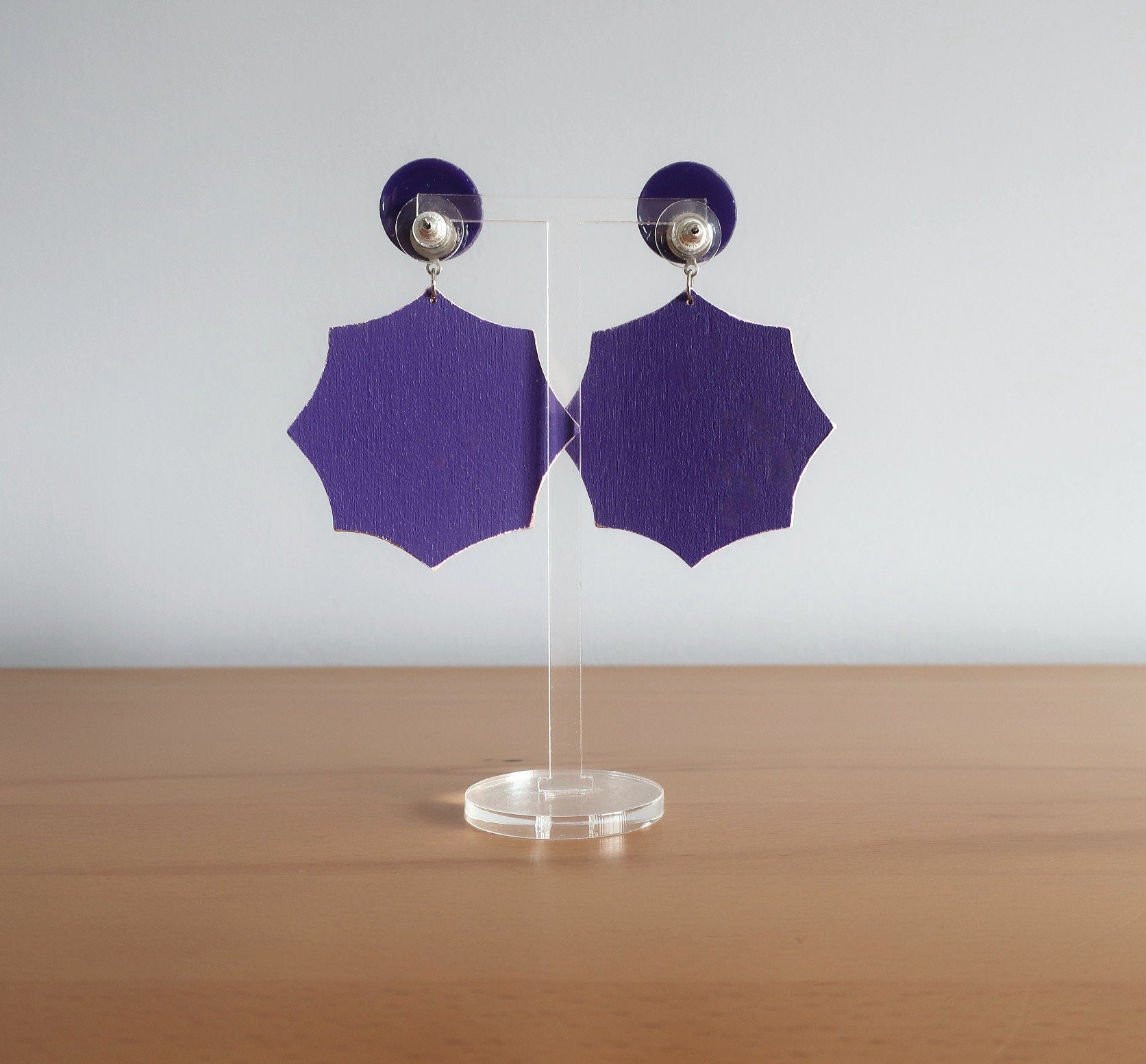 Für diese Ohrringe habe ich eine Zeichnung am Computer erstellt, die ich anschließend manuell auf Birkenholz übertragen und dann mit einer Dekupiersäge ausgesägt habe. Um die Haltbarkeit zu verbessern wurde eine Schicht matter Lack aufgetragen.