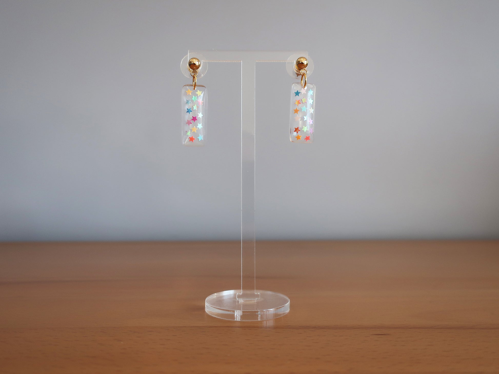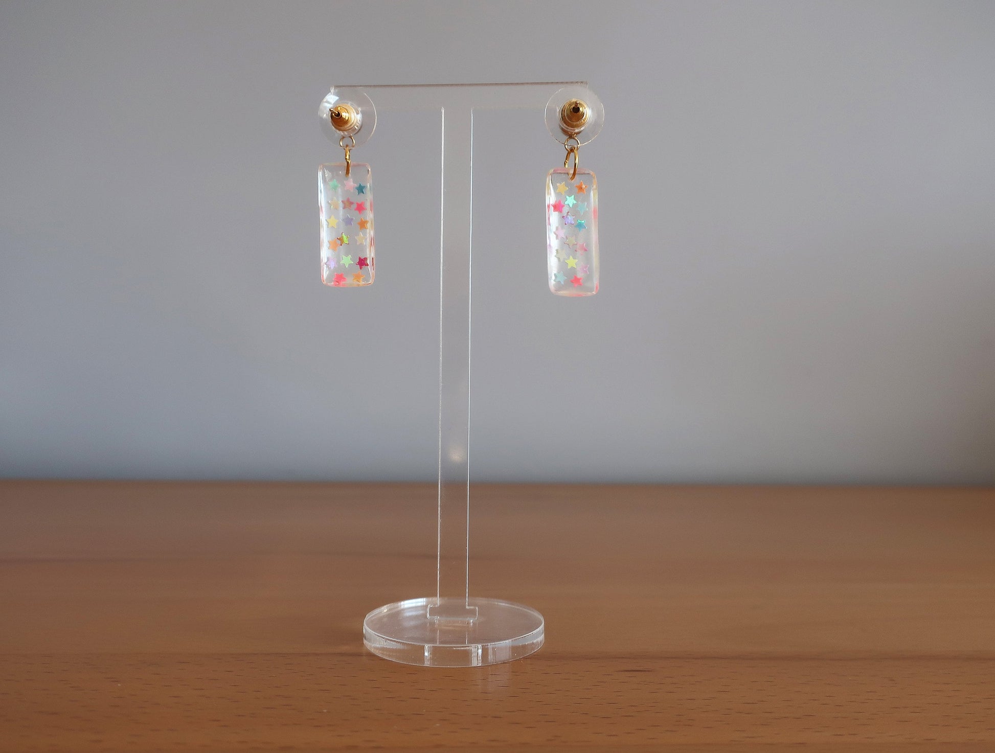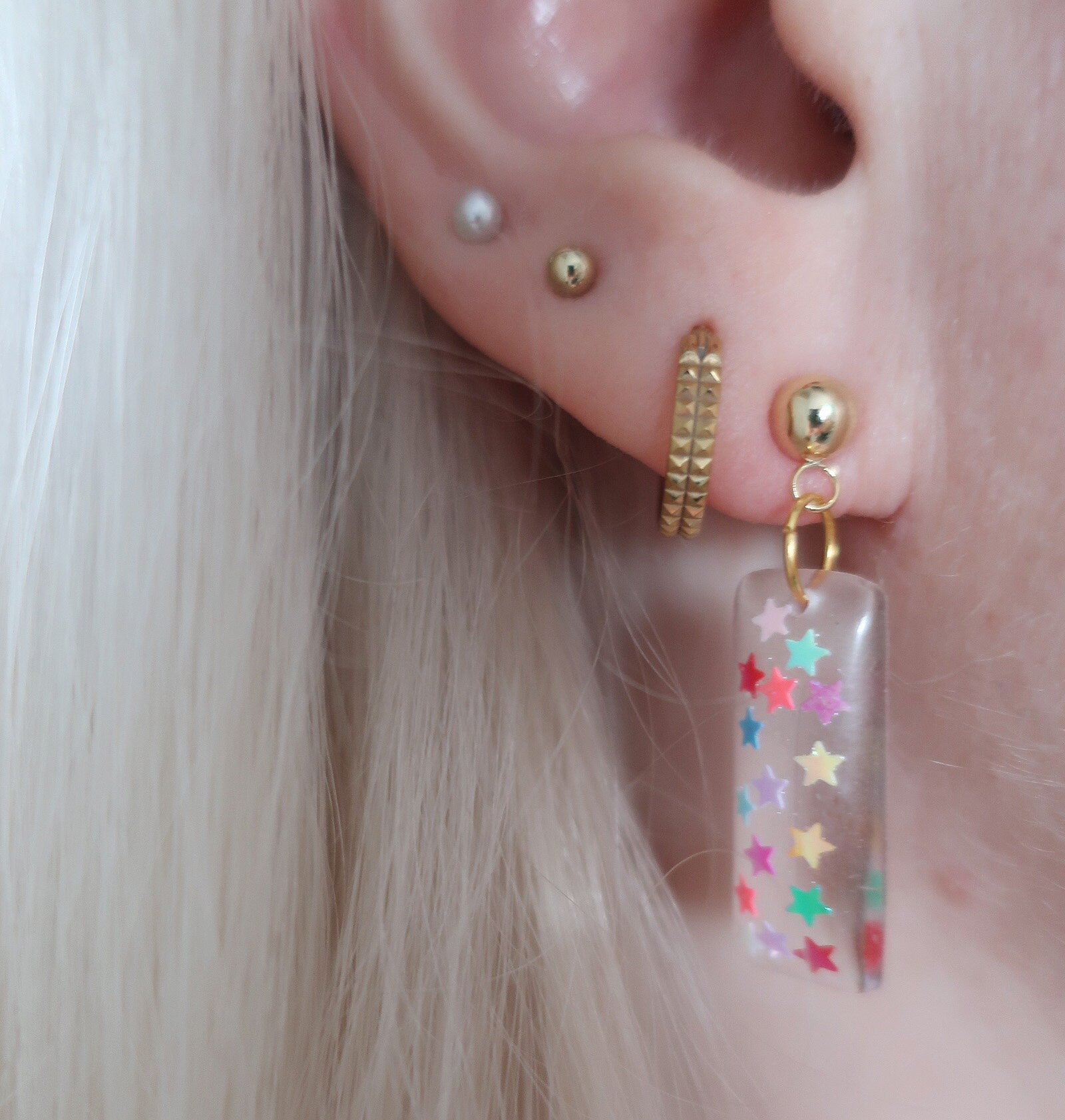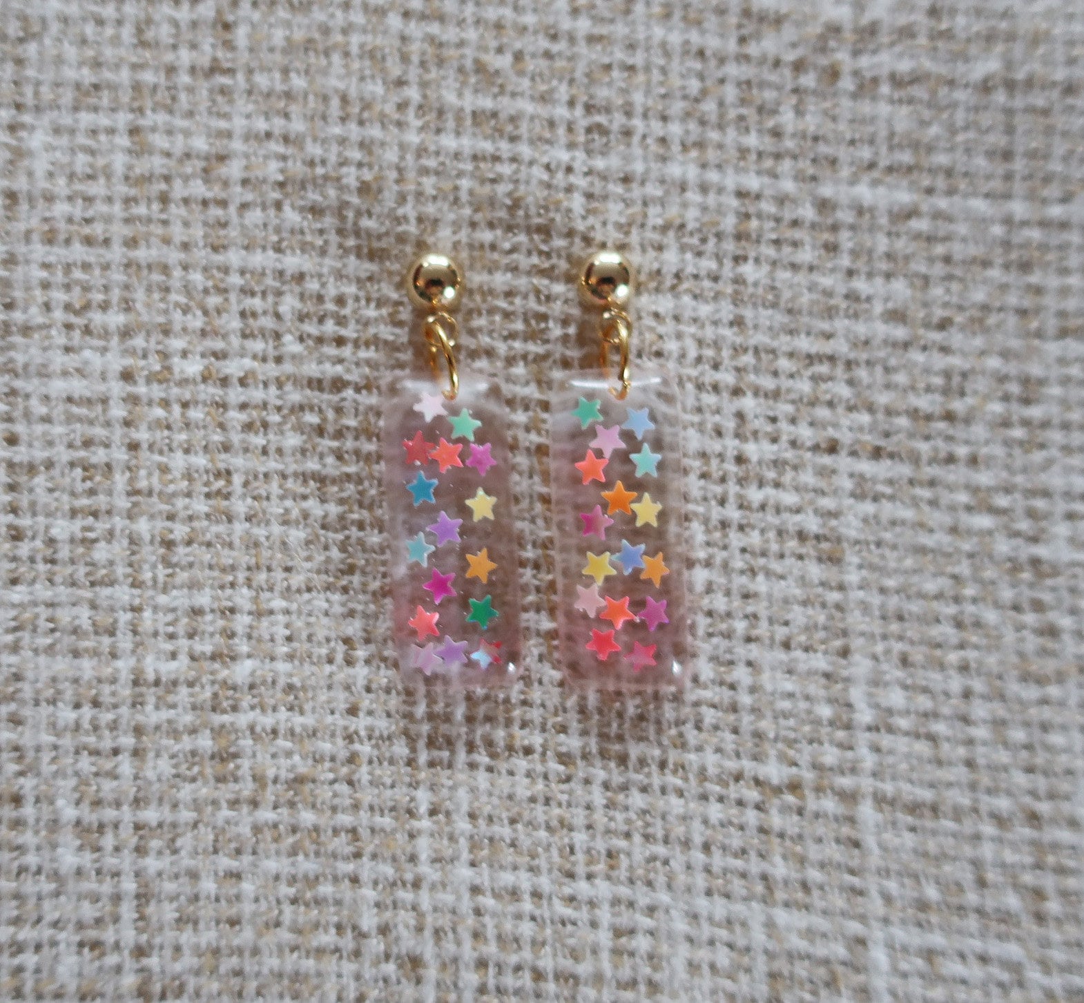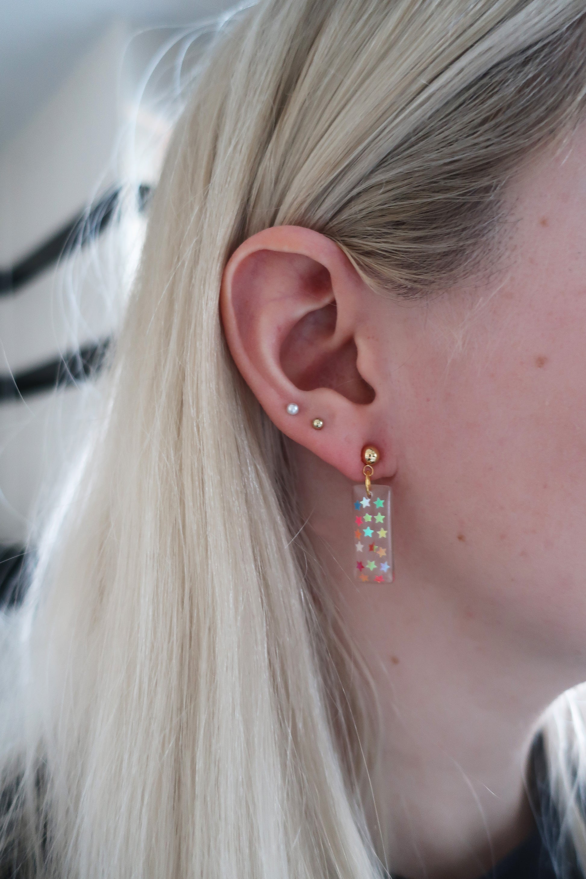 Ich habe diese Ohrringe aus Epoxidharz und Glitter hergestellt.