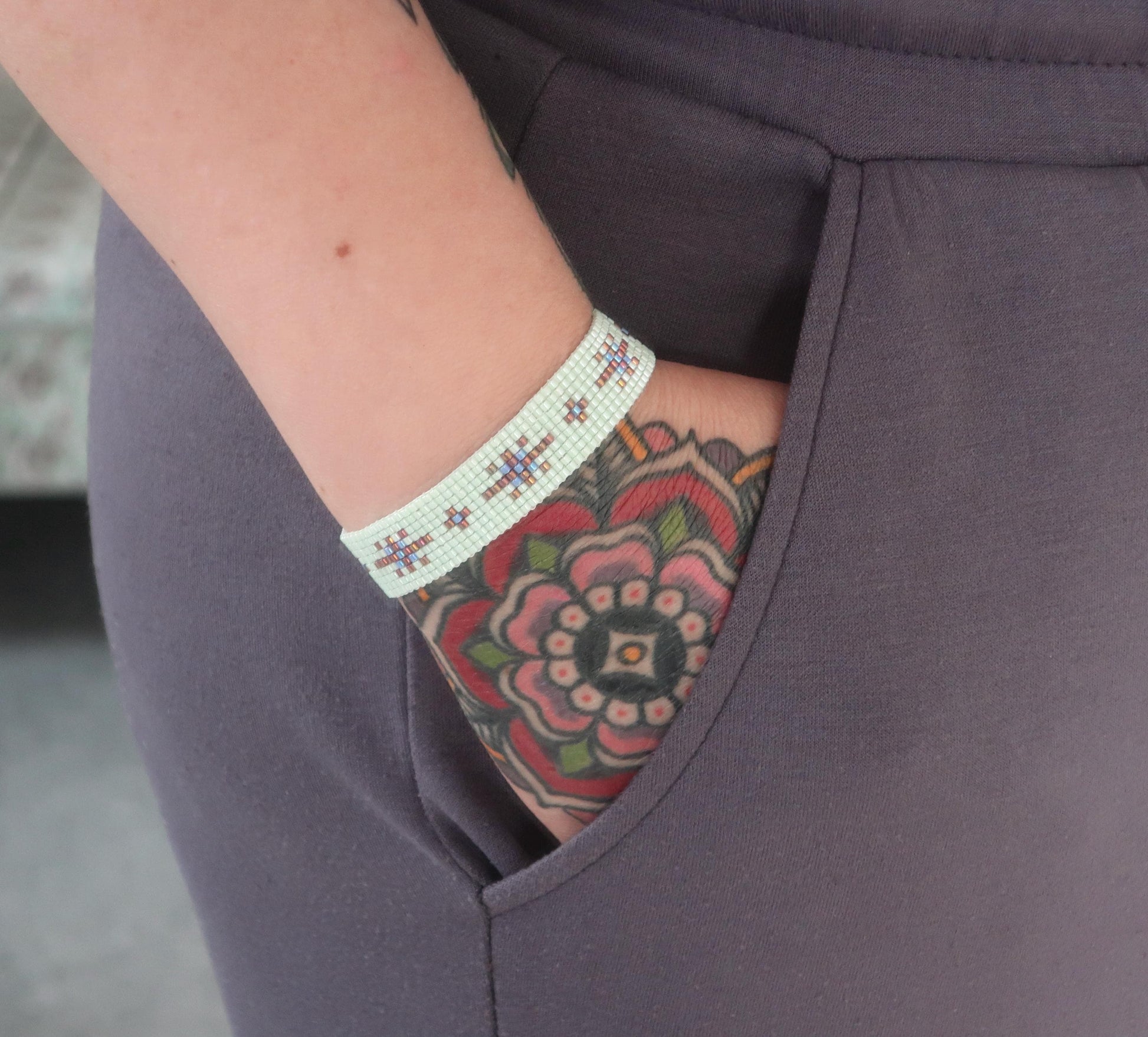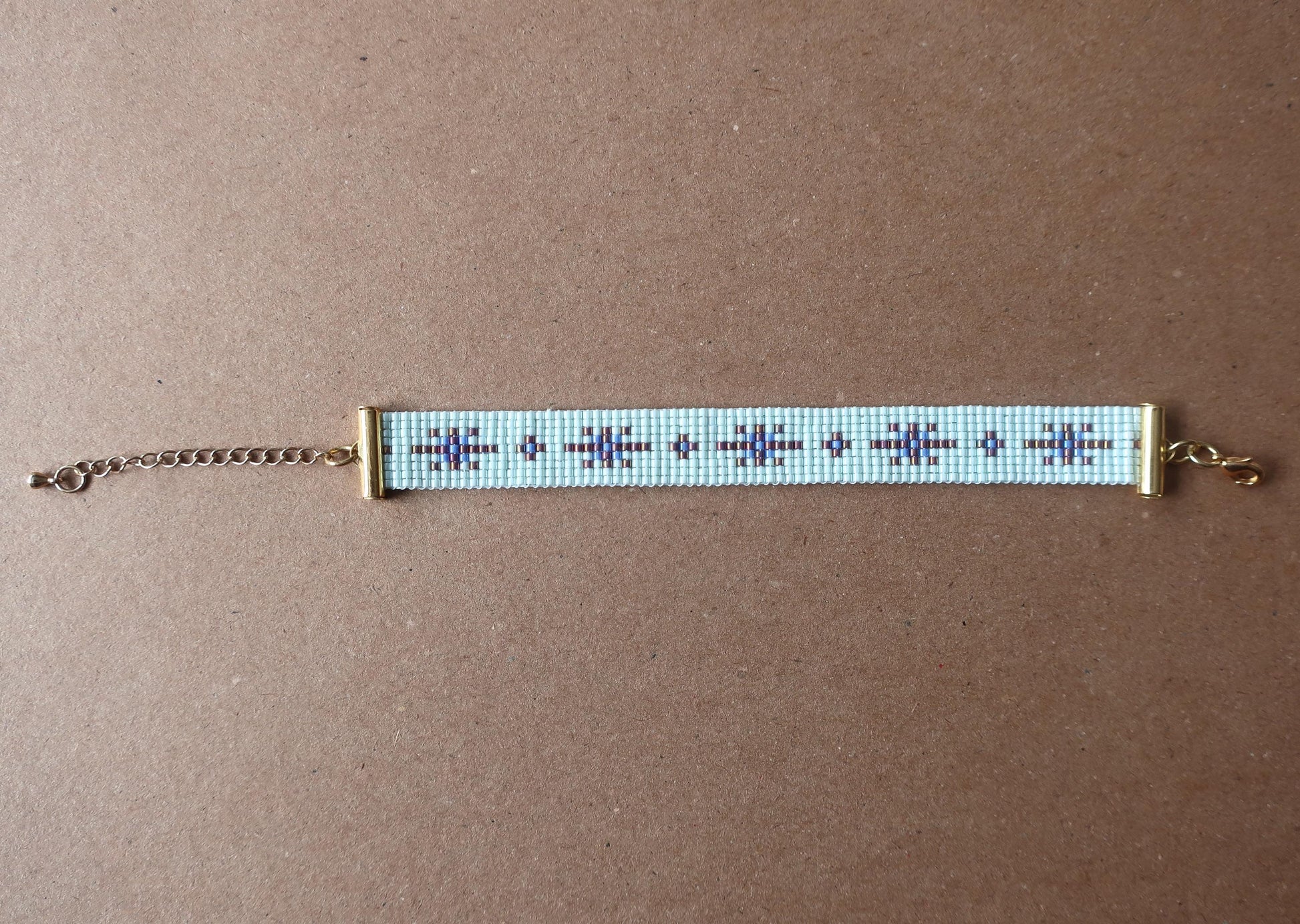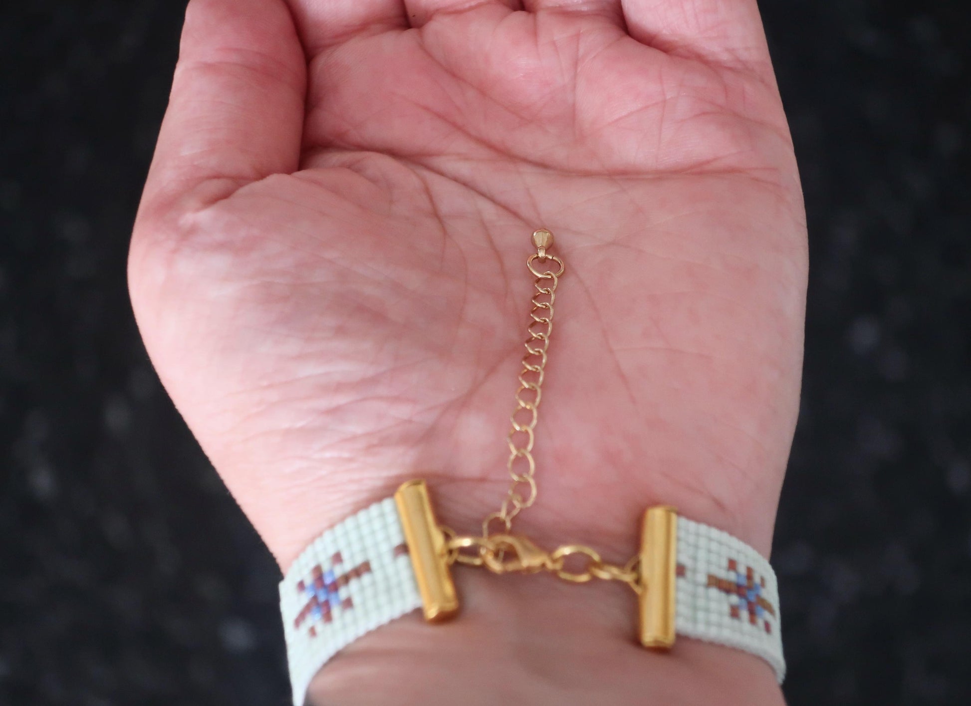 Dies ist ein handgewebtes Armband mit hochwertigen japanischen Miyuki-Perlen. Es hat goldfarbene Röhrenenden, einen Karabinerhaken als Verschluss und eine 5,5 cm lange Verlängerungskette. Es ist 1,4 cm breit.