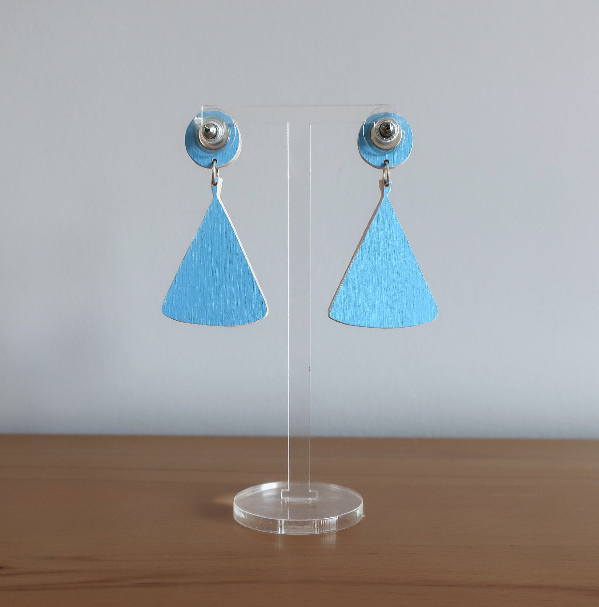 Für diese Ohrringe habe ich eine Zeichnung am Computer erstellt, die ich anschließend manuell auf Birkenholz übertragen und dann mit einer Dekupiersäge ausgesägt habe. Um die Haltbarkeit zu verbessern wurde eine Schicht matter Lack aufgetragen.