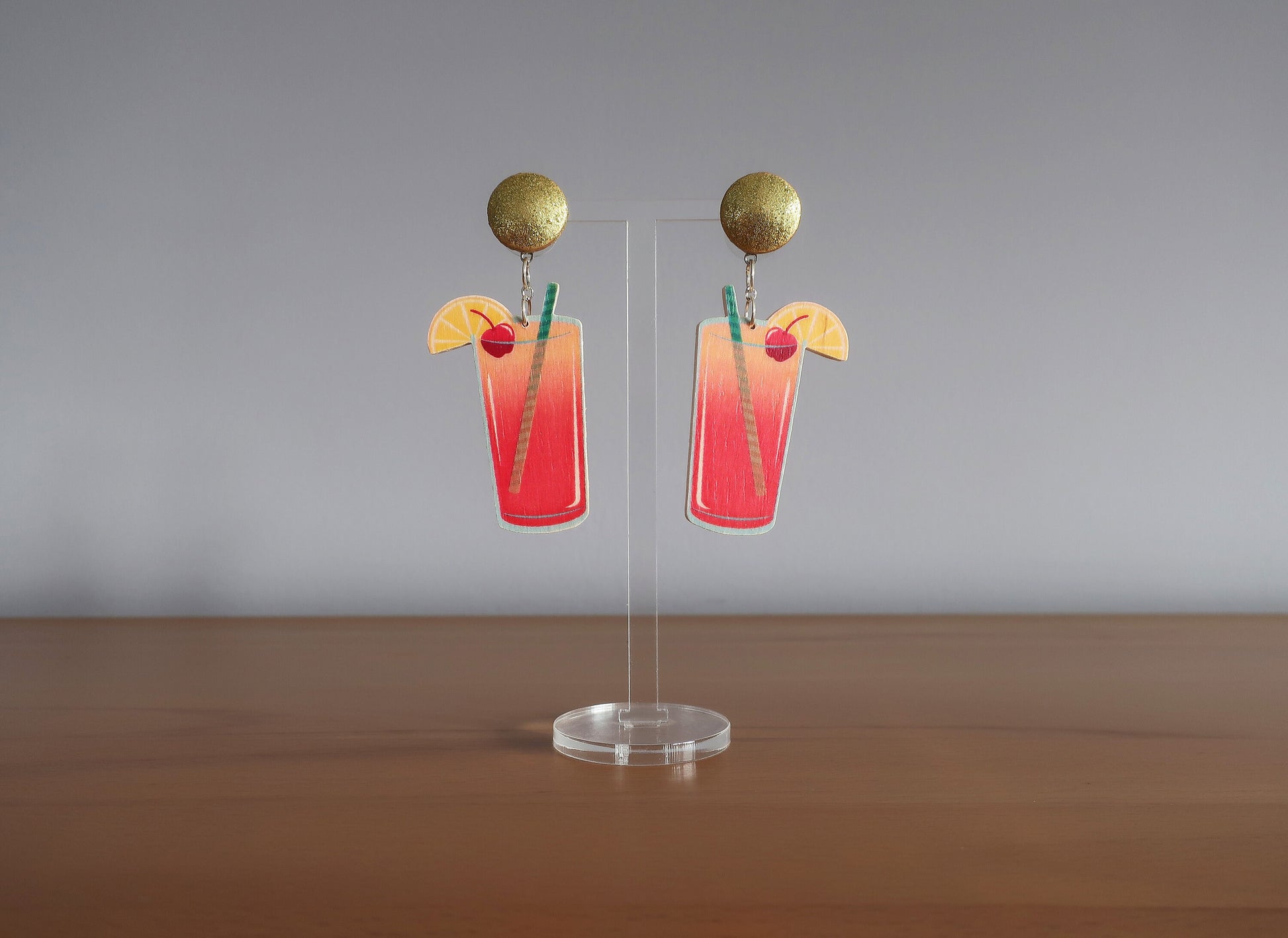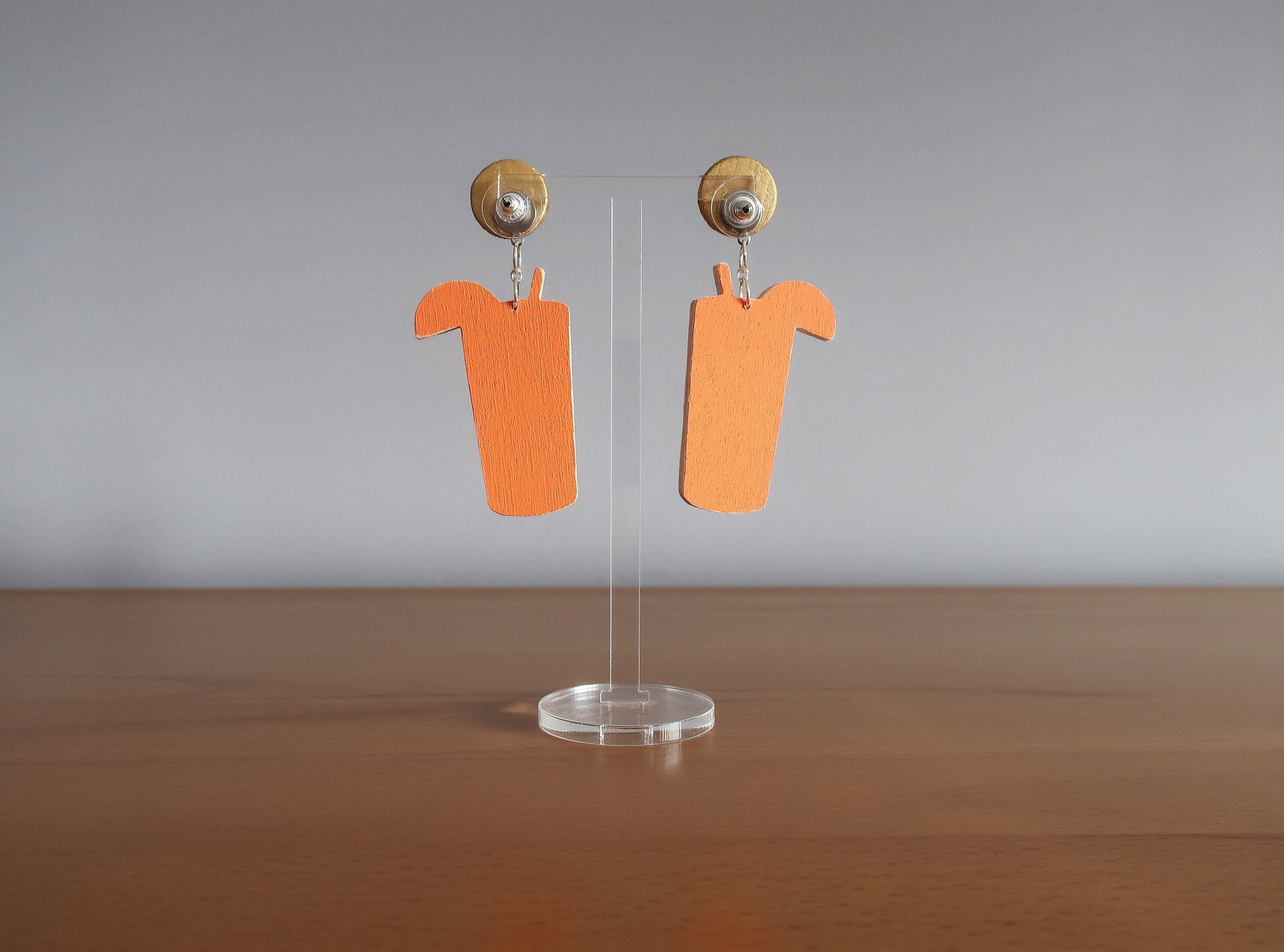 Für diese Ohrringe habe ich eine Zeichnung am Computer erstellt, die ich anschließend manuell auf Birkenholz übertragen und dann mit einer Dekupiersäge ausgesägt habe. Um die Haltbarkeit zu verbessern wurde eine Schicht matter Lack aufgetragen.