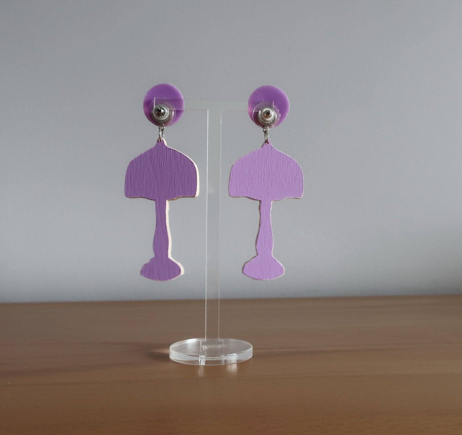 Für diese Ohrringe habe ich eine Zeichnung am Computer erstellt, die ich anschließend manuell auf Birkenholz übertragen und dann mit einer Dekupiersäge ausgesägt habe. Um die Haltbarkeit zu verbessern wurde eine Schicht matter Lack aufgetragen.