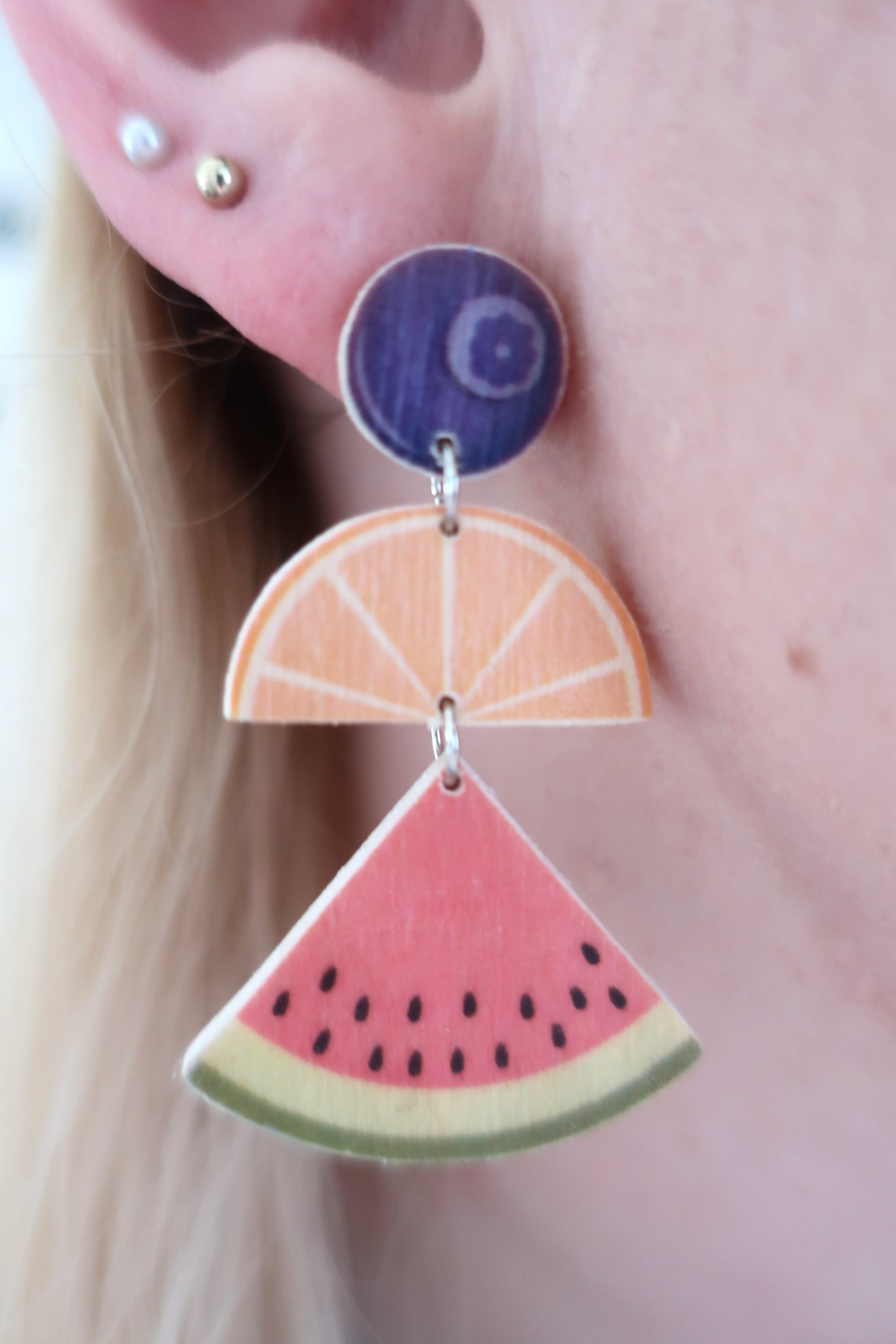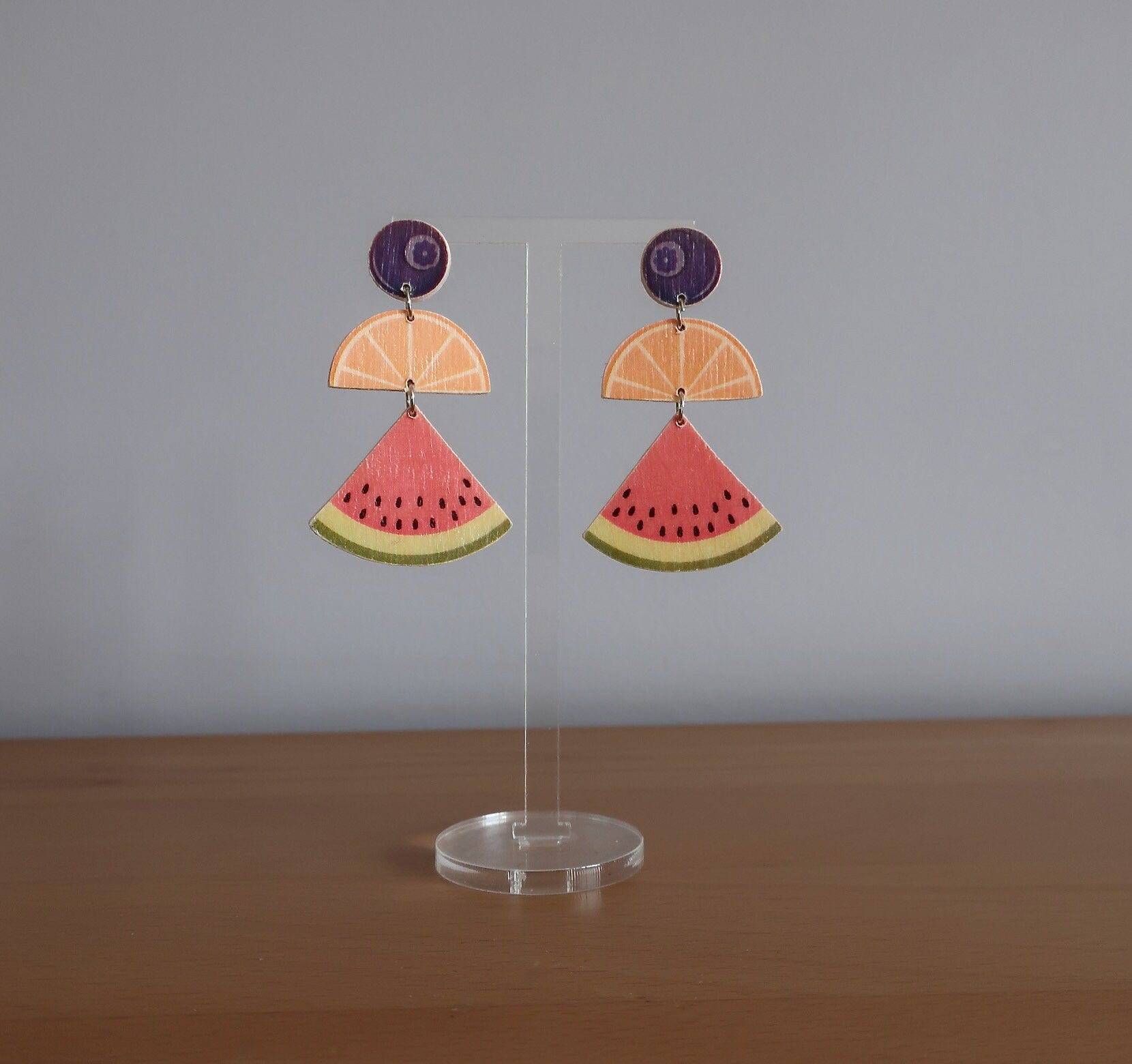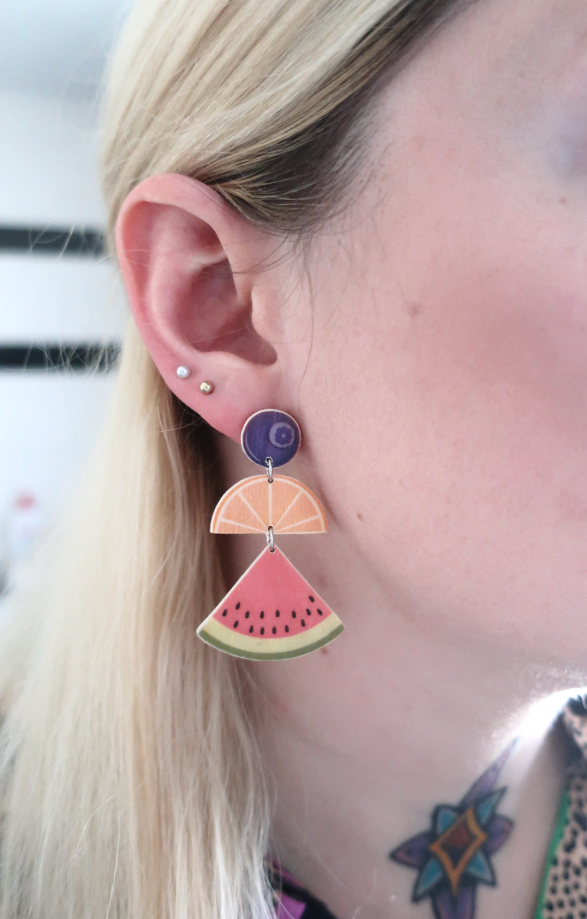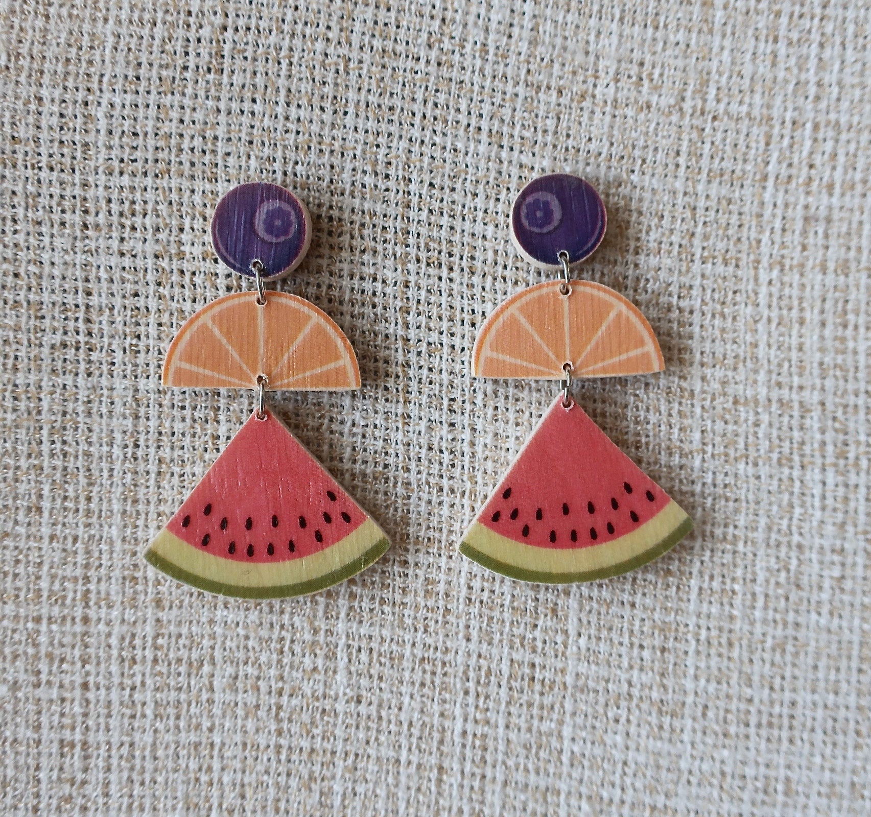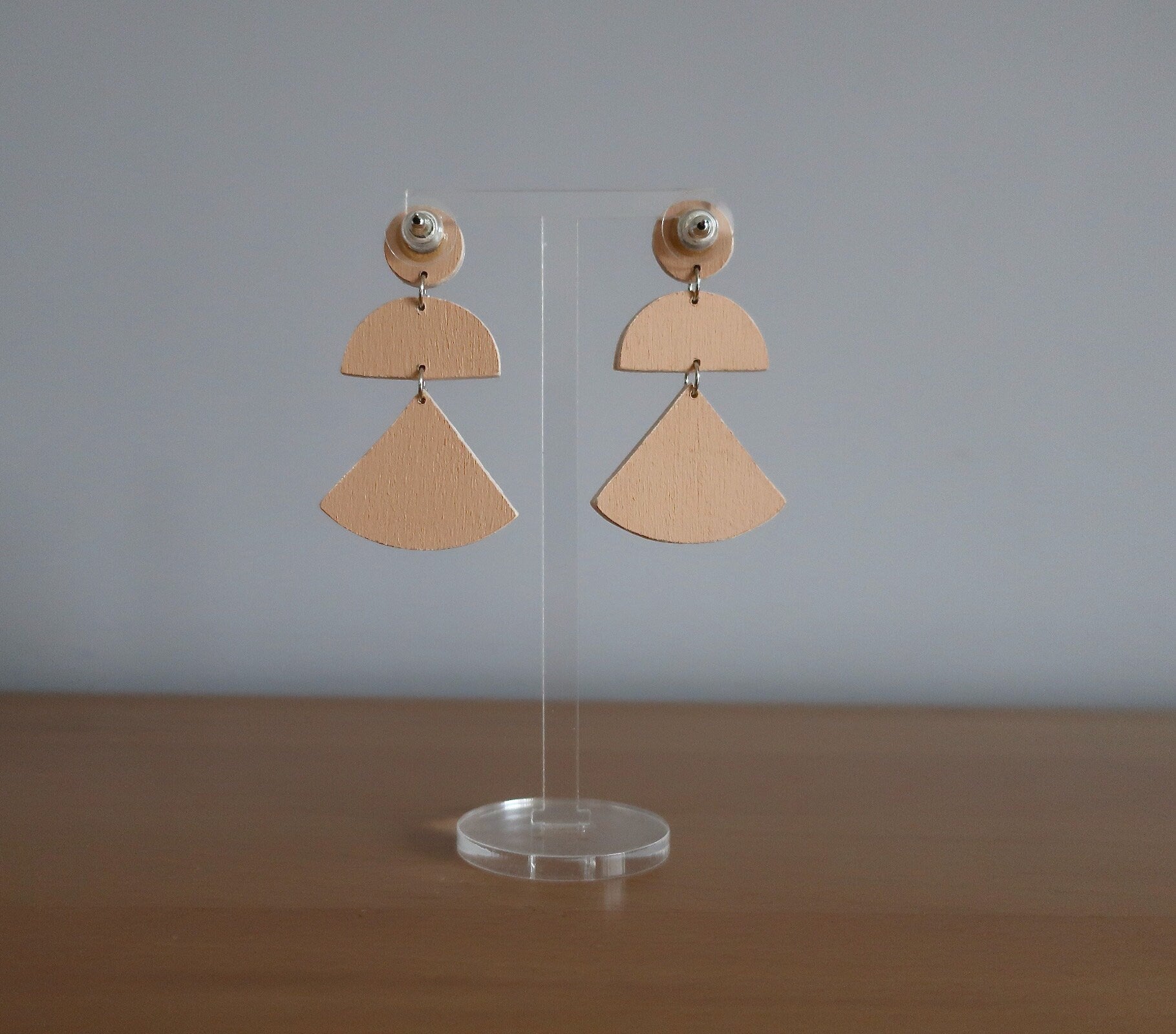 Für diese Ohrringe habe ich eine Zeichnung am Computer erstellt, die ich anschließend manuell auf Birkenholz übertragen und dann mit einer Dekupiersäge ausgesägt habe. Um die Haltbarkeit zu verbessern wurde eine Schicht matter Lack aufgetragen.