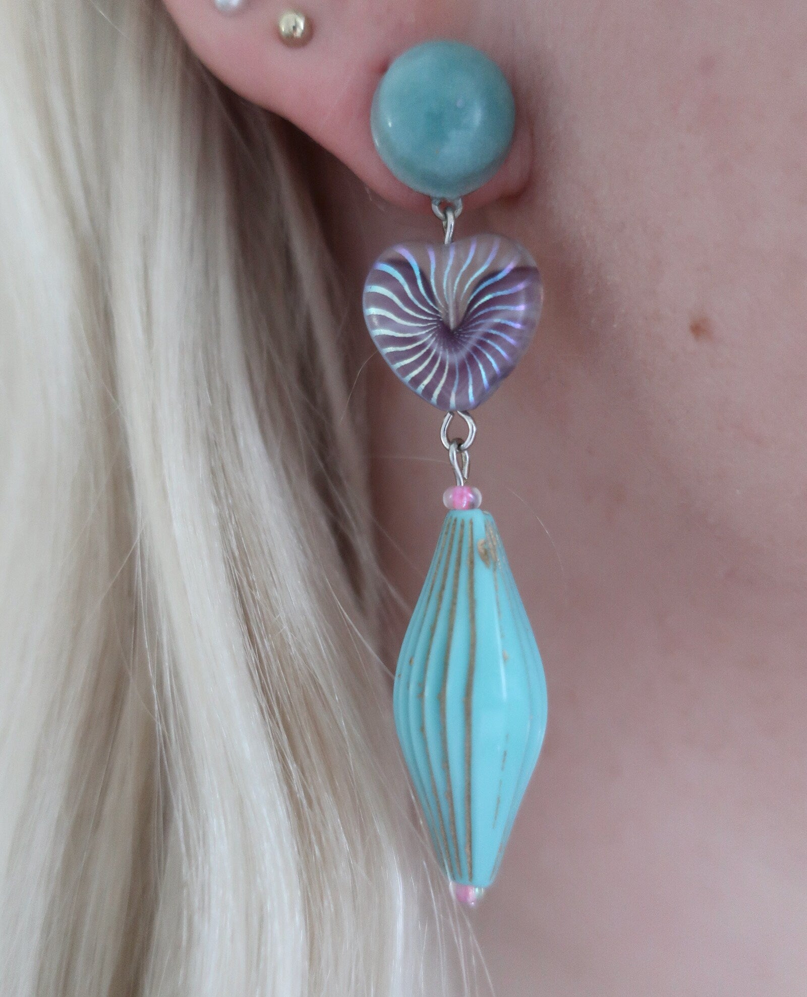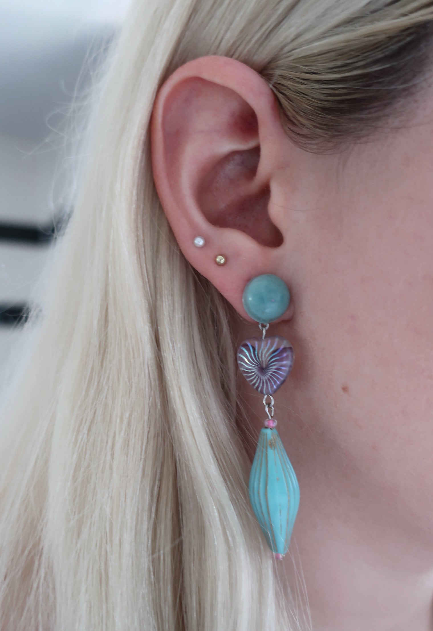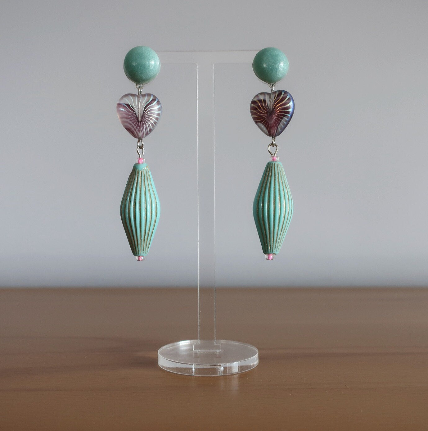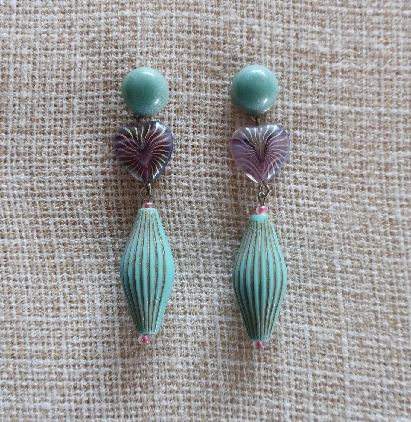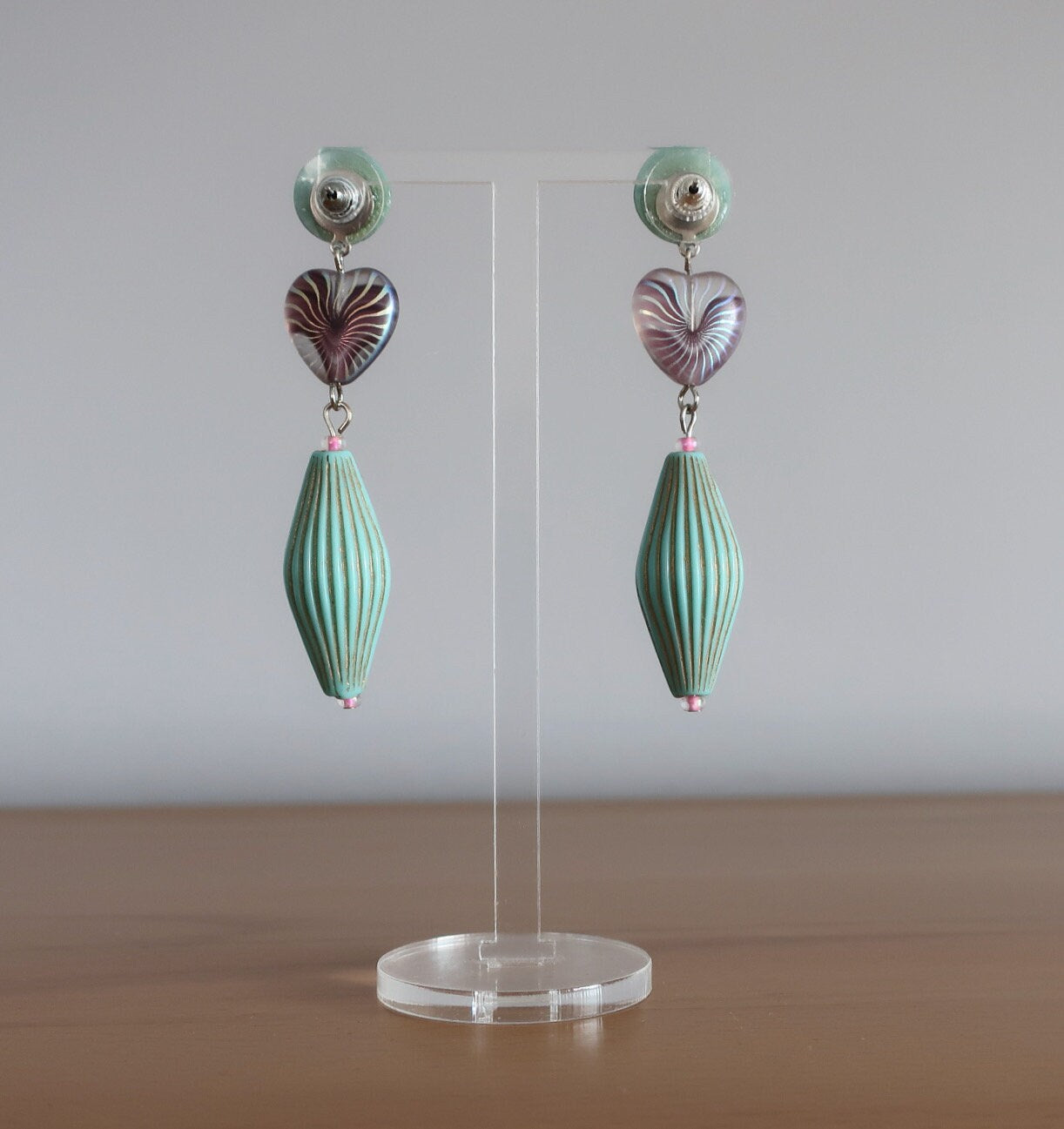 Diese Ohrringe sind mit herzförmigen tschechischen Glasperlen und türkisfarbenen Plastikperlen gefertigt. Die Stecker habe ich aus gefärbtem Harz und Edelstahlsteckern gefertigt.