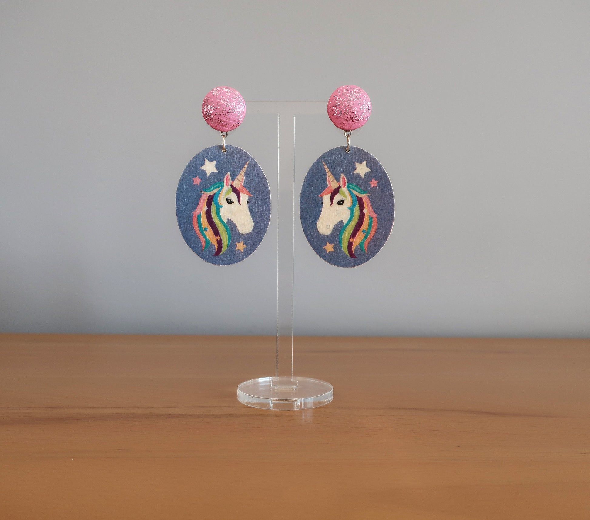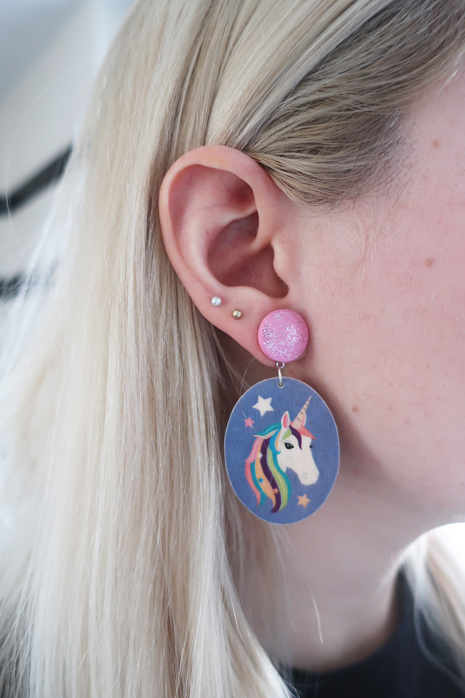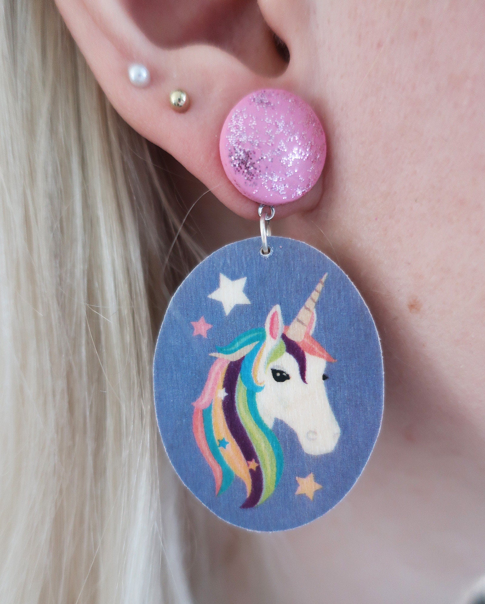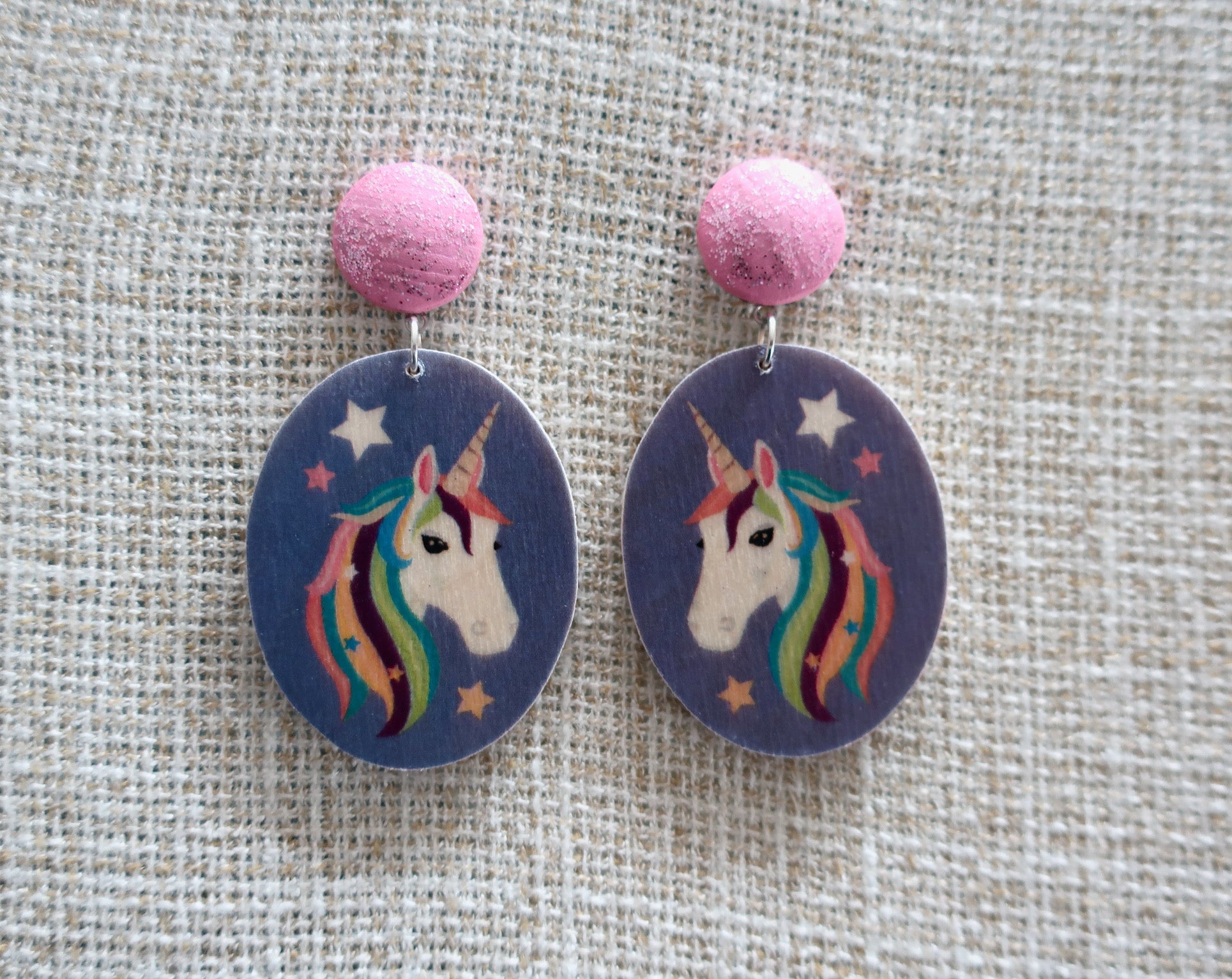 Die Stecker wurden aus mit Acrylfarbe bemalten Holzcabochons und Edelstahlsteckern gefertigt.