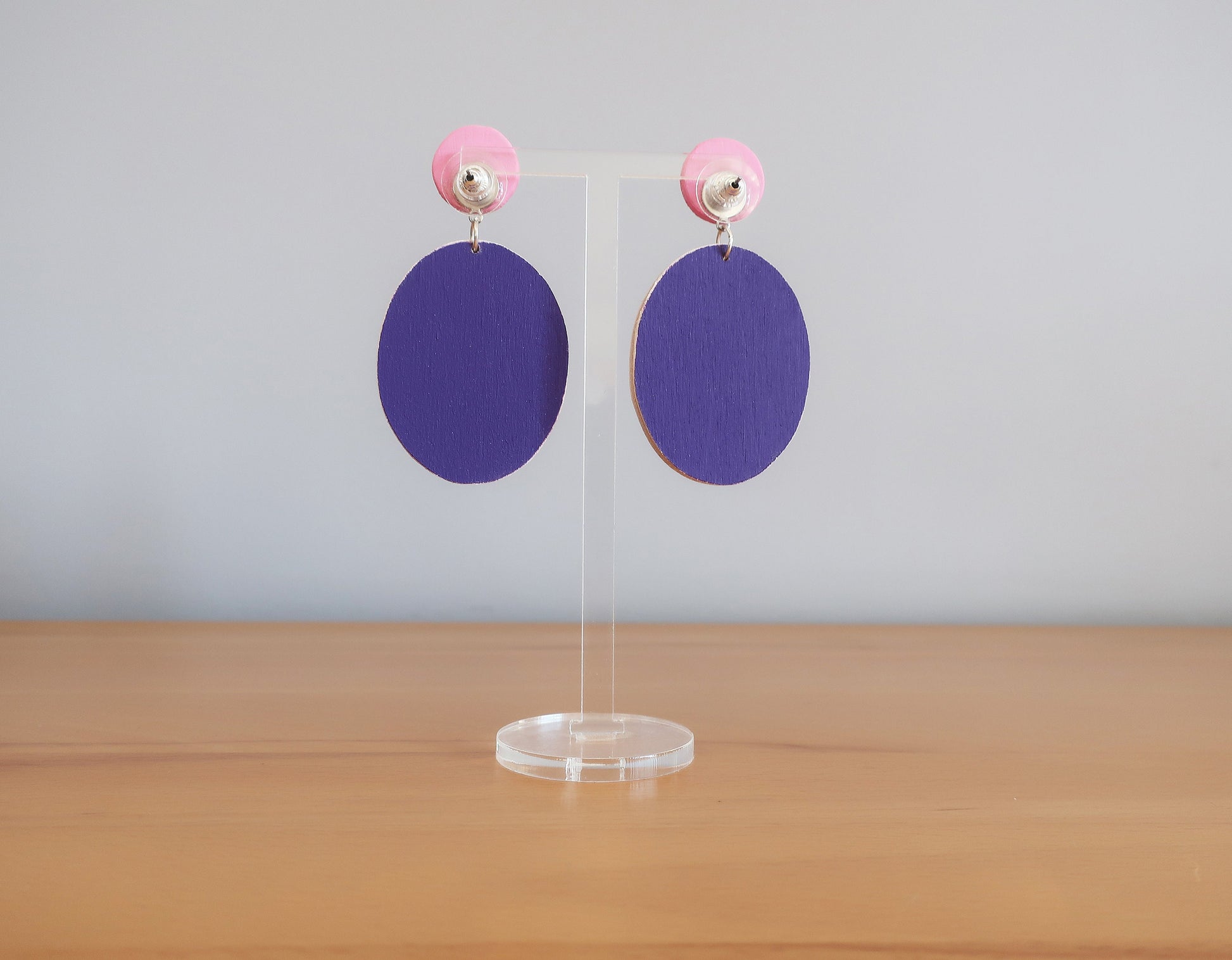Für diese Ohrringe habe ich eine Zeichnung am Computer erstellt, die ich anschließend manuell auf Birkenholz übertragen und dann mit einer Dekupiersäge ausgesägt habe. Um die Haltbarkeit zu verbessern wurde eine Schicht matter Lack aufgetragen.