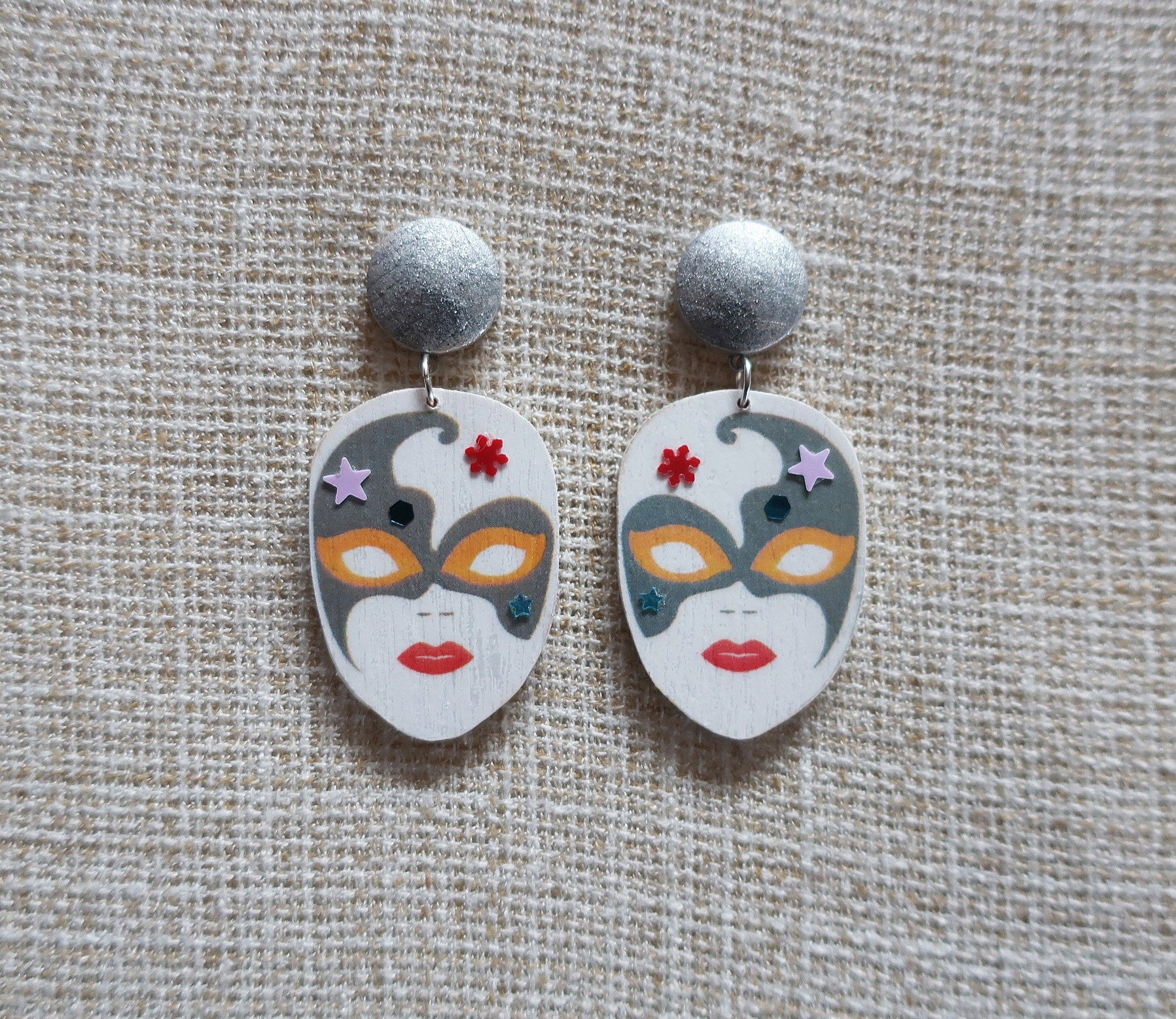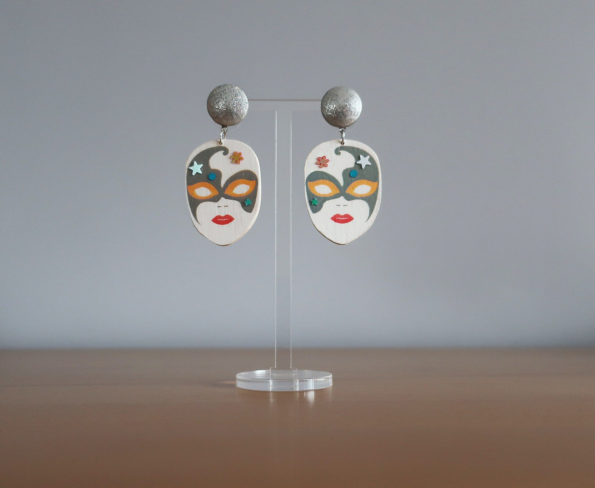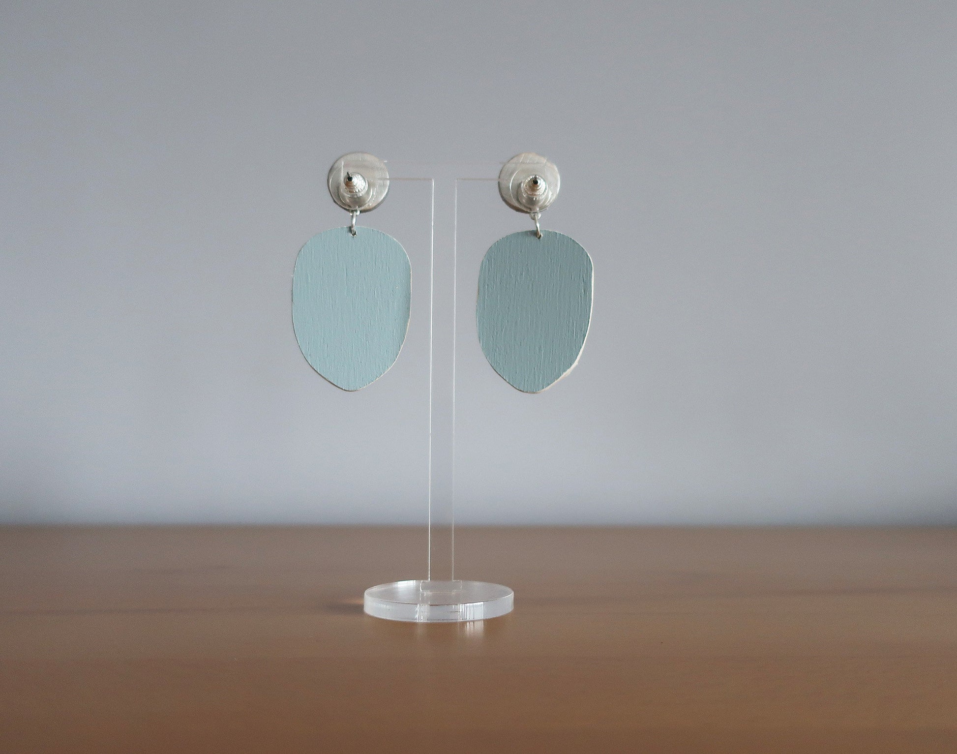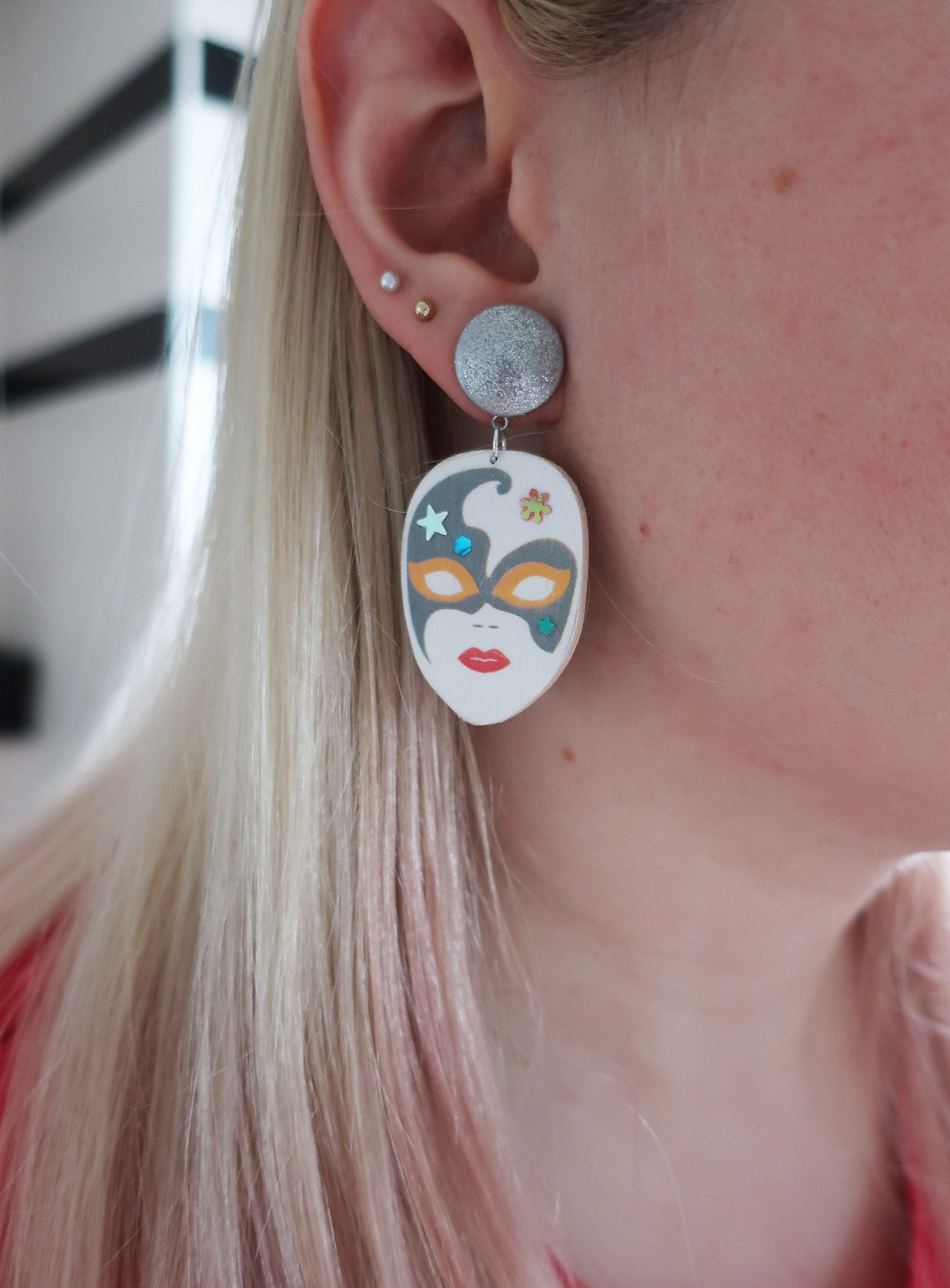 Für diese Ohrringe habe ich eine Zeichnung am Computer erstellt, die ich anschließend manuell auf Birkenholz übertragen und dann mit einer Dekupiersäge ausgesägt habe. Um die Haltbarkeit zu verbessern wurde eine Schicht matter Lack aufgetragen.