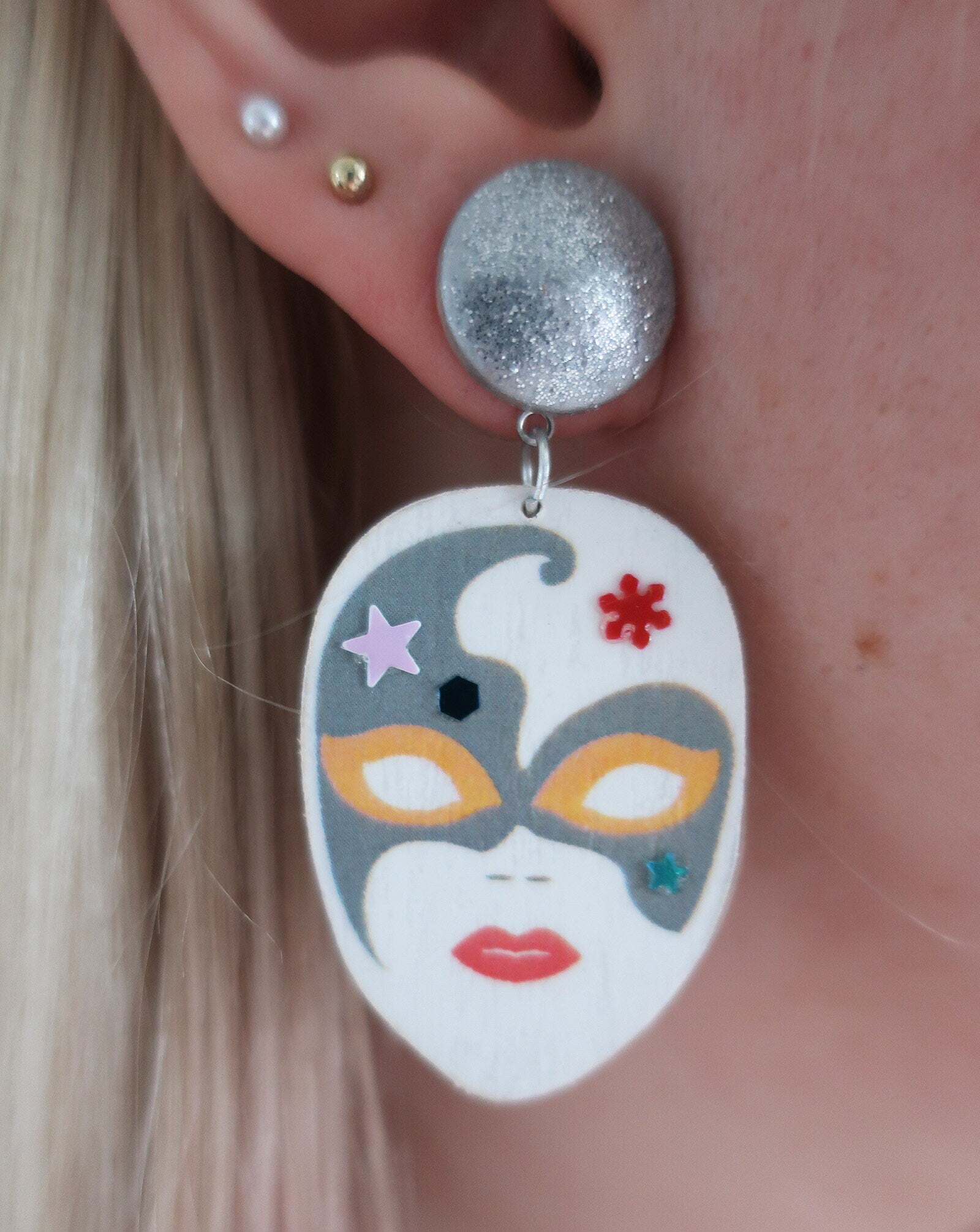 Die Stecker wurden aus mit silberner Glitzerfarbe bemalten Holzcabochons und Edelstahlsteckern gefertigt.