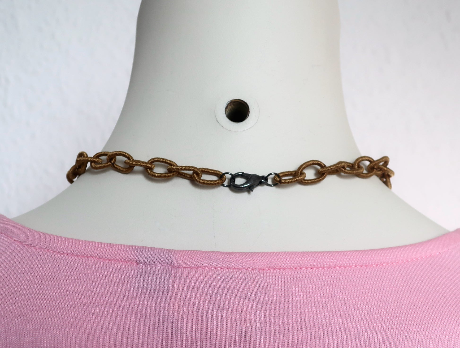 Die braune Textilkette ist ungefähr 43 cm lang und hat einen Karabinerverschluss. Die komplette Kettenlänge (mitsamt Verschluss) beträgt ungefähr 45 cm.