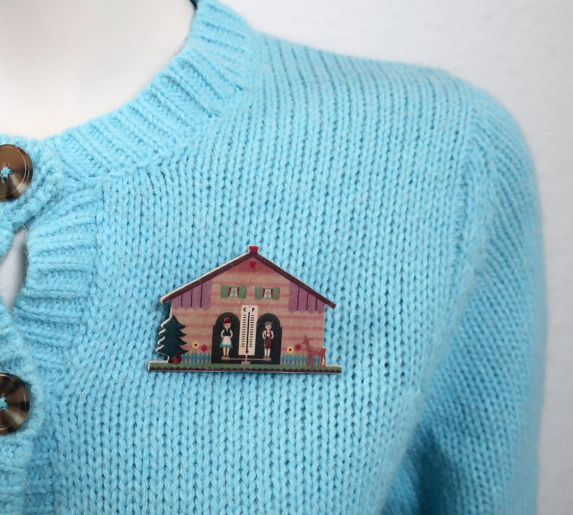 Für diese Brosche habe ich eine Zeichnung am Computer erstellt, die ich anschließend manuell auf Birkenholz übertragen und dann mit einer Dekupiersäge ausgesägt habe. Um die Haltbarkeit zu verbessern wurde eine Schicht matter Lack aufgetragen.