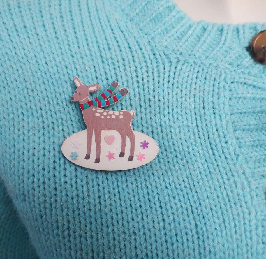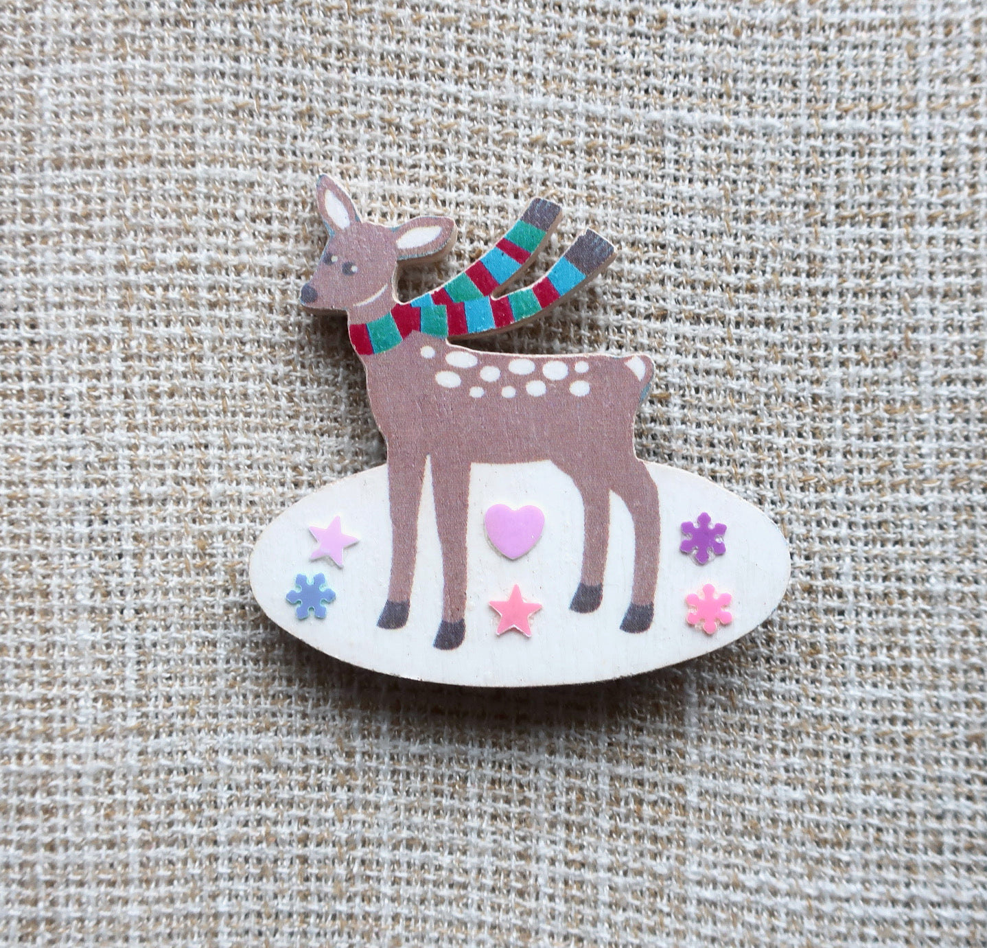 Materialien: Birkensperrholz, Pailletten, Anstecknadel